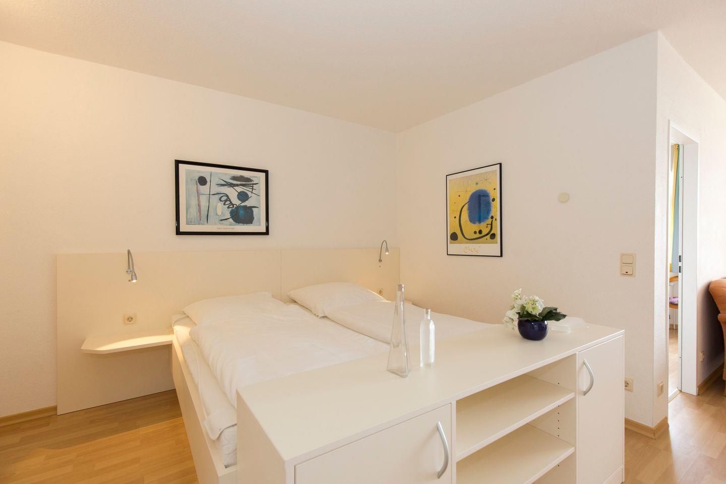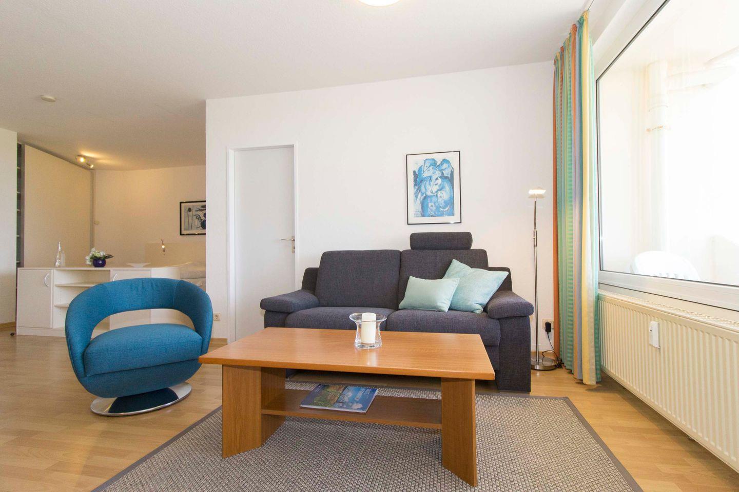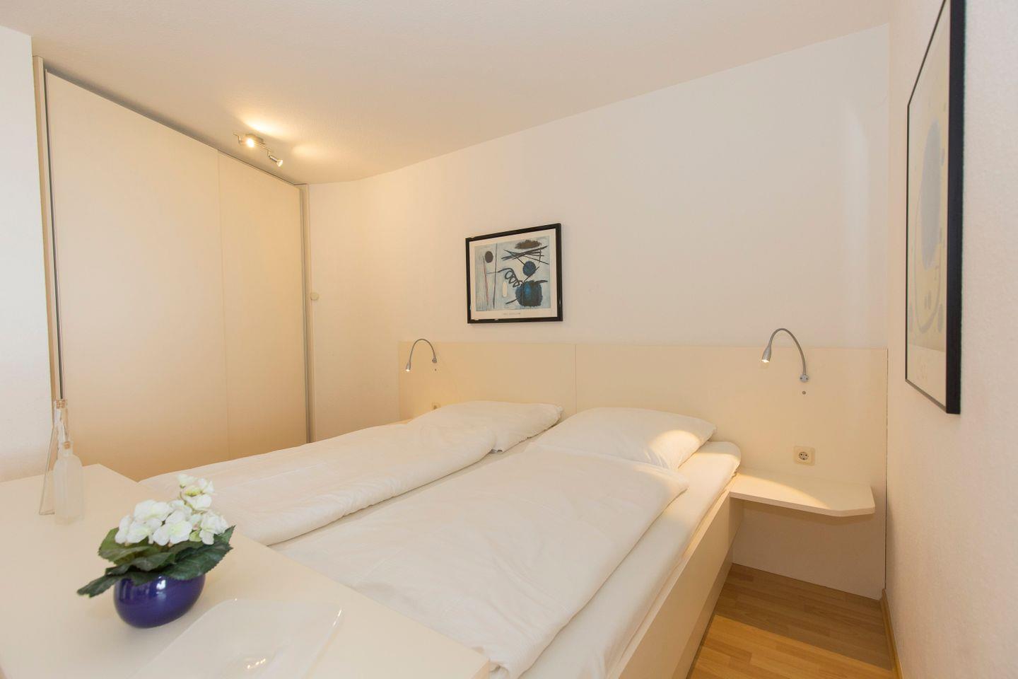 Haus "Trafalgar", Typ C, Appartement-Nr. 323, bis 4 Personen, 3.Etage, ca. 55 qm, Westseite (Meerblick), Wohn/Schlafraum mit Doppelbett, separates Schlafzimmer mit zwei Einzelbetten, Küchenzeile mit Mikrowelle, 4-Platten-Ceranfeld, Geschirrspüler, Dusche/WC, Balkon, Kabel-TV, WLAN im App., Tiefgaragenstellplatz, Nichtraucherappartement, keine Haustiere erlaubt, Strandkorb im Sommer 2026.