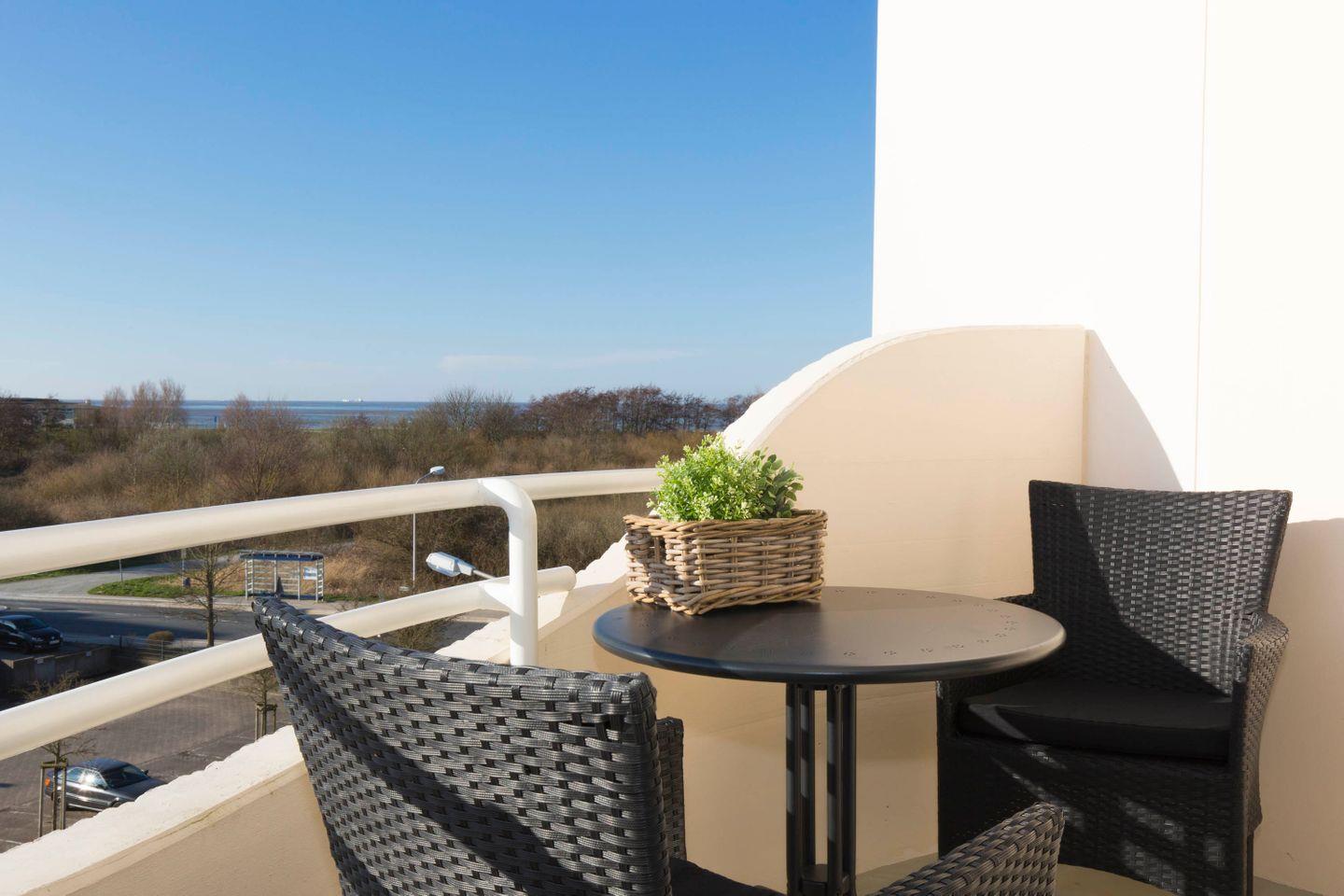 Auf dem Balkon finden Sie zwei schwarze, gemütliche Korbsesseln, 2 weitere weiße Stühlen und ein Tisch. Mit Blick auf das Wattenmeer ist der Balkon der perfekte Ort unter freiem Himmel, um den Nordsee Urlaub zu genießen.