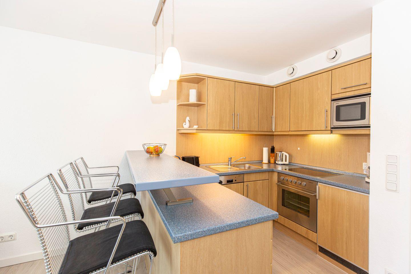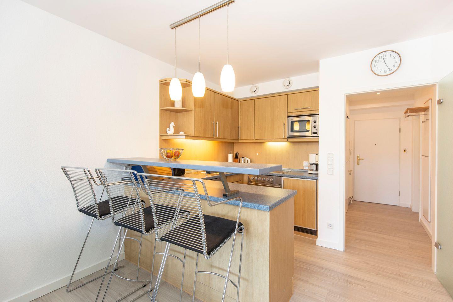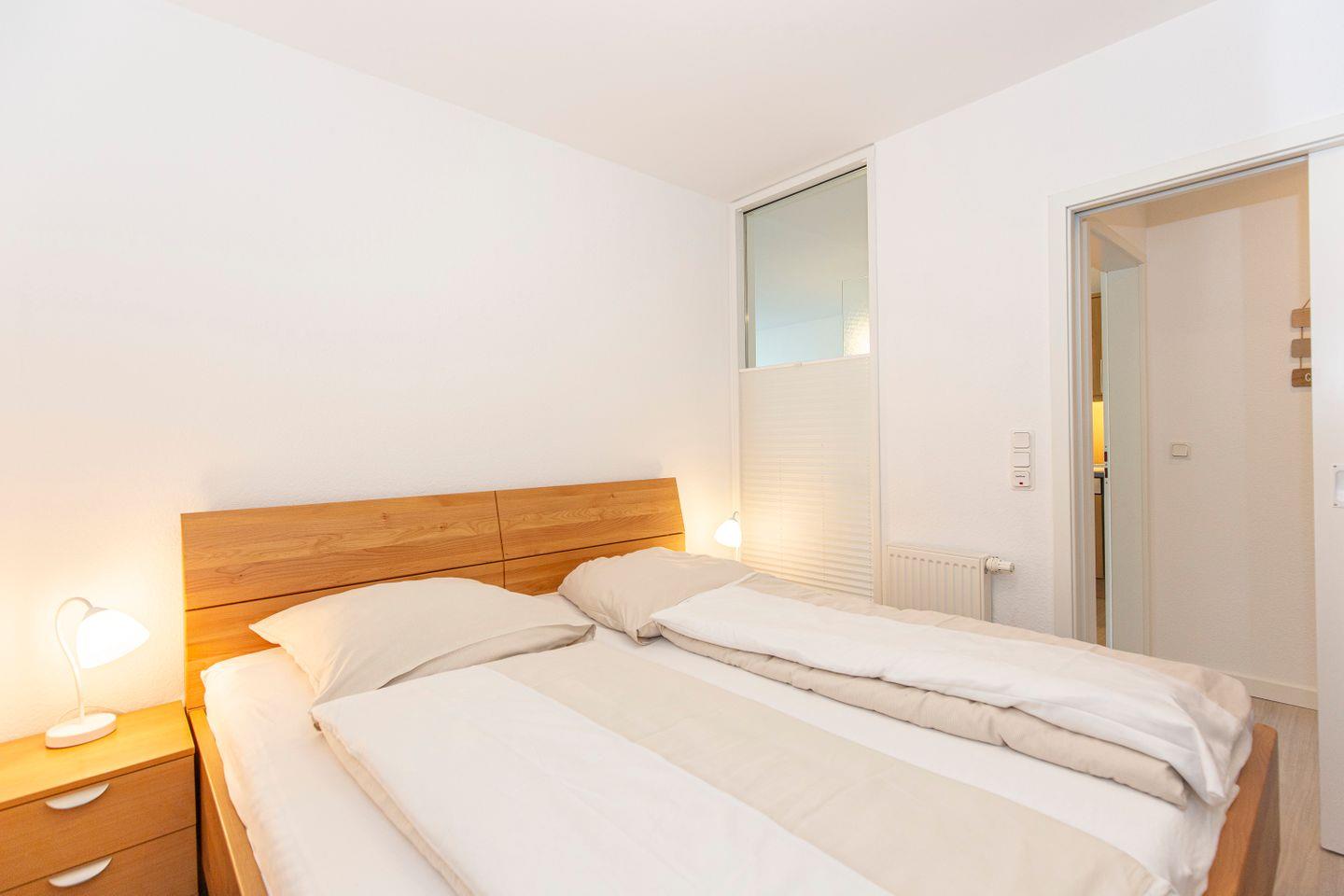 Haus "Kurpark-Residenz", Typ B, App.-Nr. "143", bis 3 Pers., 1. OG, Nord/Westseite (Richtung "Neuwerk"), ca. 47 m² Größe, Wohnzimmer mit Schlafcouch, sep. Schlafzimmer mit Doppelbett (innenliegend), Dusche/WC, Küchenzeile mit Mikrowelle, Backofen und Geschirrspüler, SAT-TV, WLAN im App., Tiefgaragenstellplatz, ohne Loggia, Haustiere sind nicht gestattet, Nichtraucherappartement, Strandkorb im Sommer 2026.