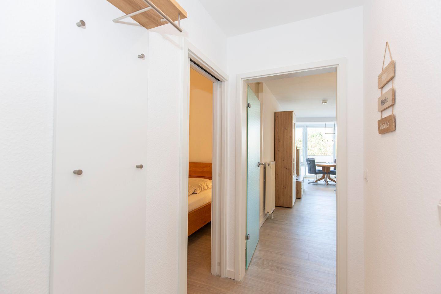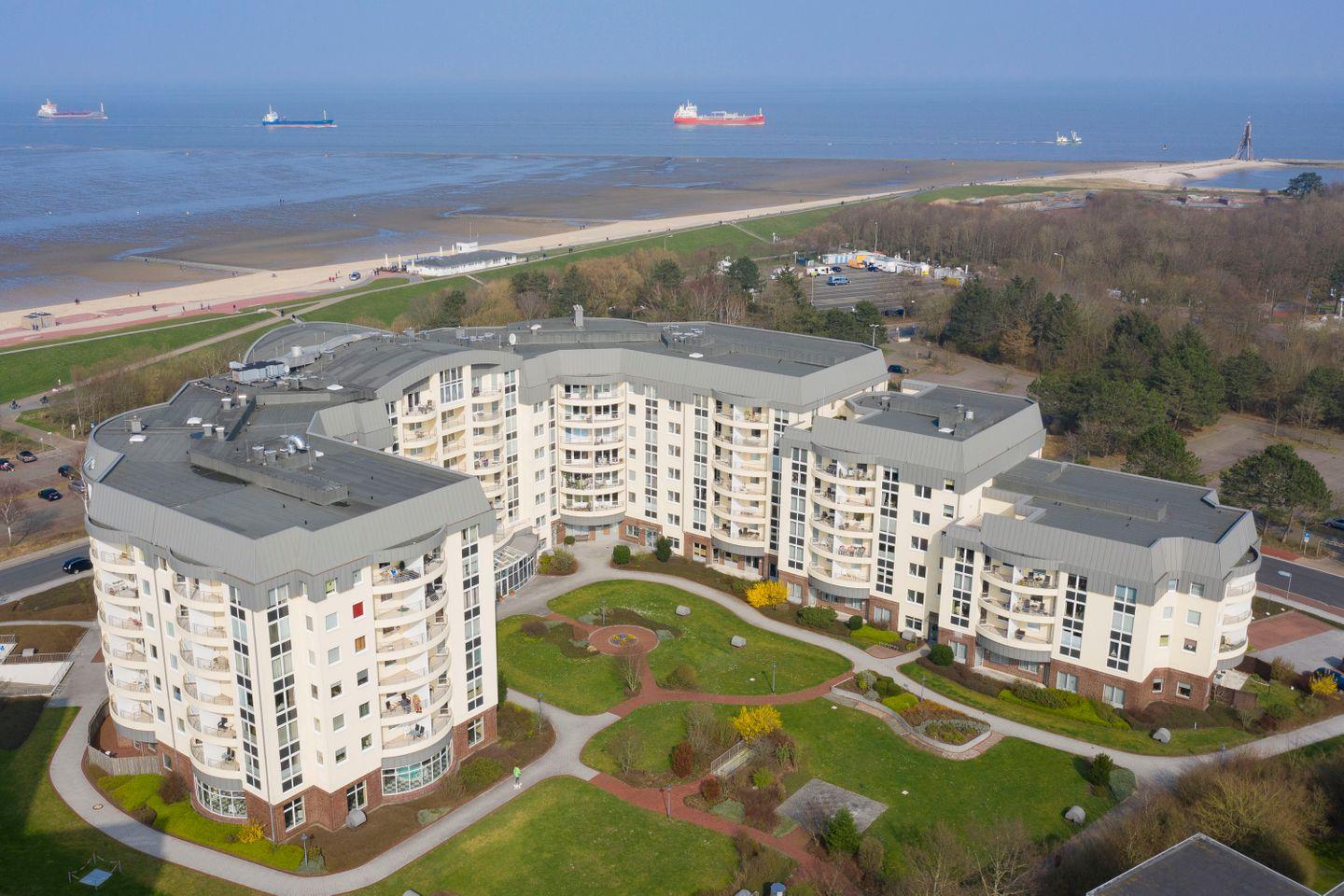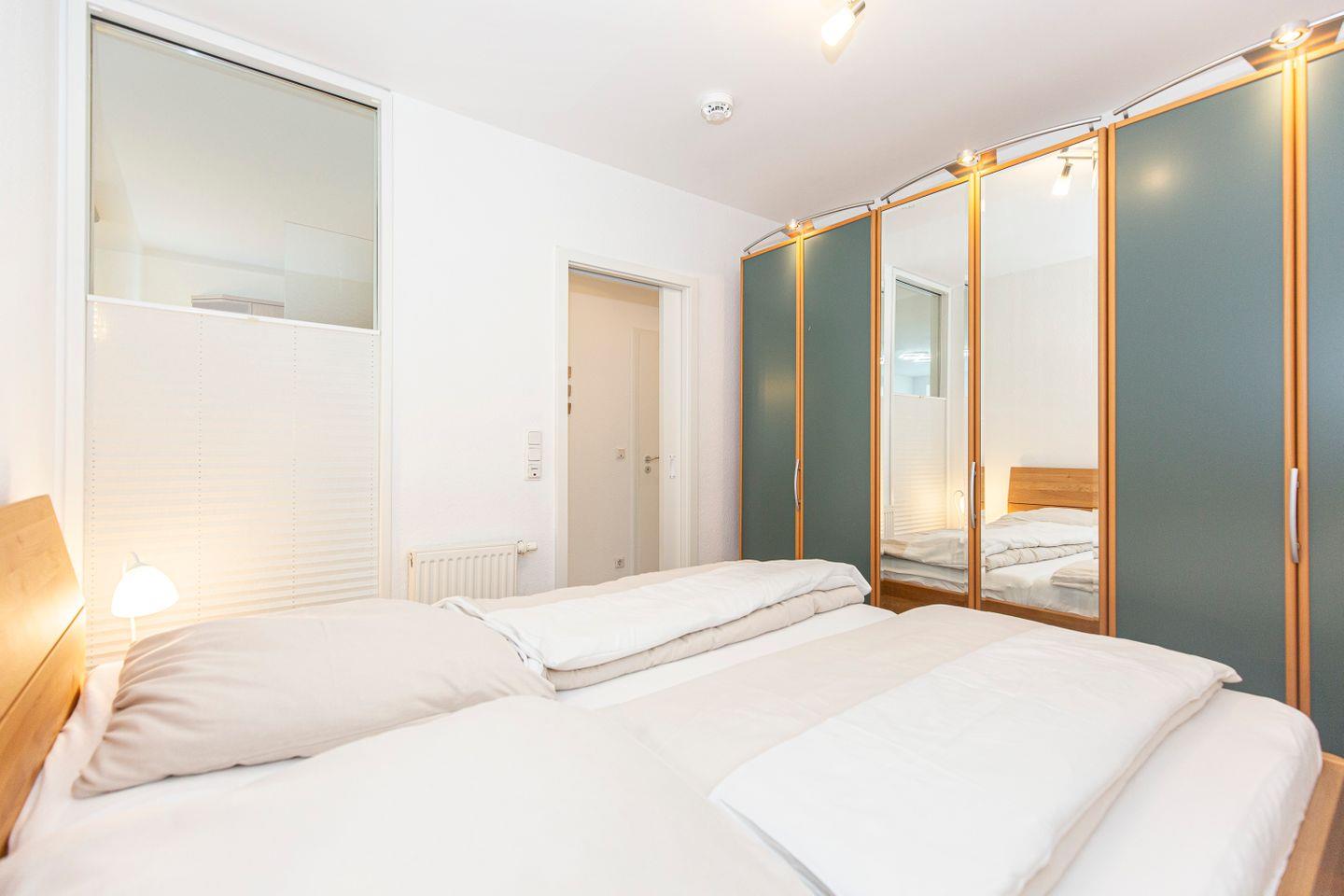 Haus "Kurpark-Residenz", Typ B, App.-Nr. "143", bis 3 Pers., 1. OG, Nord/Westseite (Richtung "Neuwerk"), ca. 47 m² Größe, Wohnzimmer mit Schlafcouch, sep. Schlafzimmer mit Doppelbett (innenliegend), Dusche/WC, Küchenzeile mit Mikrowelle, Backofen und Geschirrspüler, SAT-TV, WLAN im App., Tiefgaragenstellplatz, ohne Loggia, Haustiere sind nicht gestattet, Nichtraucherappartement, Strandkorb im Sommer 2026.