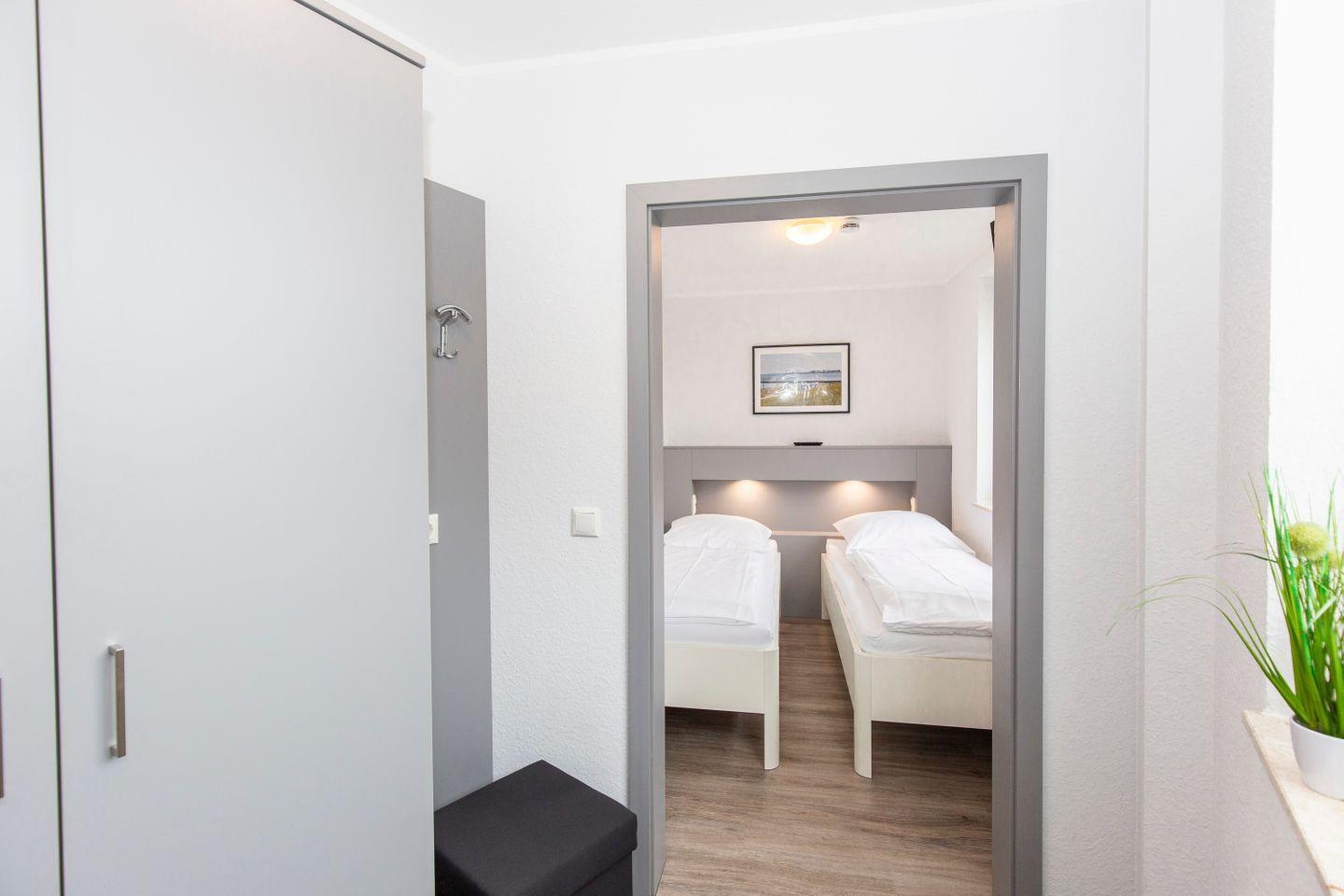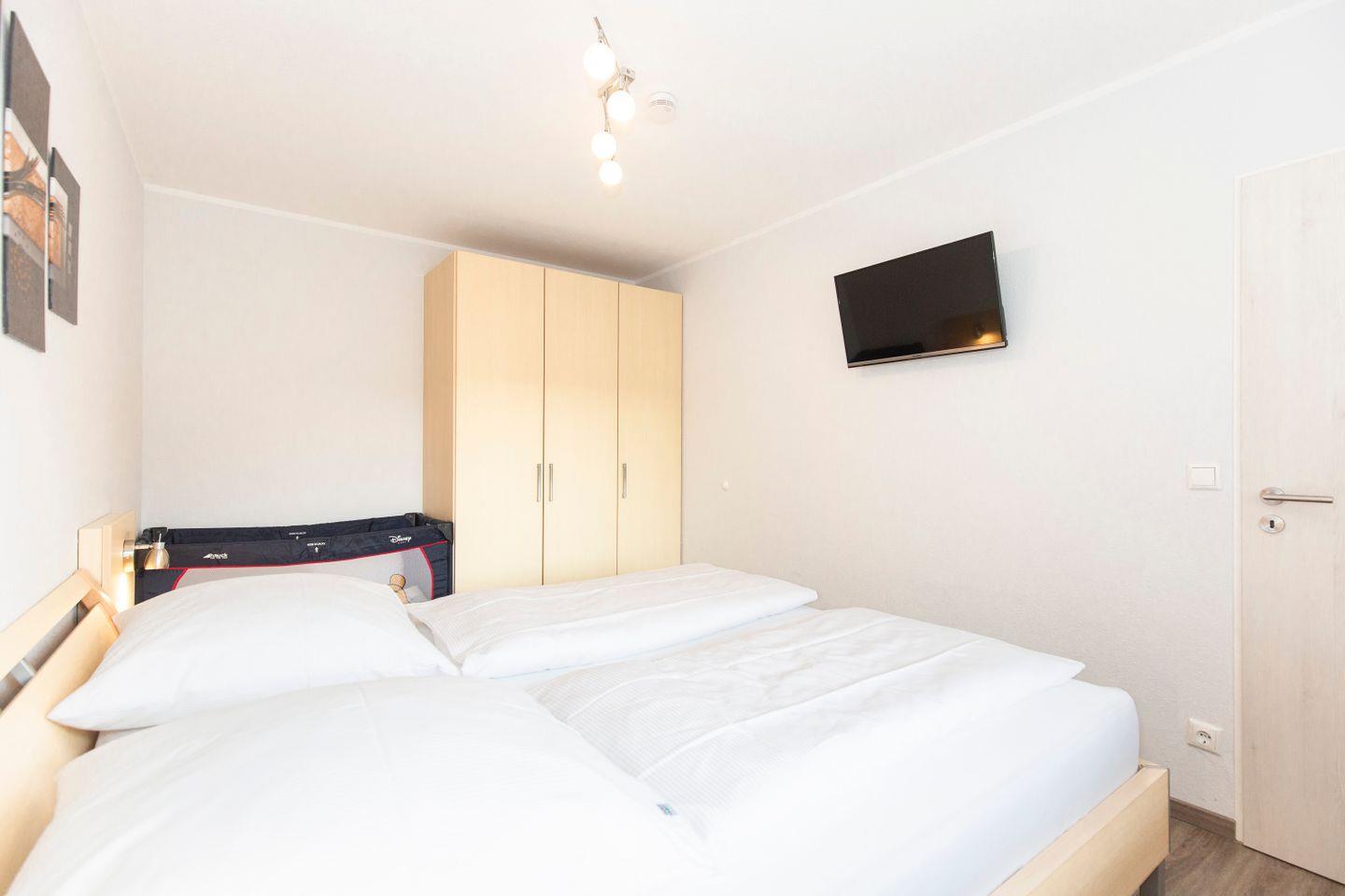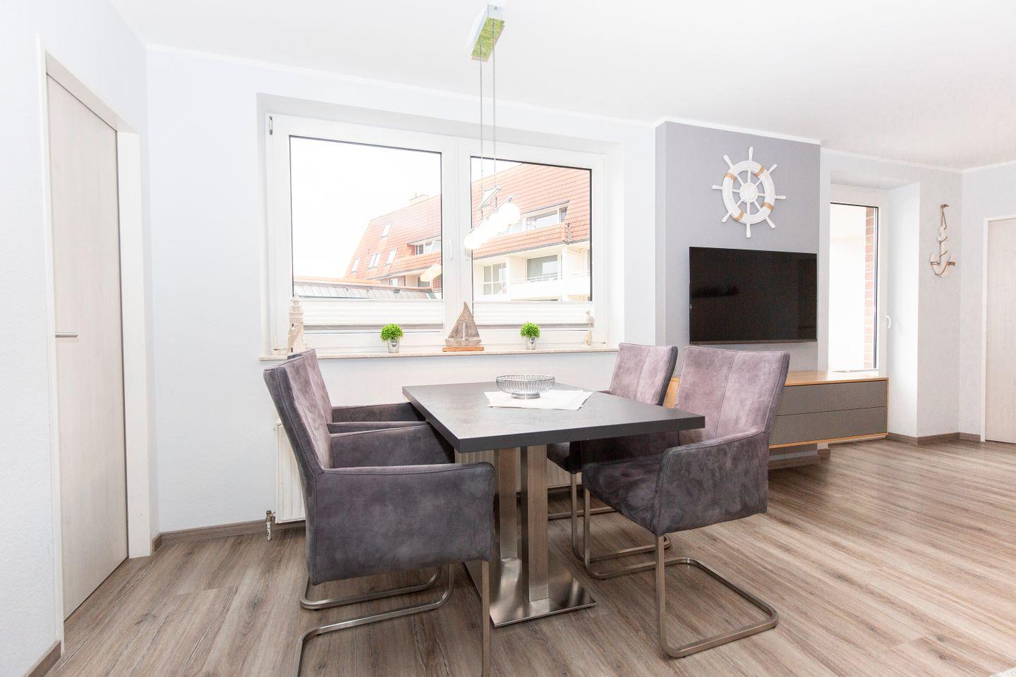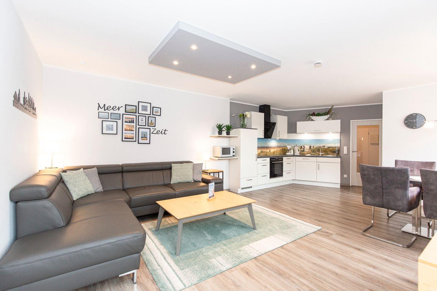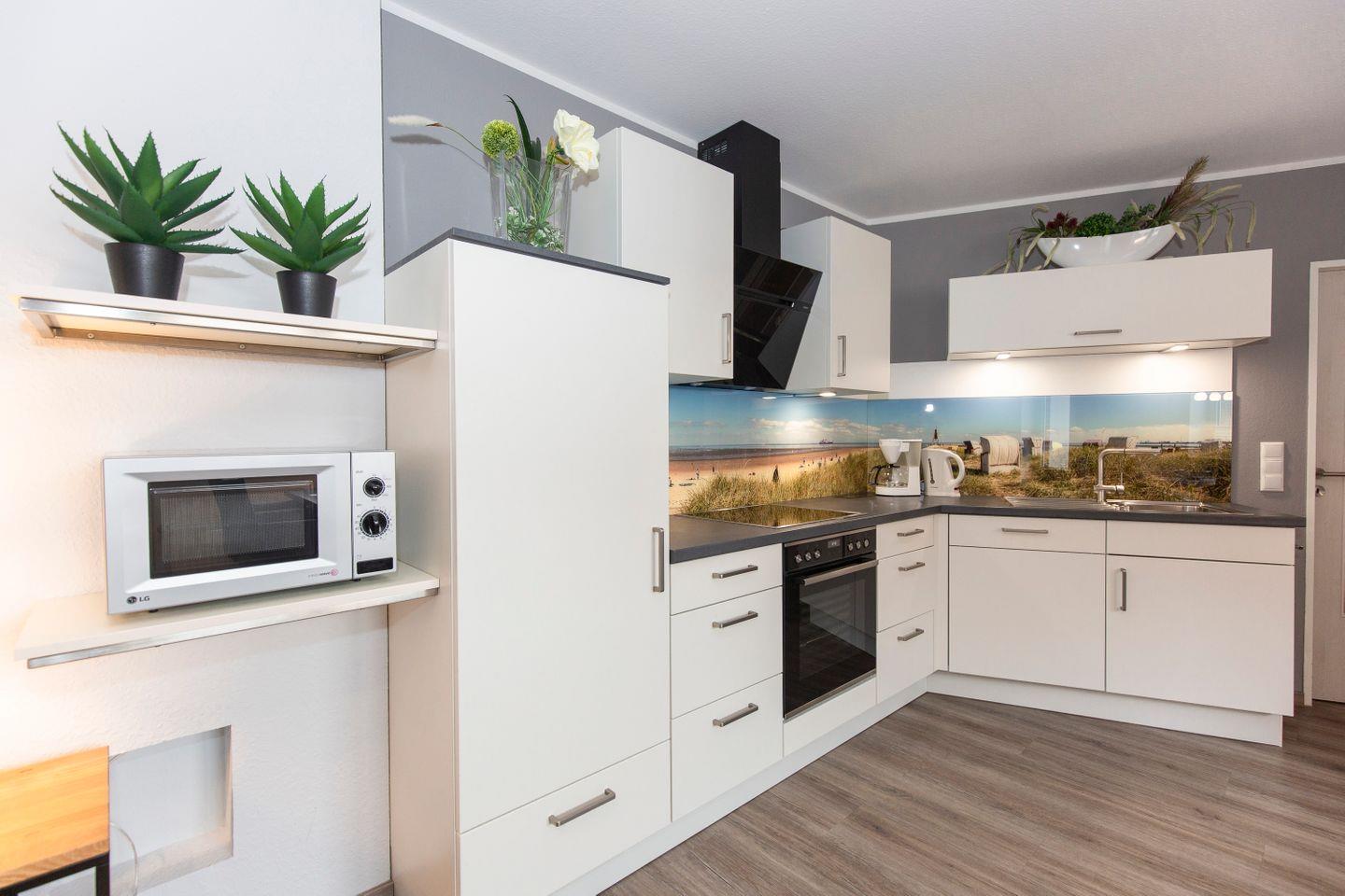 Haus "Lord Nelson", Typ 6, Appartement-Nr. "210", bis 4 Personen, 2. Etage, ca. 66 qm Größe, Südseite (ohne Meerblick, Richtung Trafalgar), Schlafzimmer mit Doppelbett, 2. Schlafzimmer mit 2 Einzelbetten, Wohnbereich mit integrierter Küche (Induktion mit 4 Kochfelder, Geschirrspüler und Mikrowelle, Dusche/WC, Balkon (Südseite), Flachbildschirm, kostenl. W-Lan Zugang im App. mit eigenem Router, Stellplatz in der Tiefgarage, Strandkorb im Sommer 2025, Nichtraucherwohnung, Haustiere sind nicht gestattet,