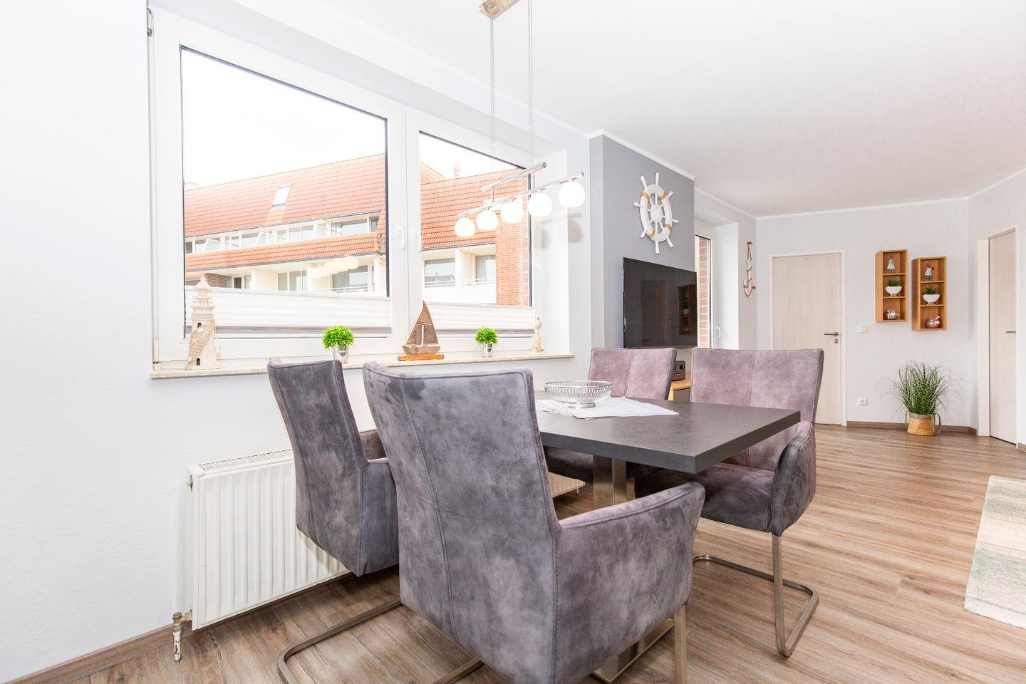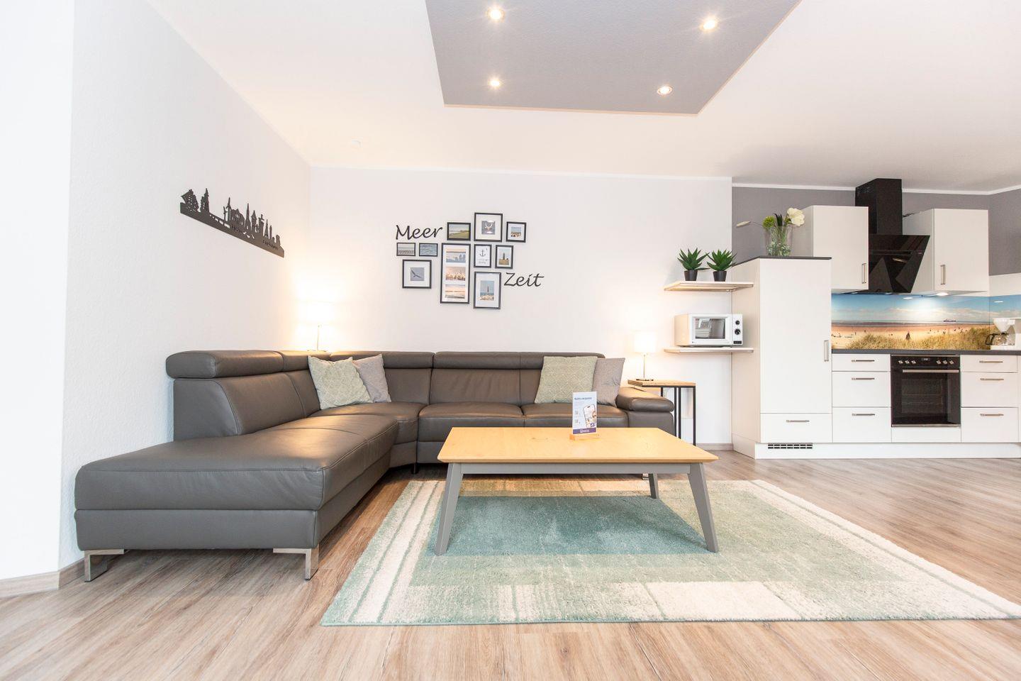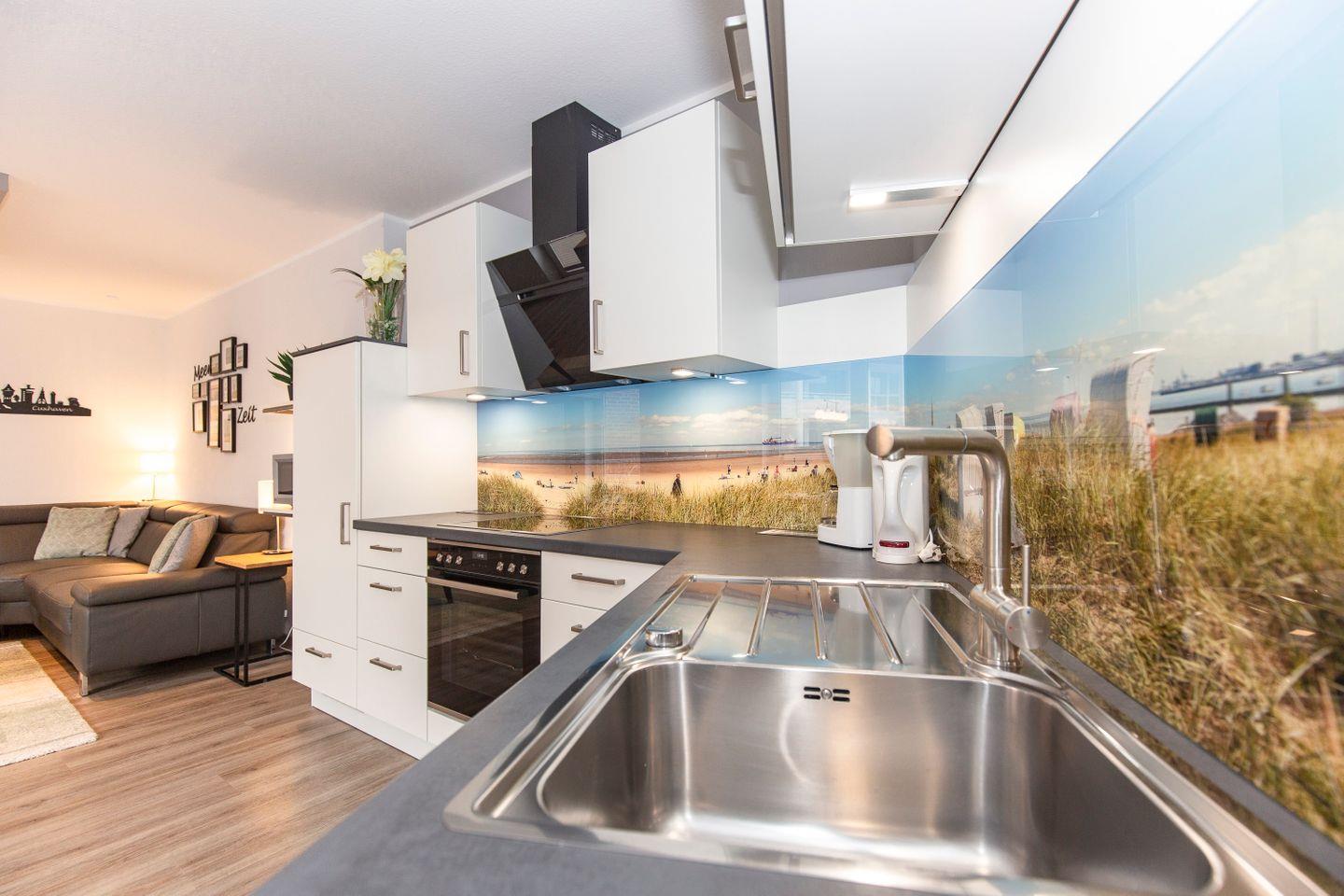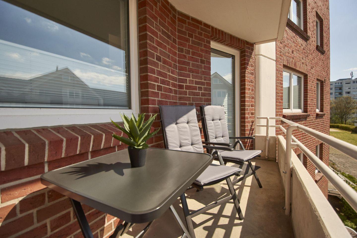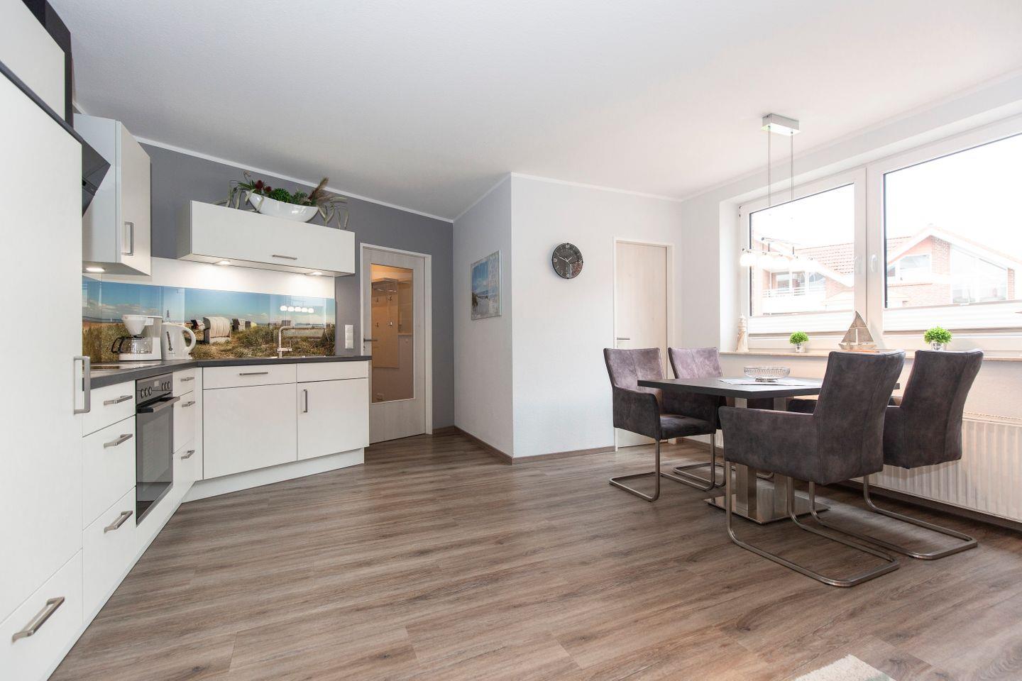 Haus "Lord Nelson", Typ 6, Appartement-Nr. "210", bis 4 Personen, 2. Etage, ca. 66 qm Größe, Südseite (ohne Meerblick, Richtung Trafalgar), Schlafzimmer mit Doppelbett, 2. Schlafzimmer mit 2 Einzelbetten, Wohnbereich mit integrierter Küche (Induktion mit 4 Kochfelder, Geschirrspüler und Mikrowelle, Dusche/WC, Balkon (Südseite), Flachbildschirm, kostenl. W-Lan Zugang im App. mit eigenem Router, Stellplatz in der Tiefgarage, Strandkorb im Sommer 2025, Nichtraucherwohnung, Haustiere sind nicht gestattet,