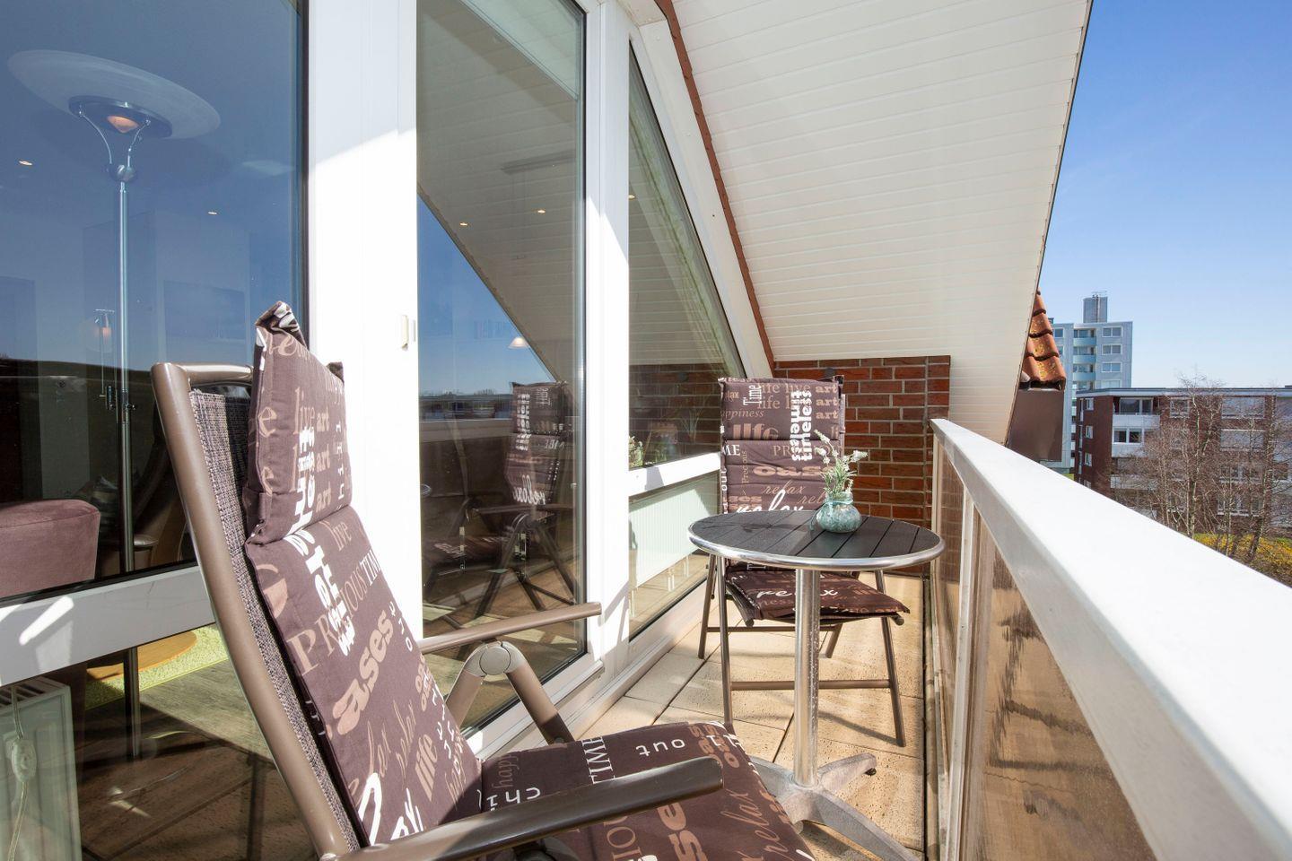 Auf dem großzügigen Balkon der Ferienwohnung starten Urlaubsgäste mit einem Frühstück am Morgen und unter freiem Himmel perfekt in den Tag. Hier genießt man zu jeder Tageszeit die frische Nordseeluft.