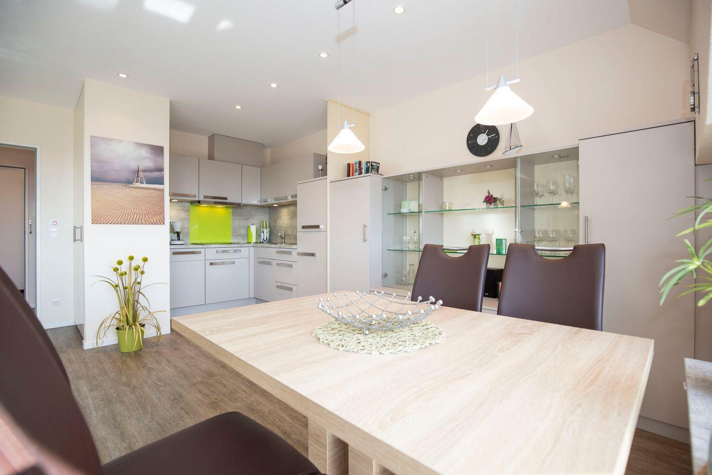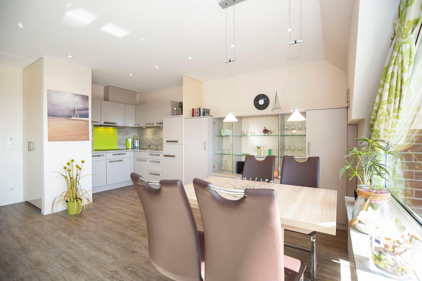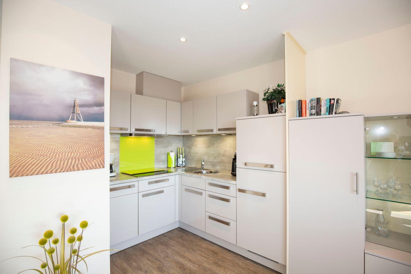 In der 1-Zimmer-Ferienwohnung besticht durch einen modernen Einrichtungsstil. Dekorationselemente in grau, grün und weiß kreieren pure Urlaubsatmosphäre. Dieser Eindruck wird durch die Auswahl der Möbel bestärkt. Die Ferienwohnung bietet Platz für bis zu 2 Urlaubsgäste und ist somit ideal für Paare oder Singles. Hier verbringen unsere Gäste den Nordsee-Urlaub in direkter Strandnähe. Spontanen Strandspaziergängen und Baden im Meer steht nichts im Weg.