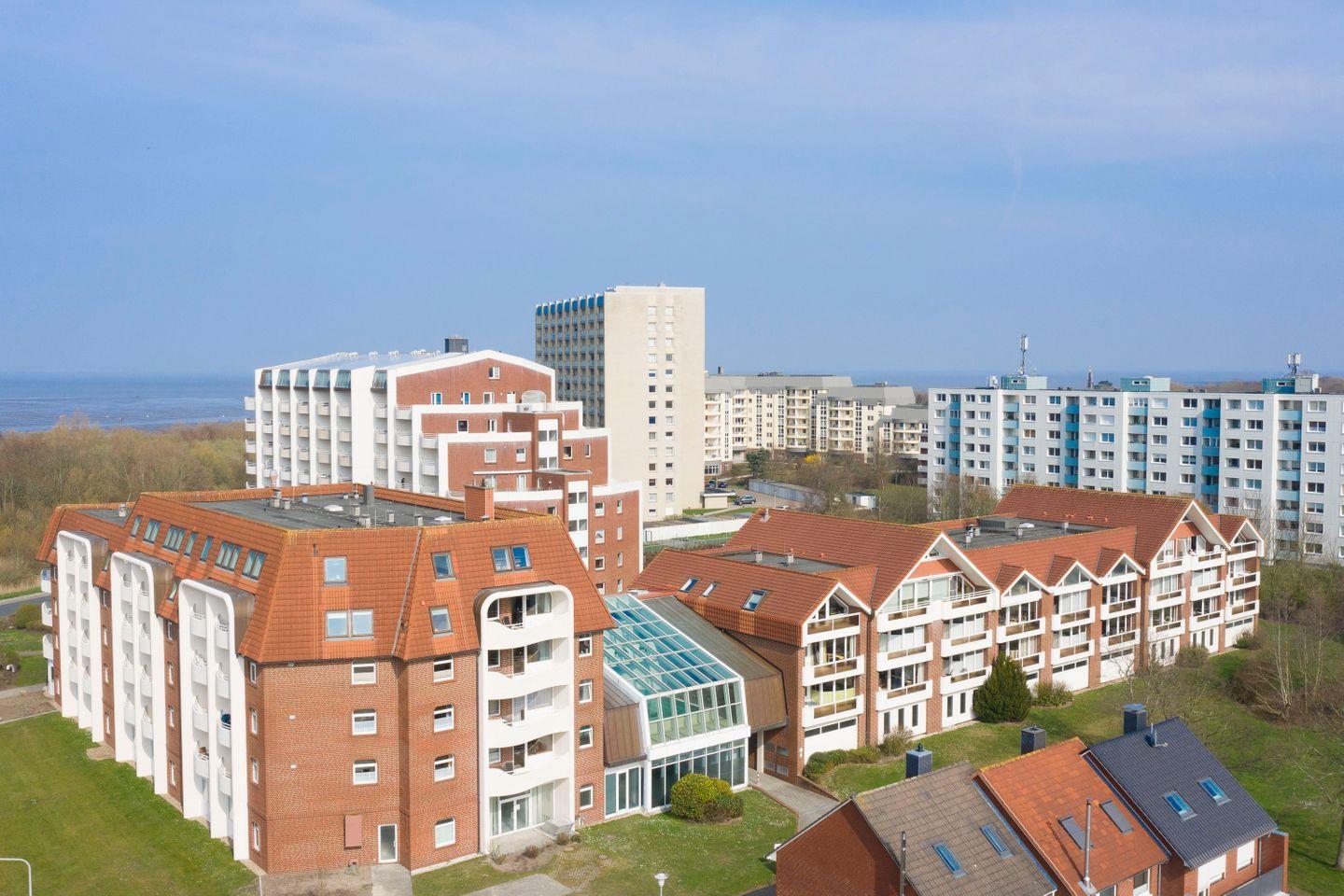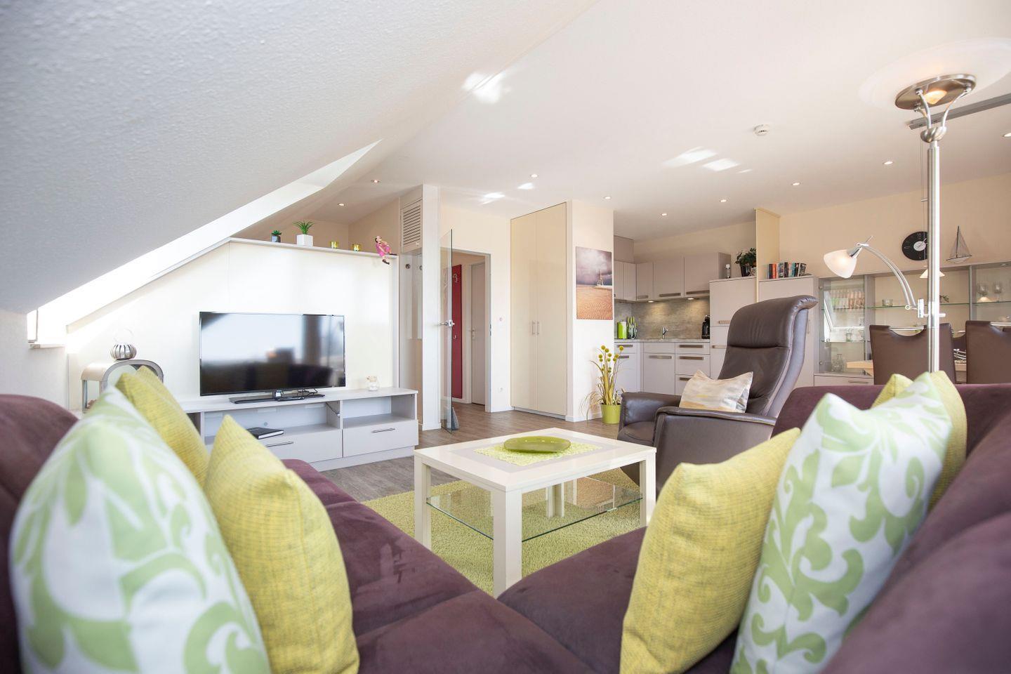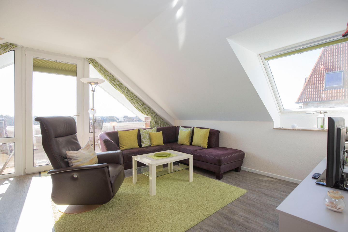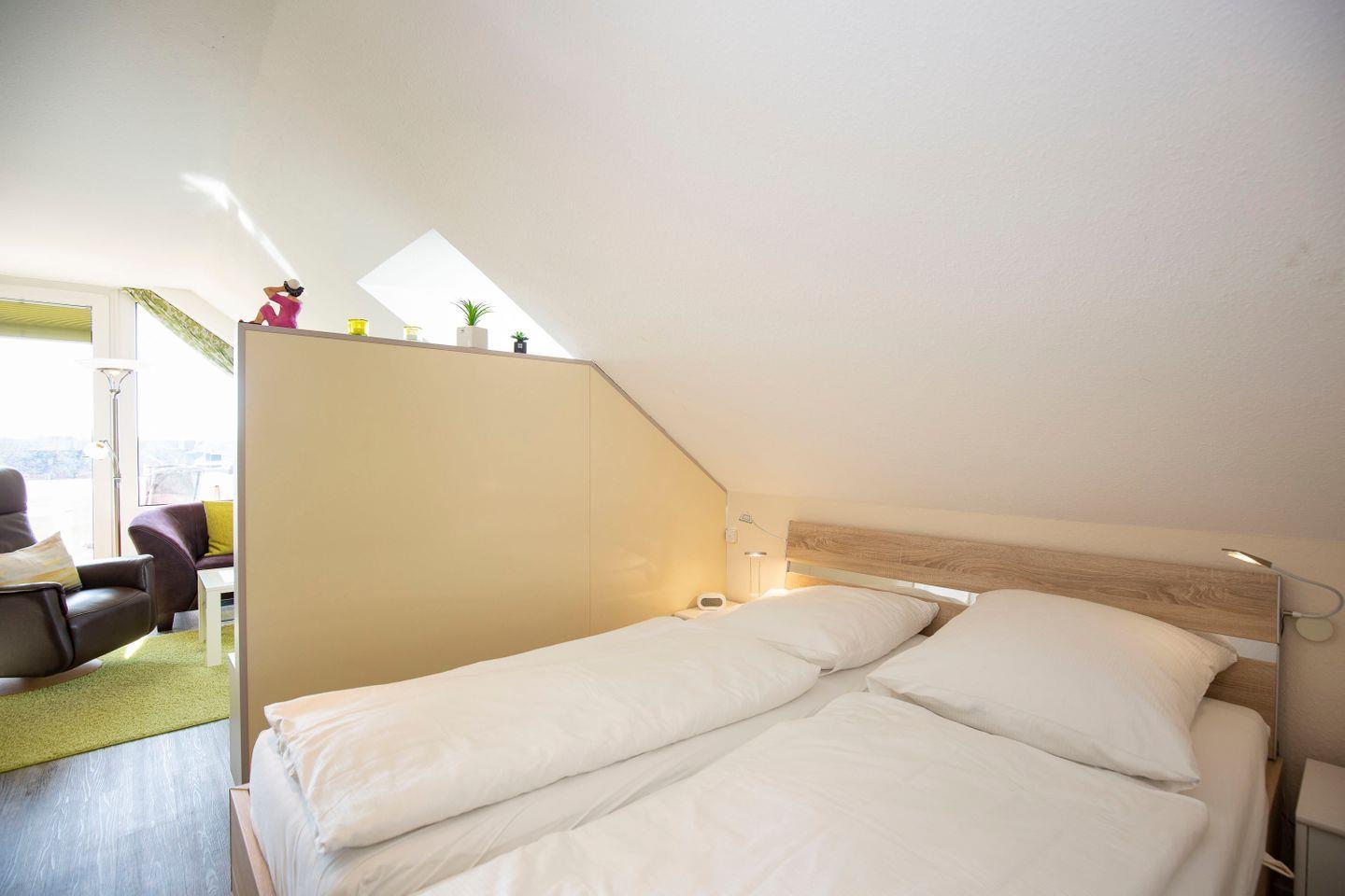 Haus "Trafalgar", Typ B-Süd, App.-Nr. "341", bis 2 Pers., 3. Etage, Südseite (ohne Meerblick), Wohn/Schlafraum mit Doppelbett, Küchenzeile mit 4-Platten-Ceranfeld und Mikrowelle, Dusche/WC, ca. 40 qm Größe mit Dachschrägen, Balkon, Kabel-TV, kostenl. WLAN-Zugang im App., Tiefgaragenstellplatz, Nichtraucherwohnung, Haustiere sind nicht gestattet, Strandkorb im Sommer 2026.