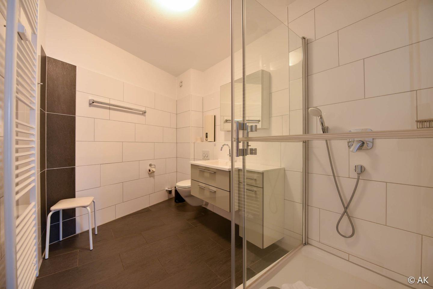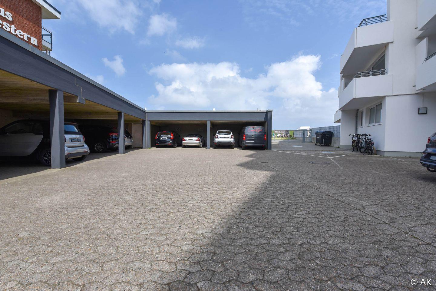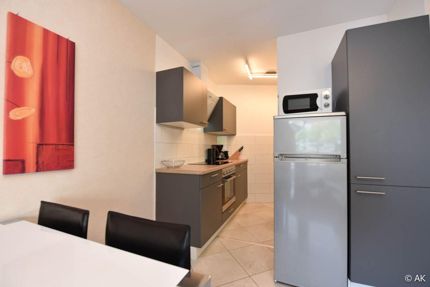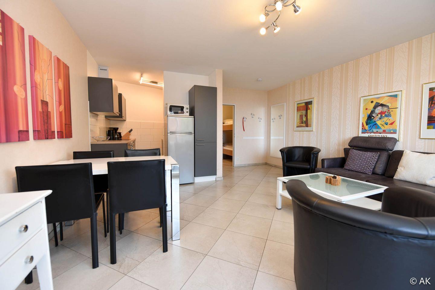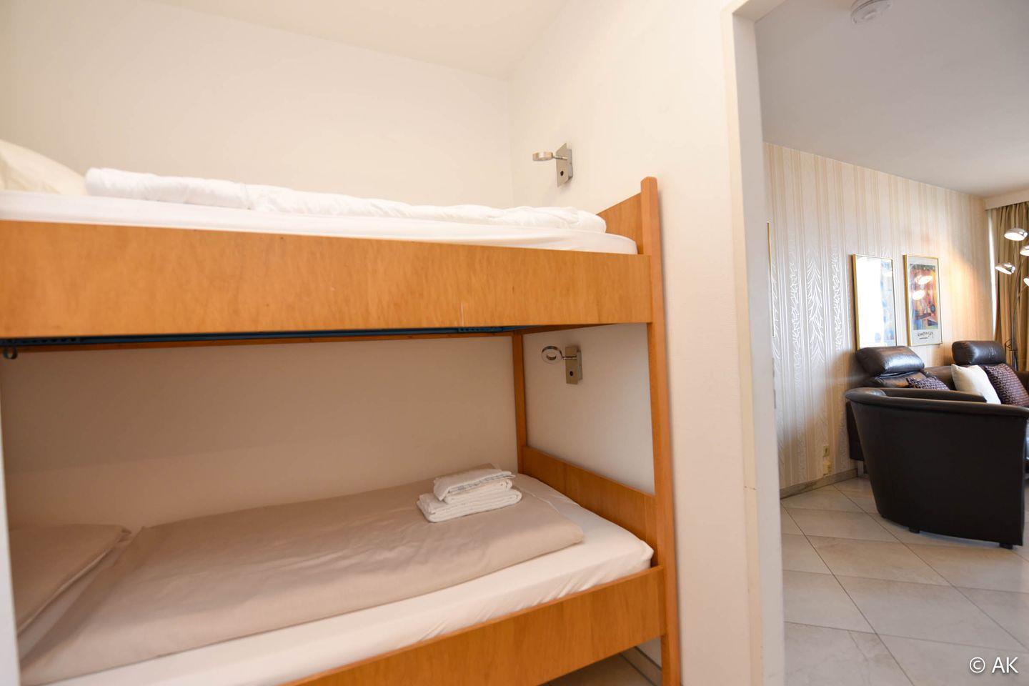 Die Wohnung verfügt über einen offenen Wohn-, Ess- und Küchenbereich, ein separates Schlafzimmer mit Doppelbett sowie ein innenliegendes Etagenbett im Eingangsbereich. Damit ist sie besonders gut für Paare oder Familien mit Kindern geeignet, wobei die optimale Belegung bei zwei Personen liegt. Ein modernes Duschbad mit WC, ein Westbalkon mit seitlichem Seeblick sowie ein fest zugewiesener PKW-Stellplatz direkt am Haus runden das Angebot ab. Ein Fahrstuhl und ein Gepäckwagen erleichtern die An- und Abreise zusätzlich.