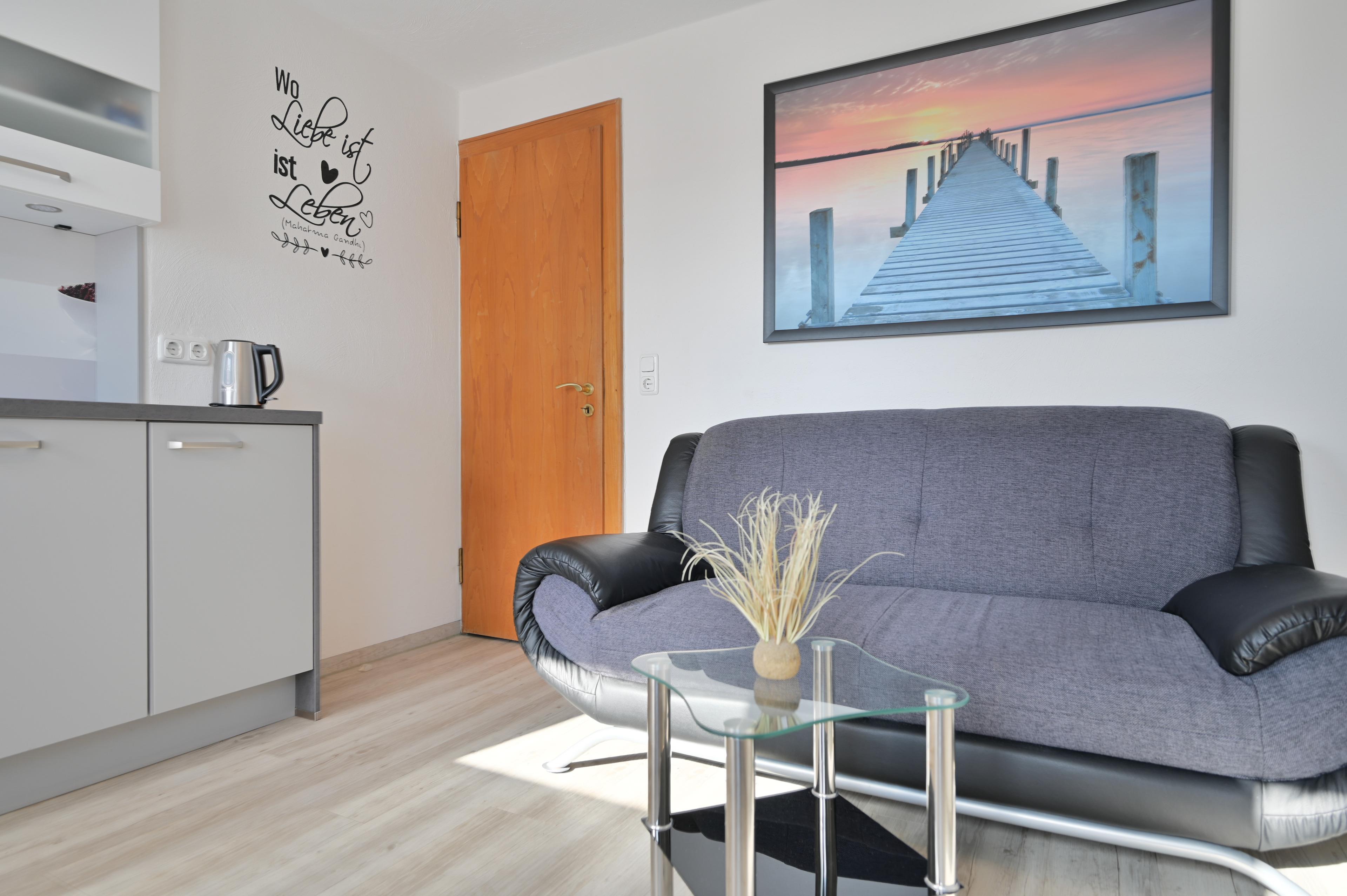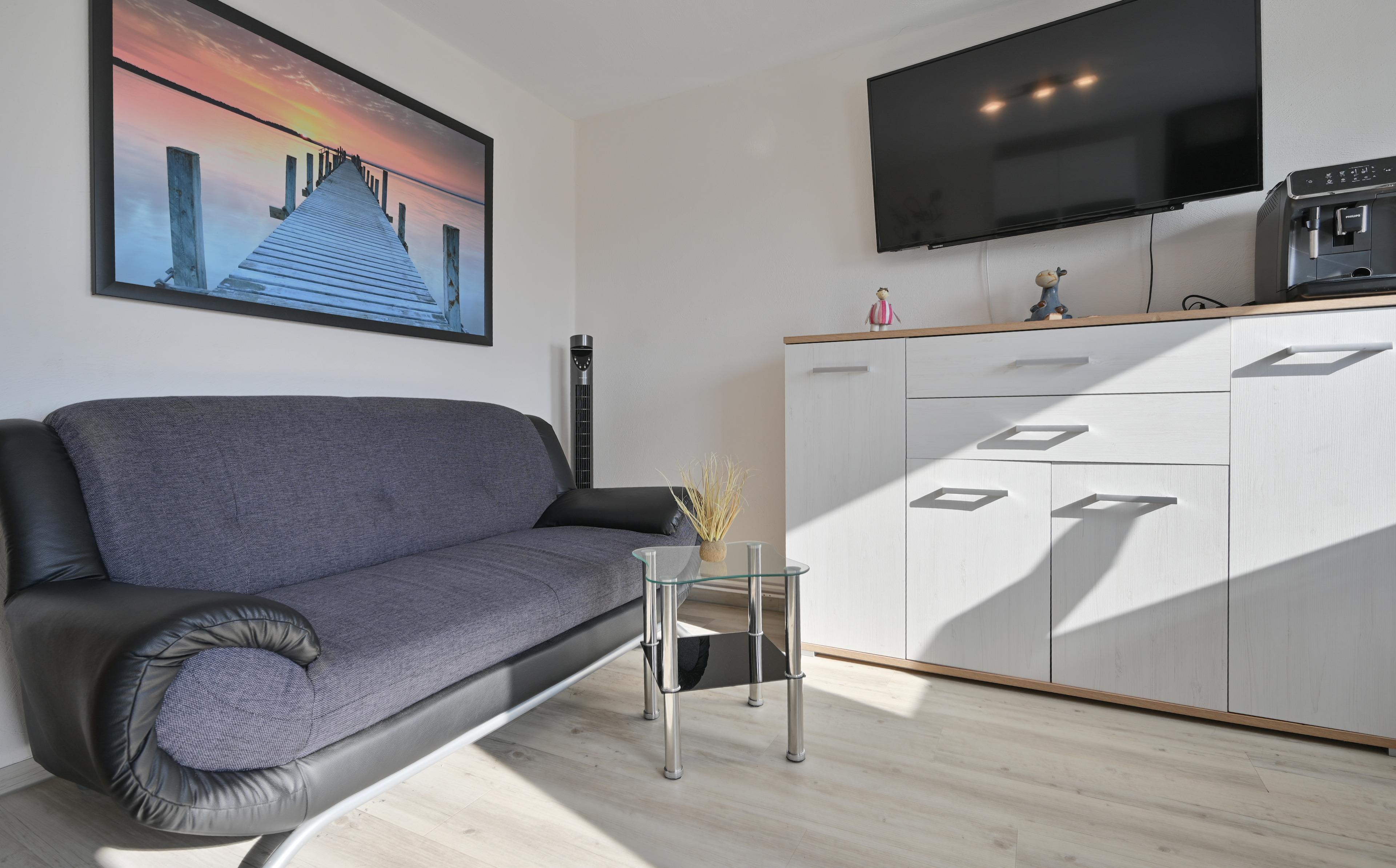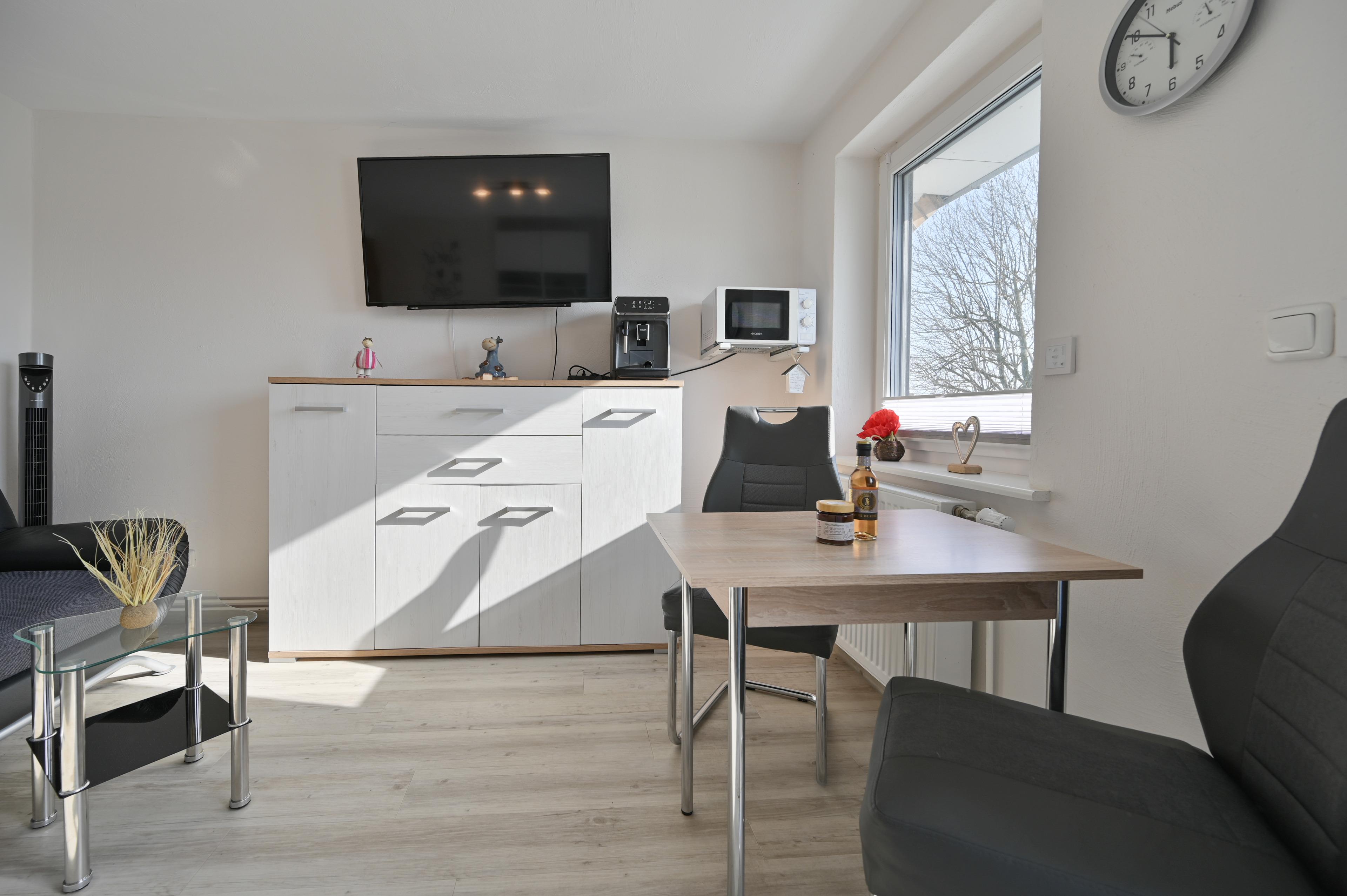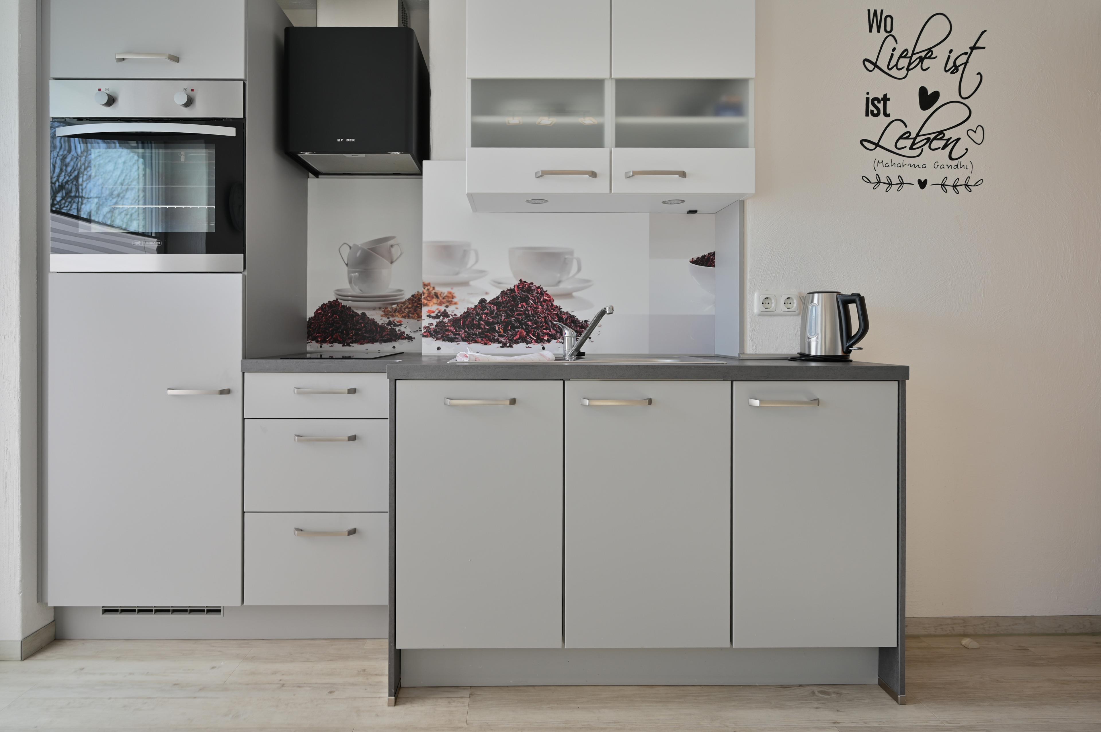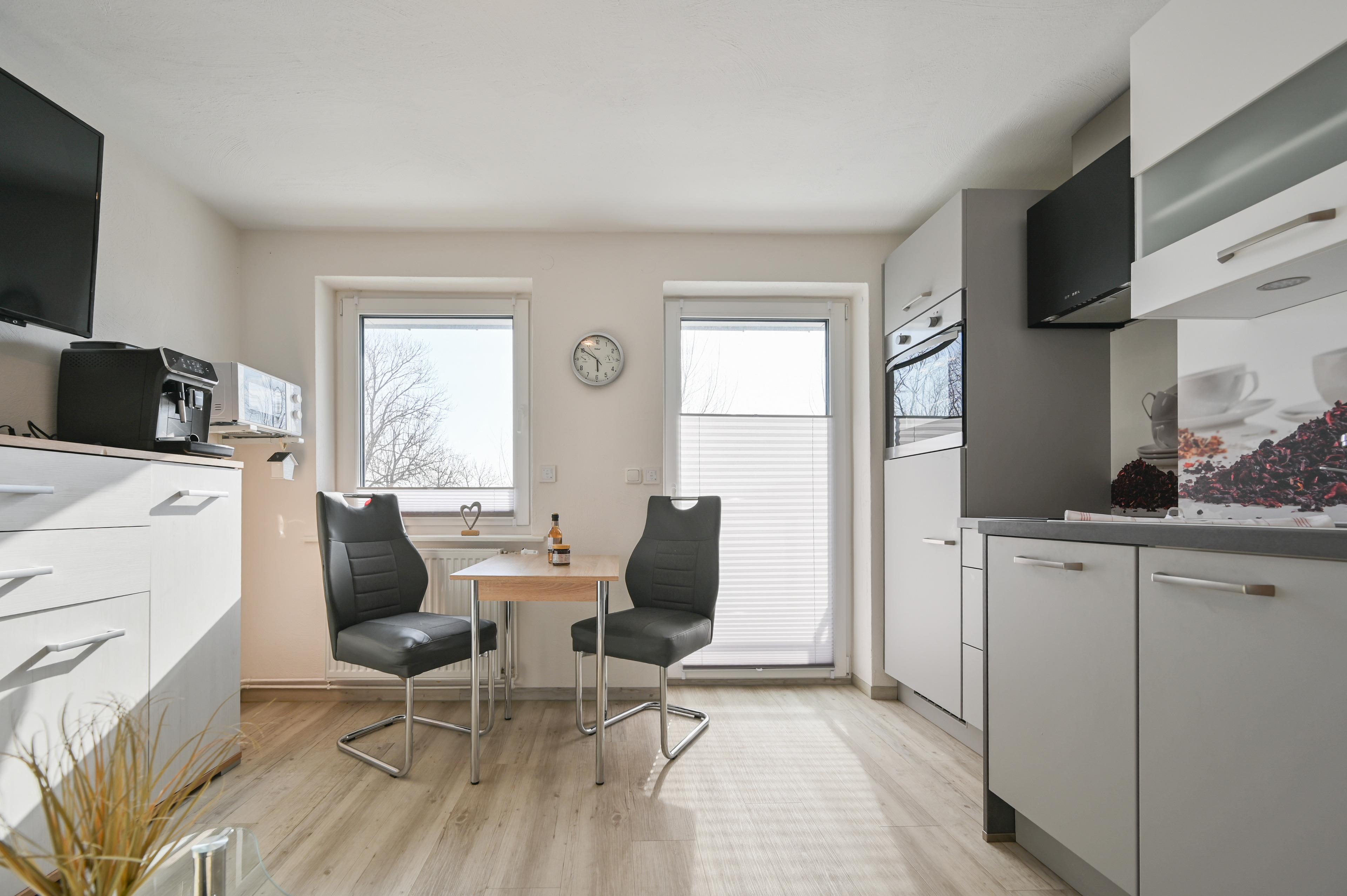 Die neue Küche verfügt über einen Backofen, ein Ceranfeld sowie eine Spülmaschine und einen Kaffeevollautomaten und eine Mikrowelle. Ebenfalls befindet sich im Wohn und Küchenbereich ein Essplatz für zwei Personen, sowie ein Couchbereich mit Tisch und Flachbild-TV.