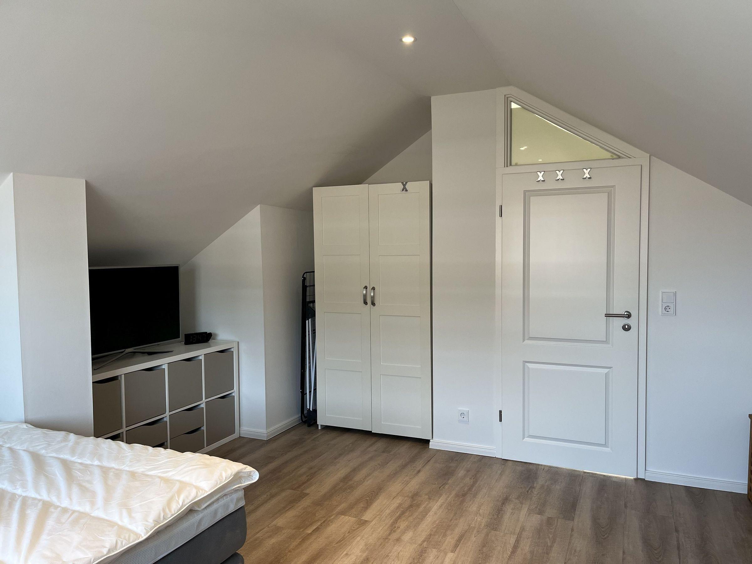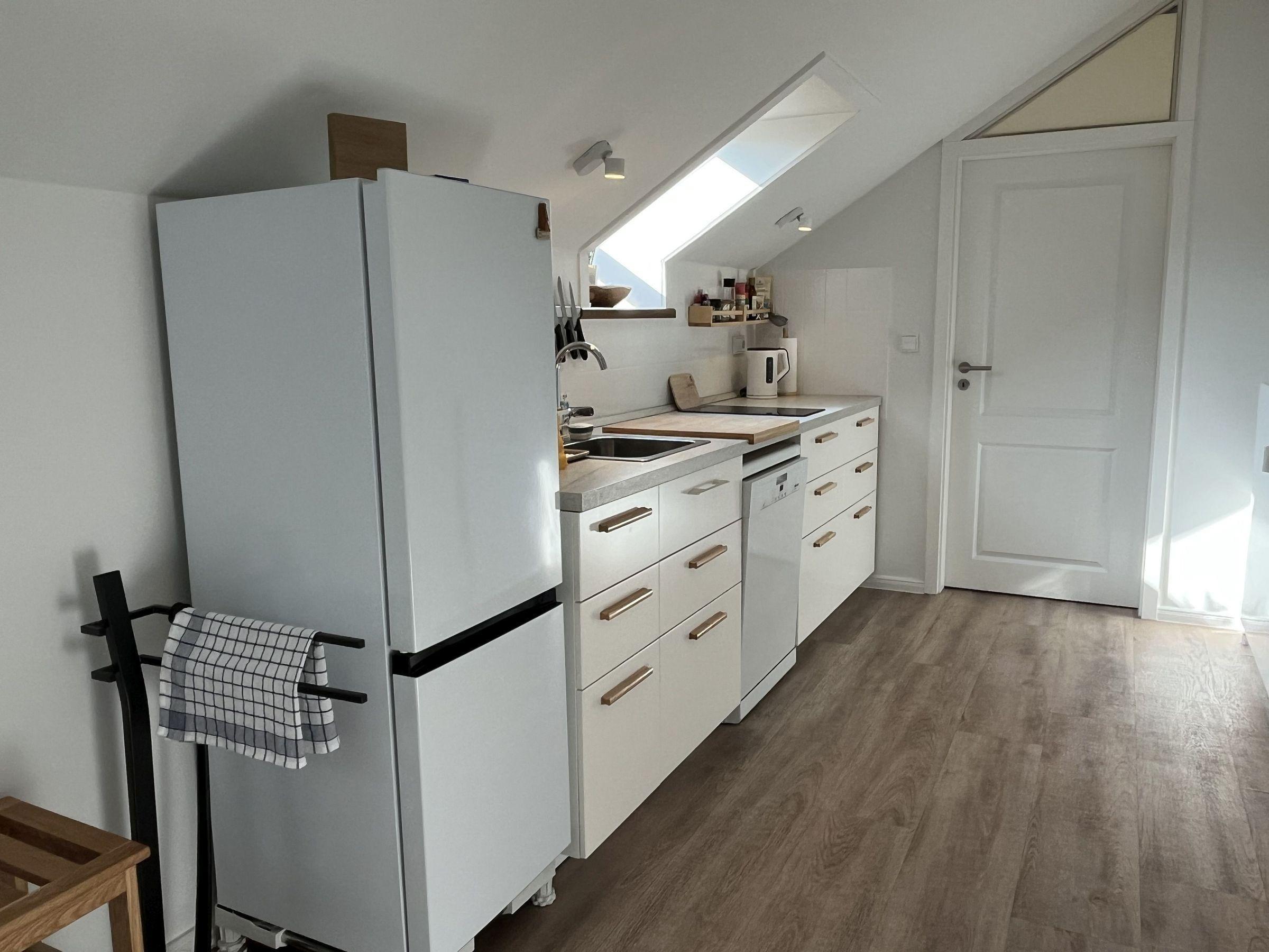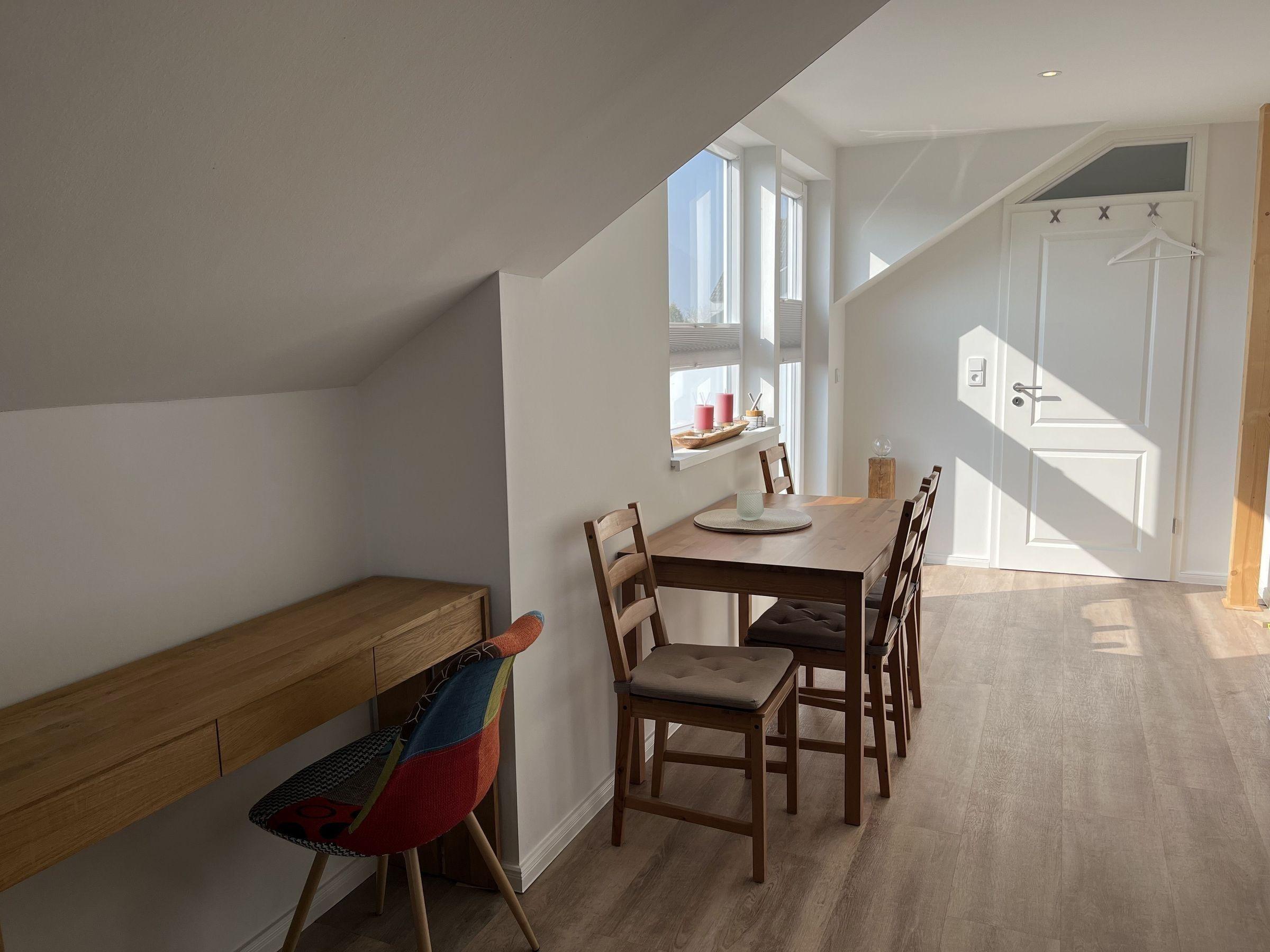 Die moderne 75 m² große Ferienwohnung "Sonnendeck" im 2. Obergeschoss bietet Platz für maximal 4 Personen. Das Wohnzimmer ist mit einem TV, einer Chaiselongue-Couch sowie einem gemütlichen Ohrensessel ausgestattet. Ein integrierter Essplatz für 4 Personen und ein zusätzliches Kojenbett schaffen Komfort. Die angrenzende Küche verfügt über einen Geschirrspüler, einen Mini-Backofen mit Grillfunktion, eine Mikrowelle und einen Induktionsherd mit 2 Platten. Ein Schlafzimmer mit einem Doppelbett (zwei Einzelmatratzen) und einem Kojenbett, sowie zwei tageslichthelle Badezimmer mit Dusche, WC und Waschtisch runden die Wohnung ab. Eine Waschmaschine und ein Trockner stehen zur gemeinschaftlichen Nutzung im Keller bereit (gebührenpflichtig). Haustiere sind nicht erlaubt. Ein PKW-Stellplatz befindet sich direkt vor dem Haus.