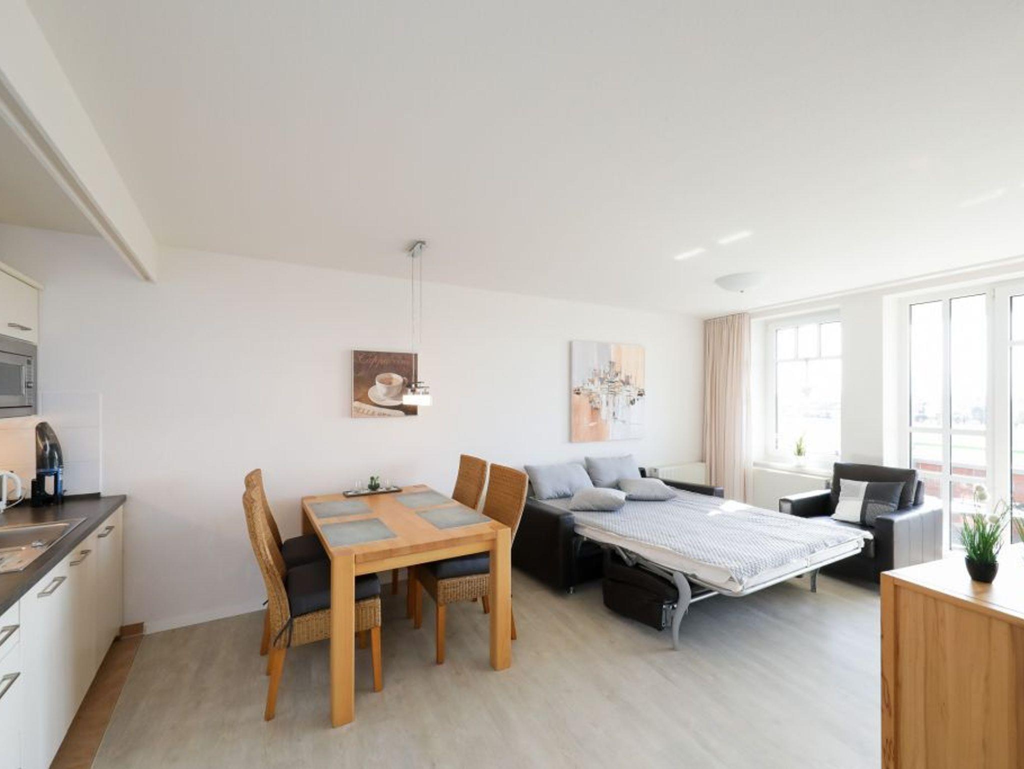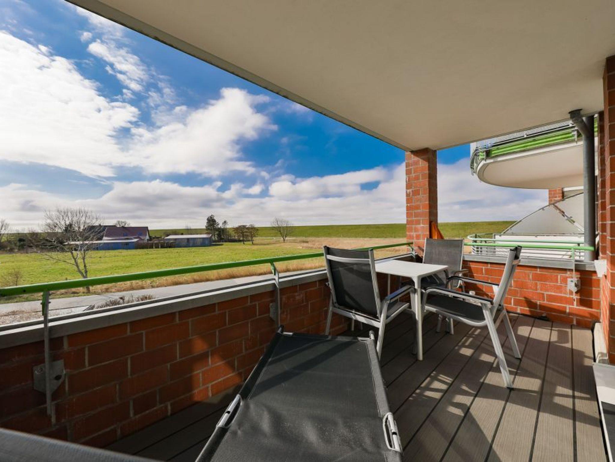 Der große möblierte Balkon bietet eine schöne Aussicht auf das Grün und den Deich und ist von morgens bis zum Sonnenuntergang sonnig. Alle Fenster und die Terrassentür sind mit Insektenschutz ausgestattet und im Wohnzimmer gibt es elektrische Außenjalousien.