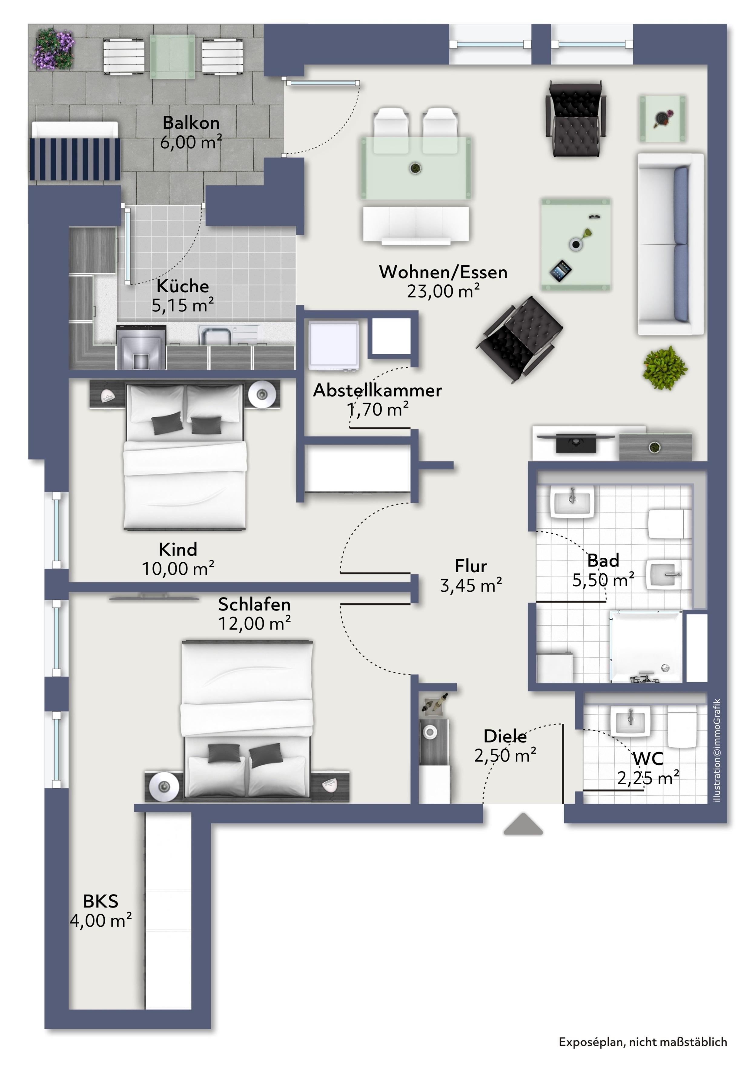 Der maritim eingerichtete, gemütliche Wohn- und Essbereich, mit separater voll ausgestatteter Küche, la¨dt zum gemeinsamen Entspannen und Kochen ein! Die Ferienwohnung verfügt über einen Balkon Richtung Süden mit Blick auf den Seglersteg und Jungfernstieg. Beide Schlafzimmer wurden mit modernen Boxspringbetten (180x200 und 160x200), Kleiderschränken und eines mit einem TV-Gerät ausgestattet. Die Schlafzimmer bieten somit die gewünschte Erholung! Die Dusche im Badezimmer ist ebenerdig. Die komplette Wohnung ist mit Vinylboden und Fußbodenheizung ausgestattet. Zusätzliches: Gäste-WC. Die im 1. Stock des Appartementhauses gelegene Ferienwohnung kann ''barrierefrei'' über einen Aufzug, mit direktem Zugang aus der Tiefgarage erreicht werden. Die Symbole vom Wohngrundriss können in der Darstellung von der tatsächlichen Innen- und Außengestaltung der Wohnung abweichen!
