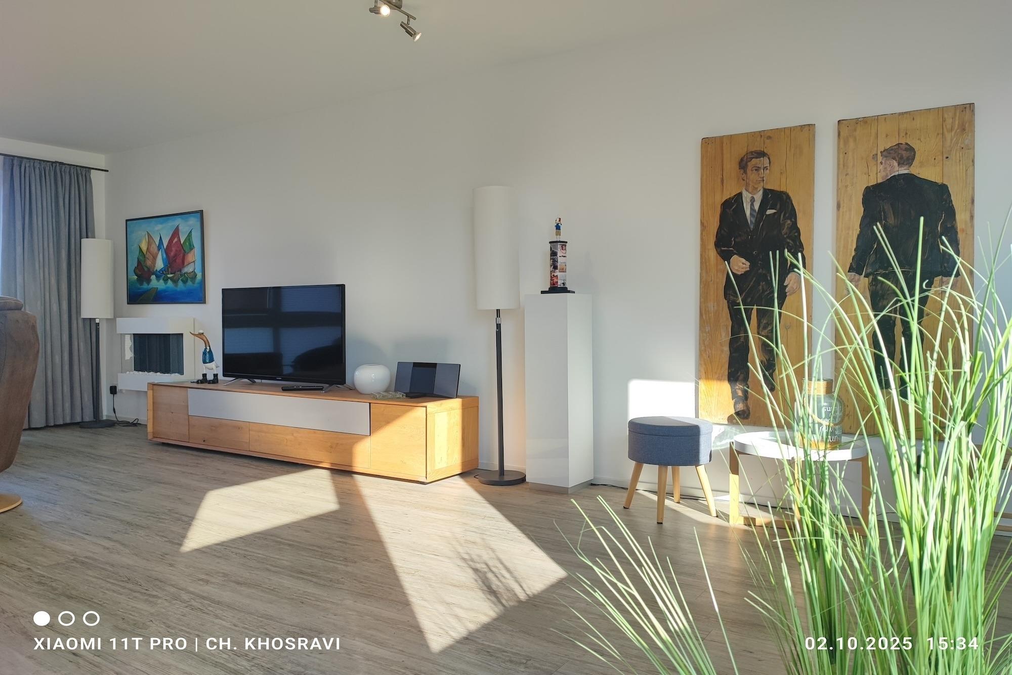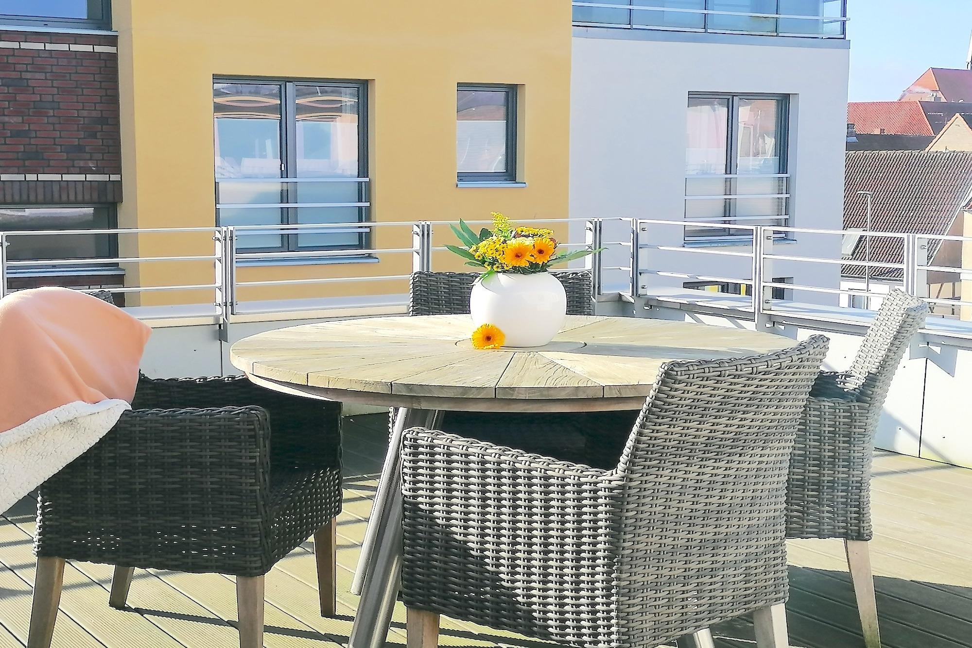 Genießen Sie durch die bodentiefen Fenster vom Wohnzimmer den weiten Blick über die Promenade mit Wasserblick. Der durchdachte Grundriss der Ferienwohnung beeindruckt schon beim Betreten der Wohnung. Die halboffene, voll ausgestattete Küche trennt den Wohn- und Essbereich und das Schlafzimmer. Die Ferienwohnung verfügt über eine große Dachterrasse. Beide Schlafzimmer wurden mit modernen Doppelbetten (180x200 und 160x200), begehbaren Kleiderschränken und TV-Geräten ausgestattet. Die Schlafzimmer bieten somit die gewünschte Erholung! Die Dusche im Badezimmer ist ebenerdig und eine Badewanne in einem weiteren Badezimmer lädt zur Entspannung ein. Die komplette Wohnung ist mit Vinylboden und Fußbodenheizung ausgestattet. Die im 2. Stock des Appartementhauses gelegene Ferienwohnung kann ''barrierefrei'' über einen Aufzug, mit direktem Zugang aus der Tiefgarage erreicht werden. Die Symbole vom Wohngrundriss können in der Darstellung von der tatsächlichen Innen- und Außengestaltung der Wohnung abweichen!