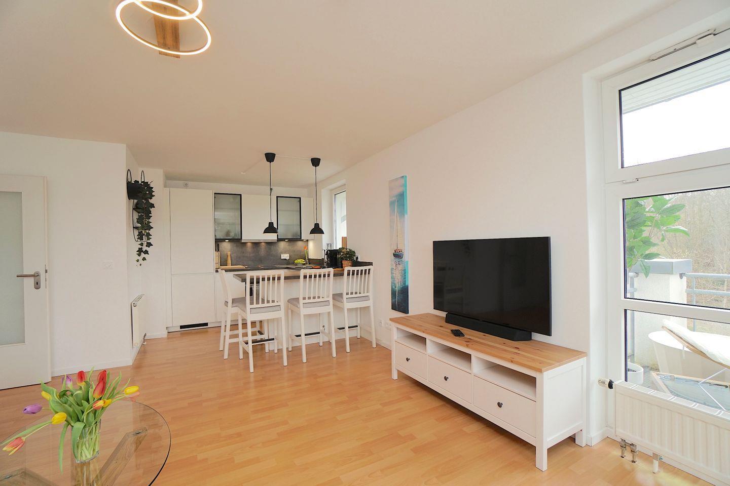 Das helle Wohnzimmer mit der offenen Küche ist mit viel Liebe zum Detail modern und neu eingerichtet und bietet viel Platz zum Entspannen und Wohlfühlen.