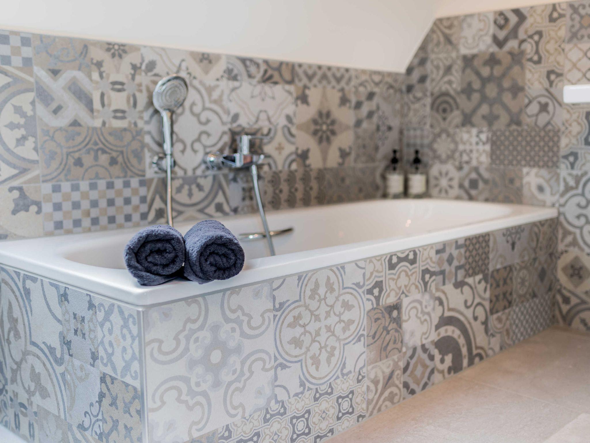 Ein modernes Bad mit WC, Waschbecken, Fenster, verglaster Dusche mit Regenschauerbrause und Badewanne runden das Wohlfühlangebot ab.