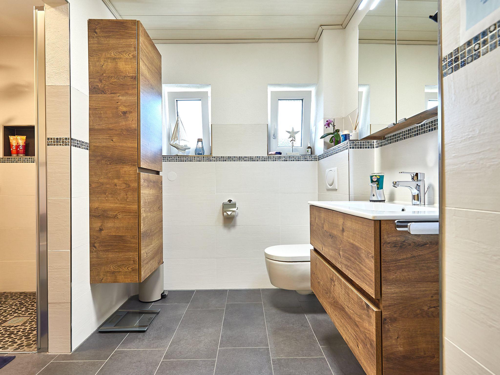 Die Wohnung wird durch das Anfang 2021 vollständig sanierte Badezimmer mit begehbarer Dusche (auch für Rollstuhlfahrer geeignet) und WC abgerundet. Hier finden die Gäste bei ihrer Ankunft einige Kosmetikartikel. Handtücher in unterschiedlichen Größen und Toilettenpapier sind ebenfalls kostenfrei in der Wohnung vorhanden.