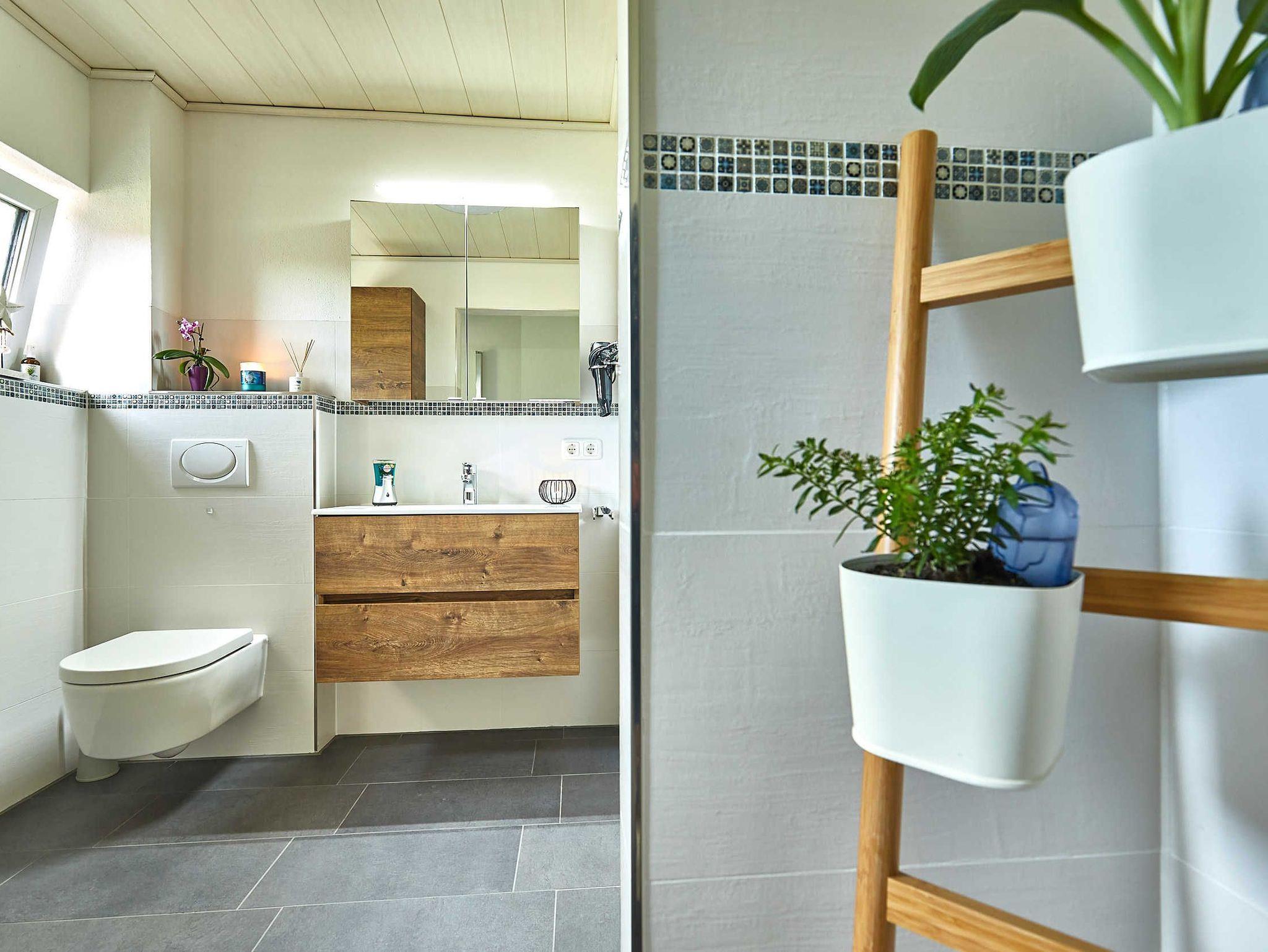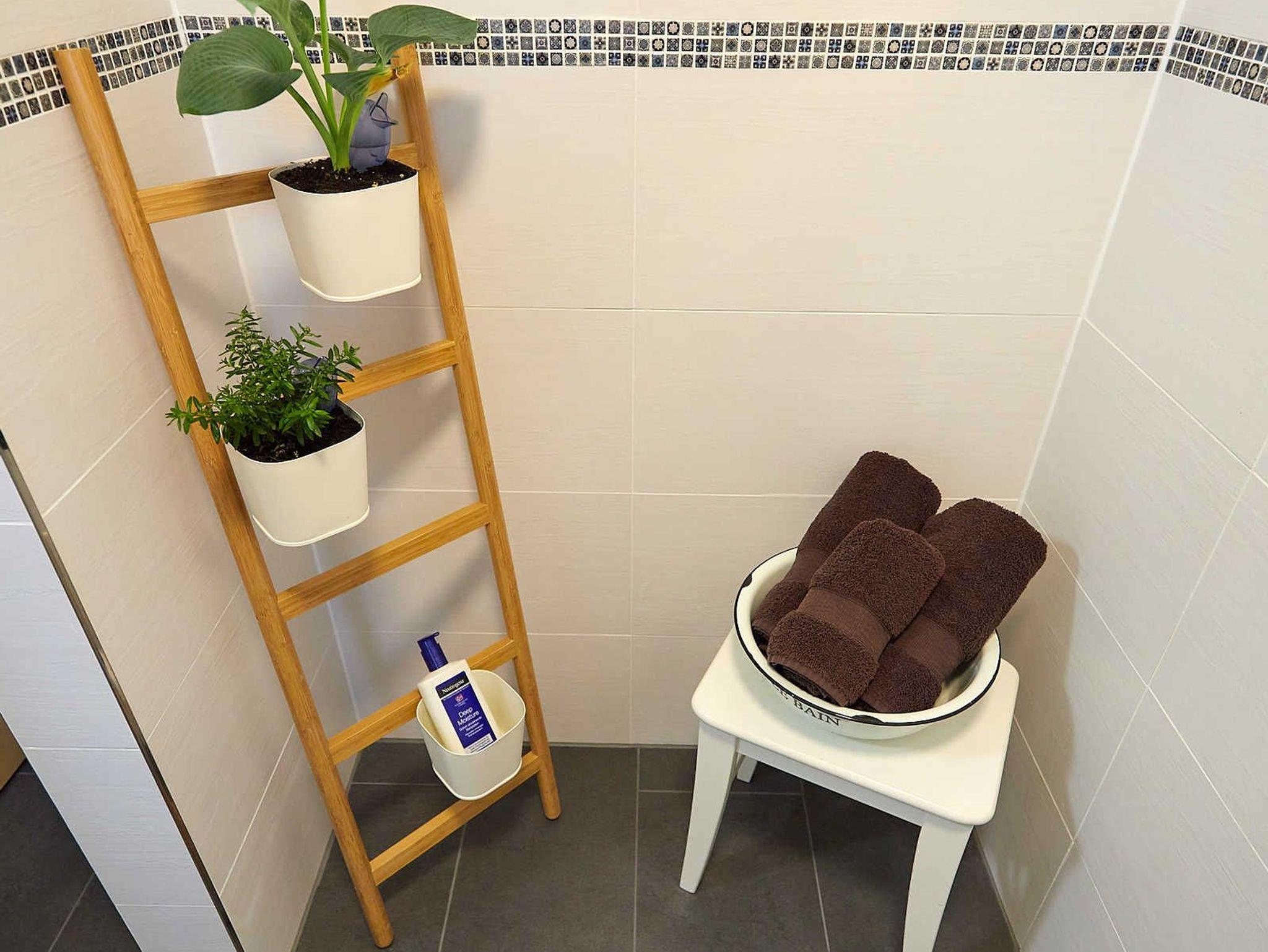 Die Wohnung wird durch das Anfang 2021 vollständig sanierte Badezimmer mit begehbarer Dusche (auch für Rollstuhlfahrer geeignet) und WC abgerundet. Hier finden die Gäste bei ihrer Ankunft einige Kosmetikartikel. Handtücher in unterschiedlichen Größen und Toilettenpapier sind ebenfalls kostenfrei in der Wohnung vorhanden.