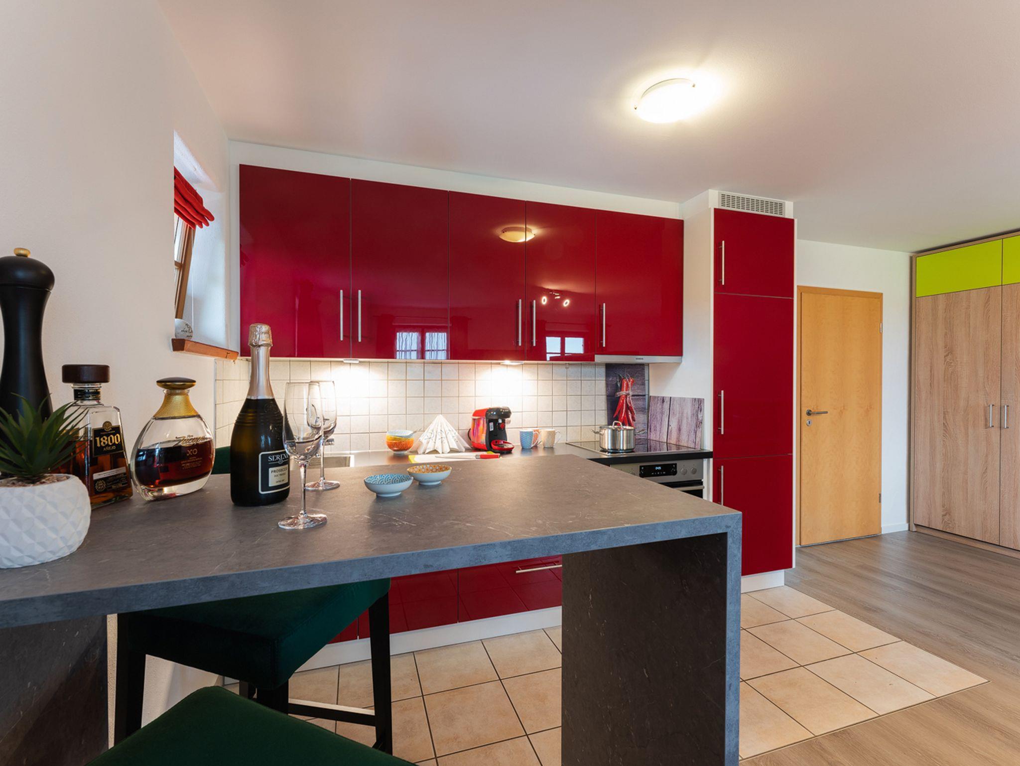 Beim Appartment Jabobo handelt es sich um ein Quartier das ideal für zwei Personen ist. Ganz neu und im modernen Alpenstil eingerichtet, lässt es für einen Urlaub oder ein verlängertes Wochenende kein Wünsche offen. Auf den 50m² ist alles untergebracht und das sehr frisch, hell und freundlich. Die Einbauküche mit seinen kanllroten Fronten bringt Farbe in den Tag und das gilt auch für die restliche Einrichtung. Ein Bartresen gibt Raum für das Dinner for two oder den ersten Kaffee am Morgen. Ein schickes Sofa und ein Flachbildschirm-TV, sowie der abgeteilte Schlafbereich mit einem tollen Boxspringbett runden den komfortablen Raum ab. Vom Balkon aus gibt es eine top Blick über Wiesen in die Berge. Das helle Duschbad bietet ausreichend Raum und im Eingang können Gepäck und Schuhe deponiert werden.