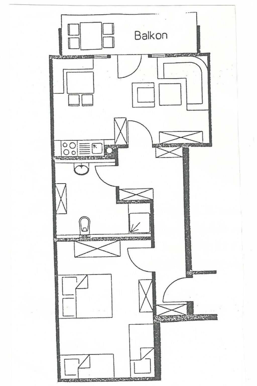 You have your own balcony incl. balcony furniture and cushions. The bedroom is a dormitory with 4 beds. The bathroom has a shower, washbasin and 1 WC. The living room has a fully equipped kitchen, a dining table with 4 chairs and a cosy sofa - convertible to sleep - (for 1 person) with table l. In the wall unit you will find crockery, glasses and satellite TV.