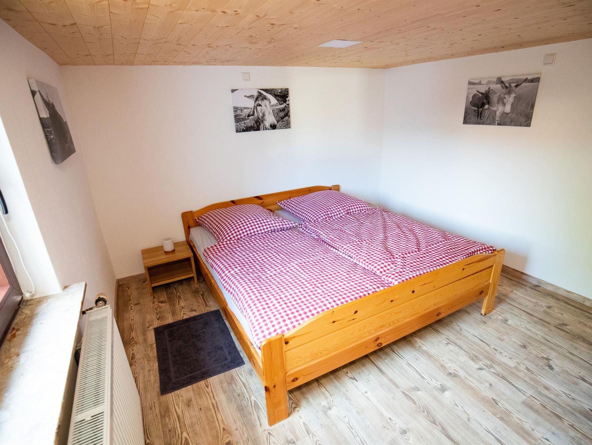 Unser Haus bietet zwei Ferienwohnungen für jeweils 6 Erwachsene. Eine Wohnung im Erdgeschoss und eine im Dachgeschoss. Die Wohnungen können getrennt oder als Gruppenunterkunft für 12 Personen (nach Absprache auch mehr) genutzt werden. Es befindet sich ein zusätzlicher gemeinsamer Aufenthaltsraum mit Trockenkammer und Schuhwärmern im Haus. Abschließbare Unterstellmöglichkeiten für Fahrräder oder Motorräder, sowie Parkplätze direkt am Haus sind vorhanden. Wir betreiben außerdem noch einen Biobauernhof mit Mutterkühen, Schafen, Eseln, der sich ca.200 Meter entfernt in Ortsrandlage befindet. Bei Interesse sind Führungen möglich und vor allem die Esel laden zum Kuscheln ein. Nur 50 Meter vom Grundstück entfernt befindet sich ein gutbürgerlicher Gasthof (Goldener Stern), wo auf Wunsch gegen Aufpreis gefrühstückt werden kann. Wir stehen unseren Gästen gerne mit Wandertourentips und Freizeitgestaltungstips zur Seite. Das komplette Haus wurde 2020/21 renoviert, umgebaut. Hunde sind erlaubt (Aufpreis), überdachter Grillplatz. Auf Wunsch und Anfrage können zwei Kinderbetten zur Verfügung gestellt werden.