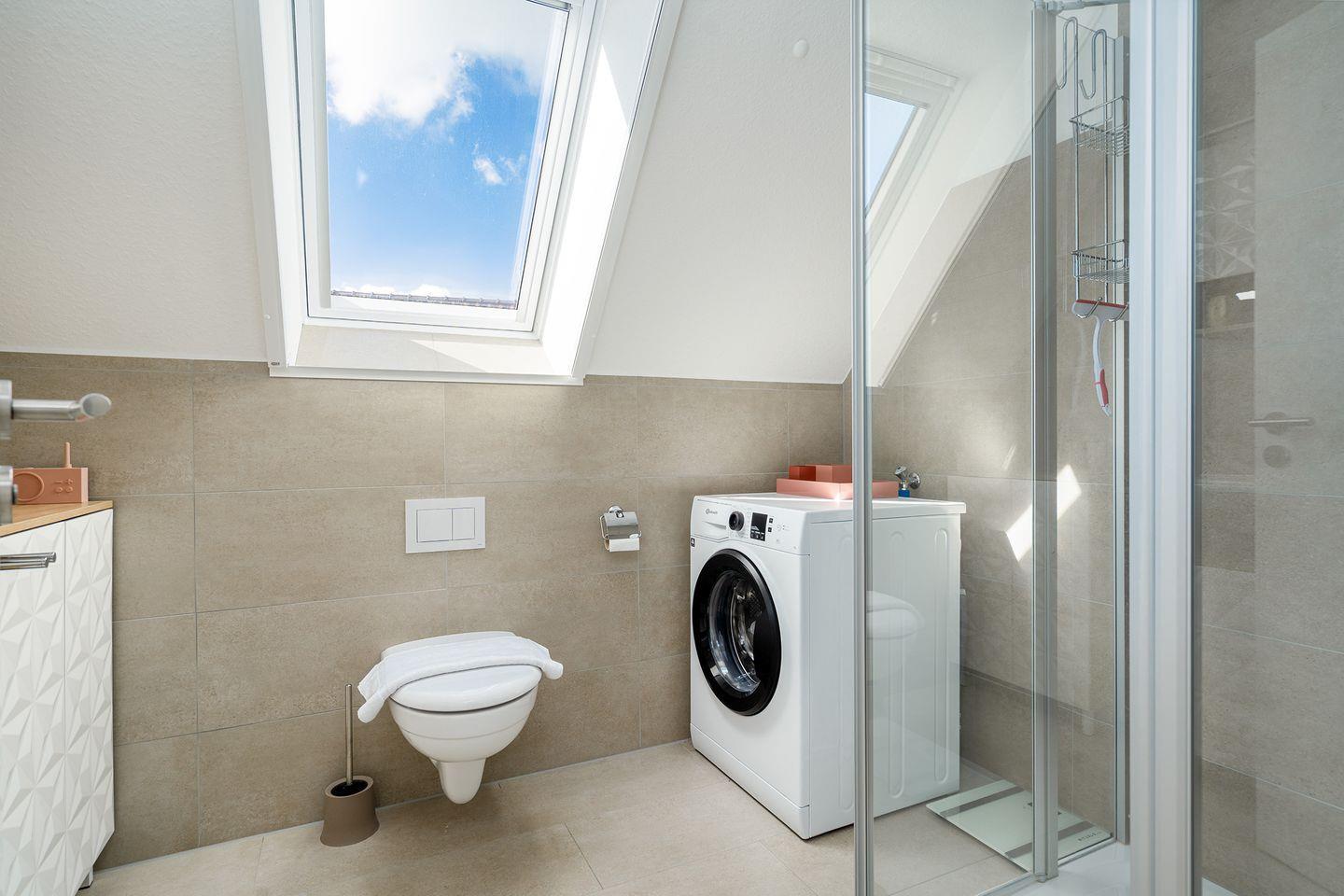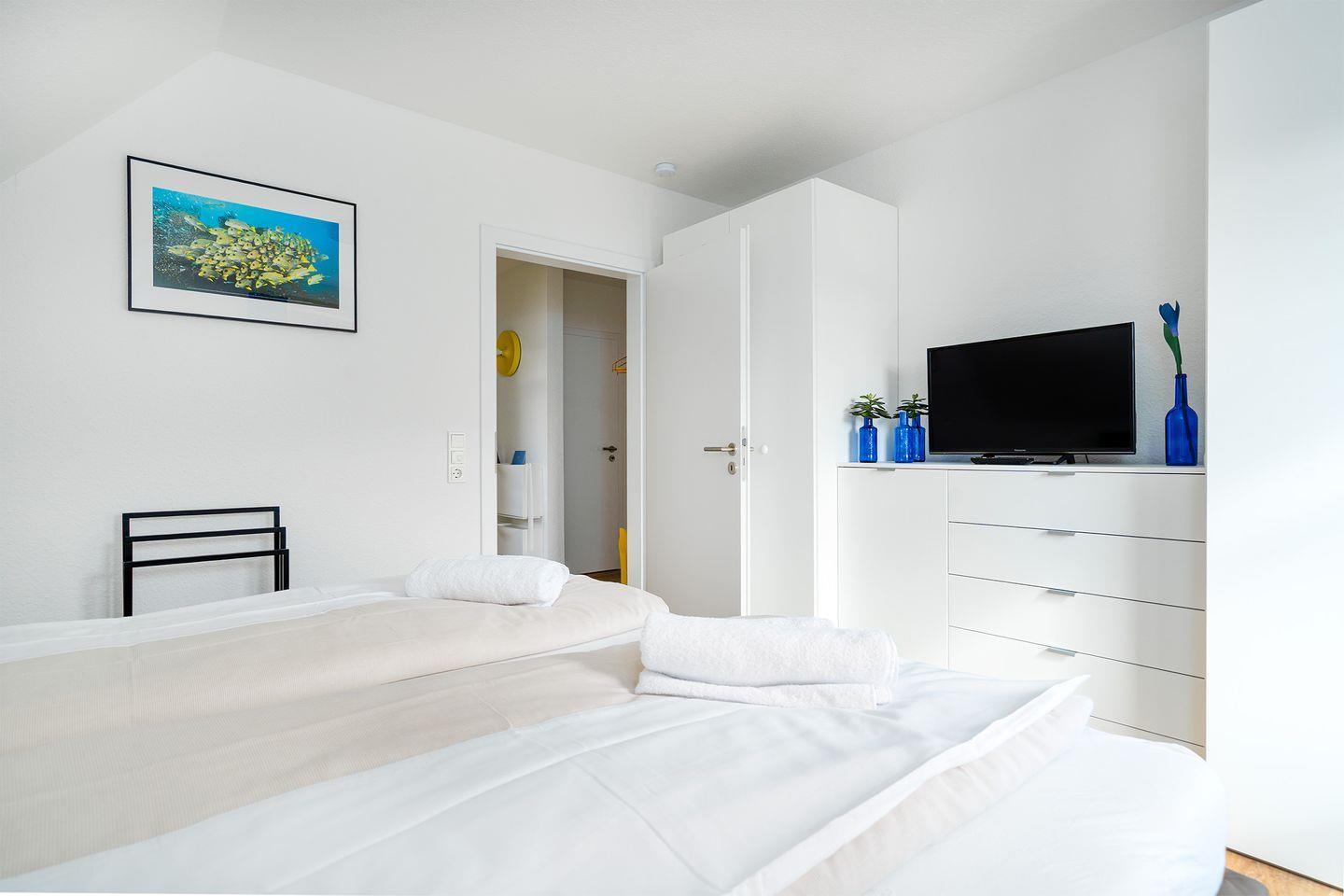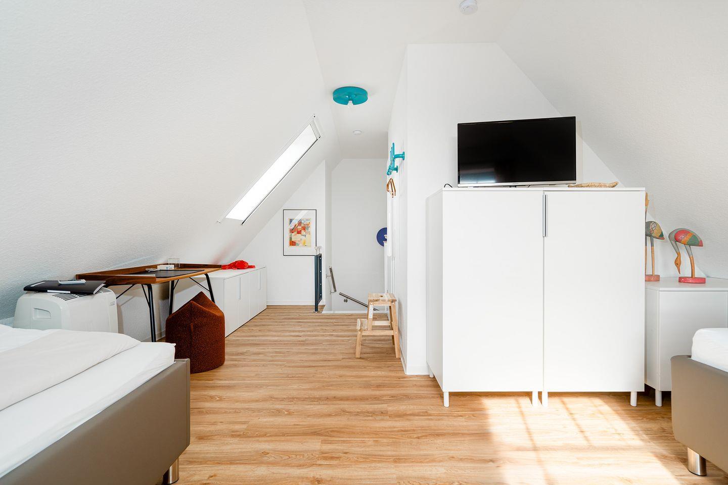 Im Dachgeschoss befindet sich das zweite Badezimmer mit Dachflächenfenster, Dusche mit flachem Einstieg, Waschbecken, Handtuchheizkörper und WC. Hier finden Sie weiterhin das zweite Schlafzimmer mit zwei Einzelbetten, TV, Kommode und einem Schreibtisch. Ab November befindet sich hier auch eine mobile Klimaanlage.