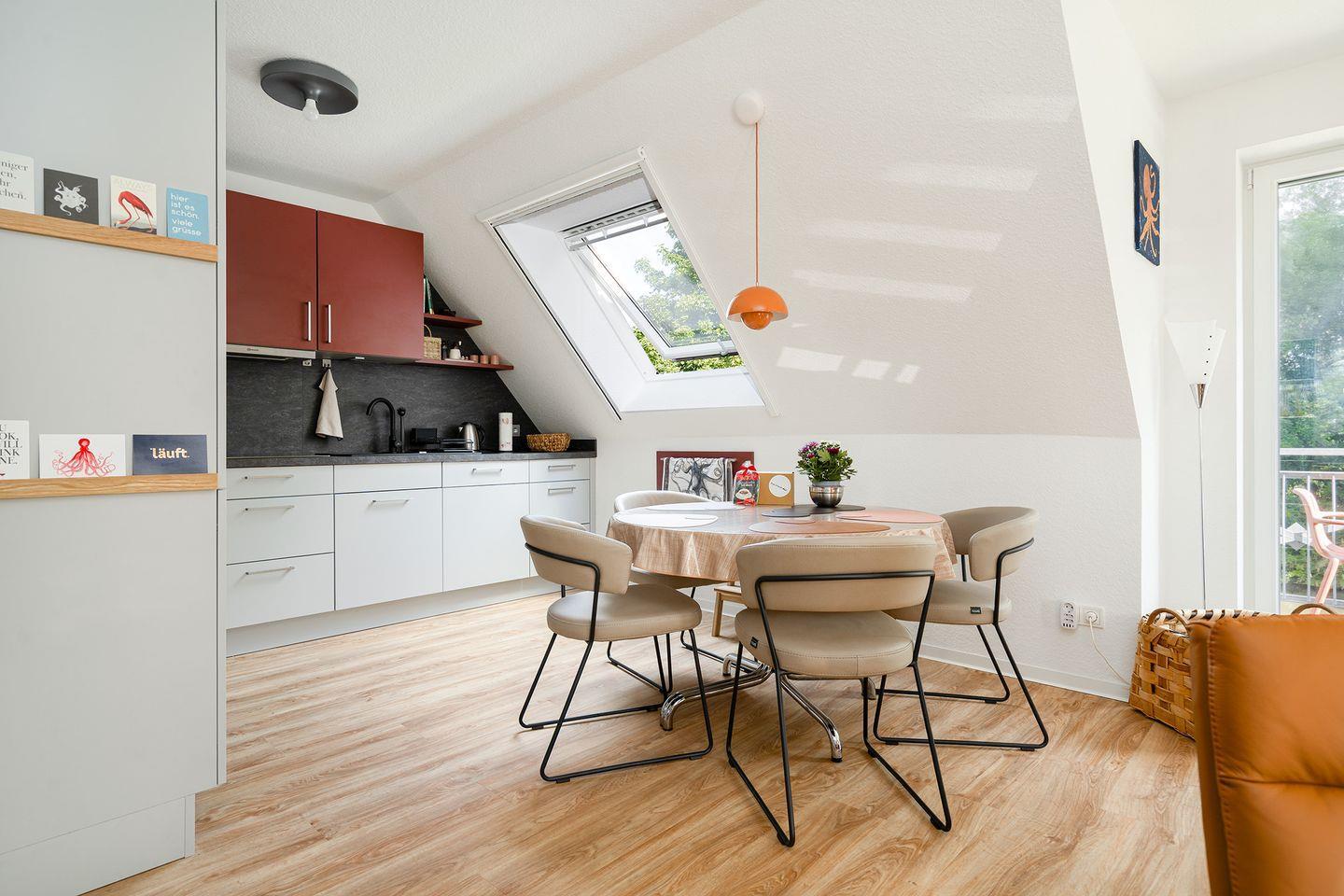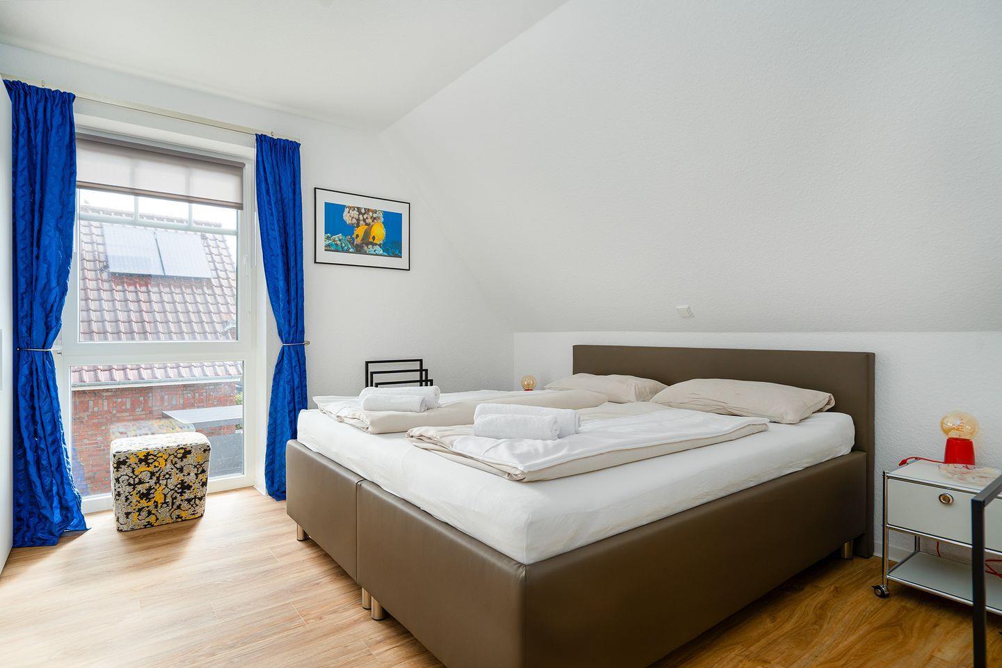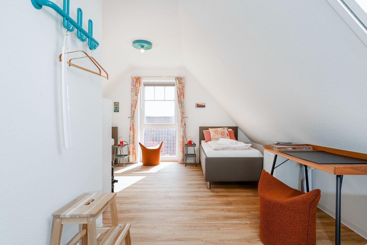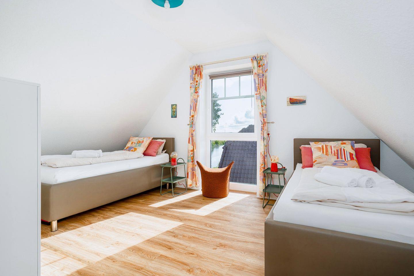 Im Dachgeschoss befindet sich das zweite Badezimmer mit Dachflächenfenster, Dusche mit flachem Einstieg, Waschbecken, Handtuchheizkörper und WC. Hier finden Sie weiterhin das zweite Schlafzimmer mit zwei Einzelbetten, TV, Kommode und einem Schreibtisch. Ab November befindet sich hier auch eine mobile Klimaanlage.