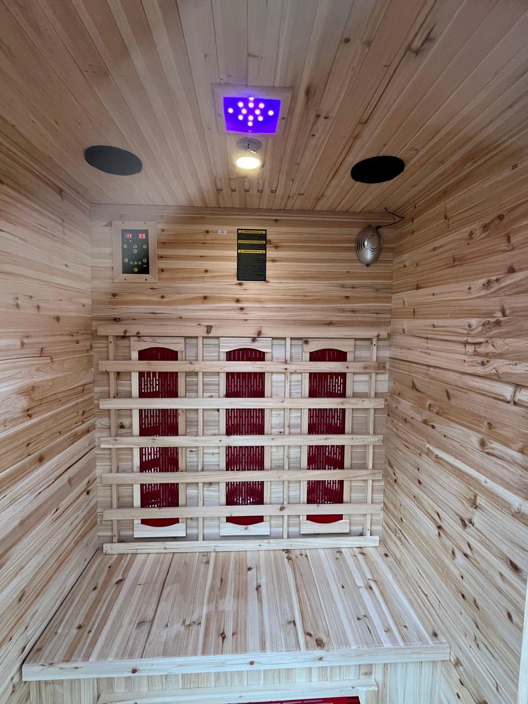 Die beiden verbundenen, möblierten Terrassen sind bequem von zwei Türen im Wohn- und Essbereich aus zu erreichen, hier finden Sie Tisch, Stühle, Grill, Sonnenliegen, Loungemöbel und die Infrarotkabine.