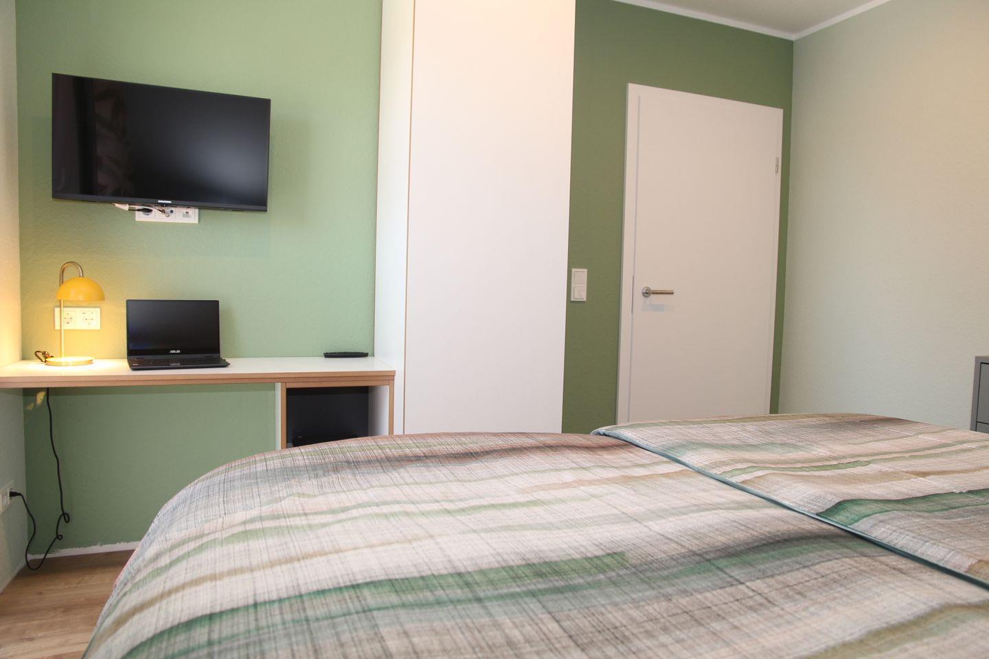 Das Schlafzimmer im OG verfügt über ein Boxspringbett 180 x 200cm (einzelne Matratzen mit durchgehendem Topper) und ein weiteres TV-Gerät. Ein kleiner Arbeitsplatz ermöglicht bei Bedarf das Arbeiten im „Homeoffice“.