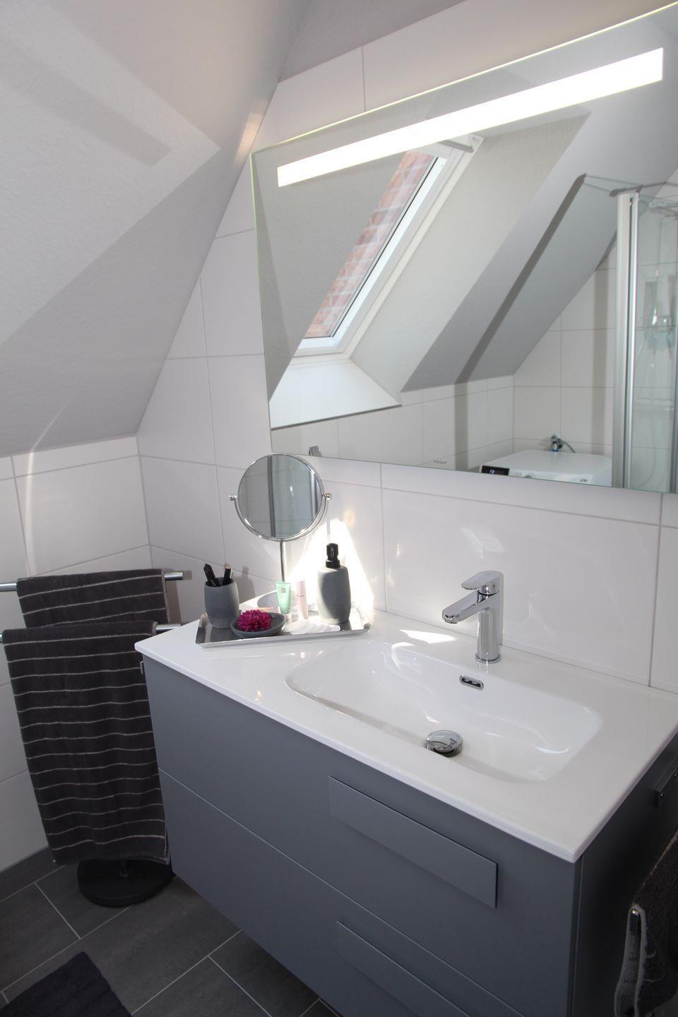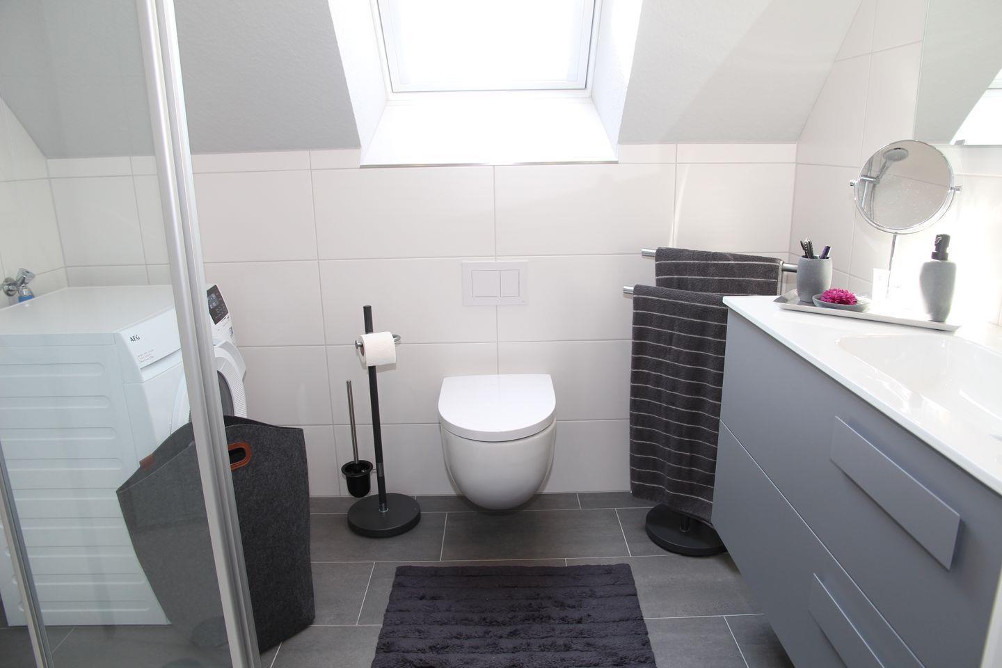Das helle Badezimmer im OG bietet eine ebenerdige Dusche inkl. Rainshower, einen Waschtisch mit ausreichend Stauraum und Fön sowie einen kombinierten Waschtrockner.