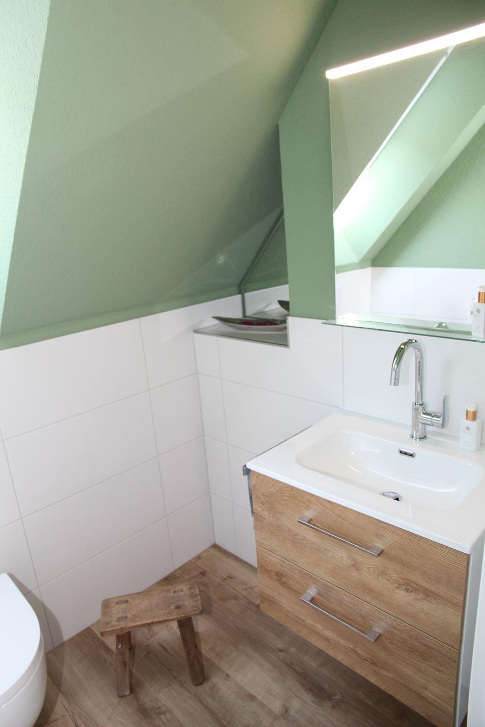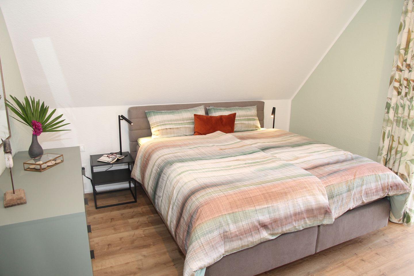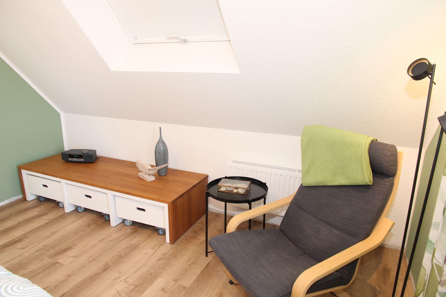 Im ausgebauten Dachgeschoss befindet sich das zweite Schlafzimmer mit einem weiteren Boxspringbett 160 x 200cm (einzelne Matratzen mit durchgehendem Topp) sowie einem Lesesessel. Auch gibt es hier ein separates WC mit Waschbecken.