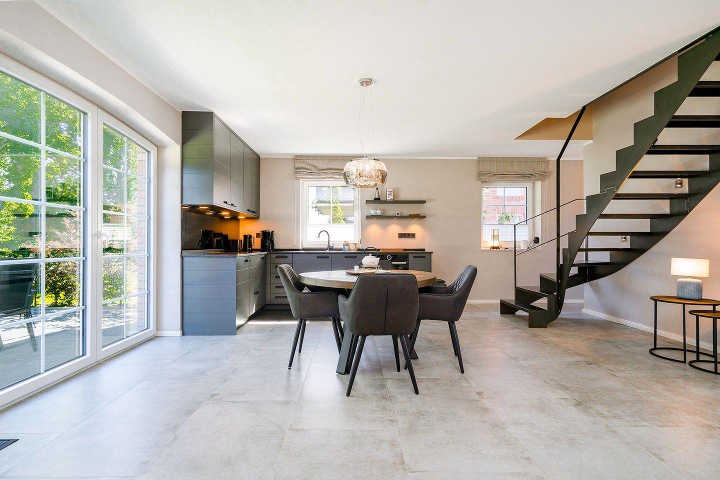 Die behagliche Unterkunft besticht durch ihr offenes Raumkonzept, das eine offene Küche hervorhebt, die zum Wohnzimmer hin geöffnet ist. Hier können Sie köstliche Mahlzeiten zubereiten und gemütliche Abende am runden Esstisch mit Sielblick genießen. Die voll ausgestattete Küche verfügt über moderne Annehmlichkeiten, darunter Induktionsherd, Backofen, Spülmaschine, Kaffeemaschine, Wasserkocher, Toaster, Mixer sowie einen Kühlschrank mit Gefrierfach, um Ihren Aufenthalt so angenehm wie möglich zu gestalten.