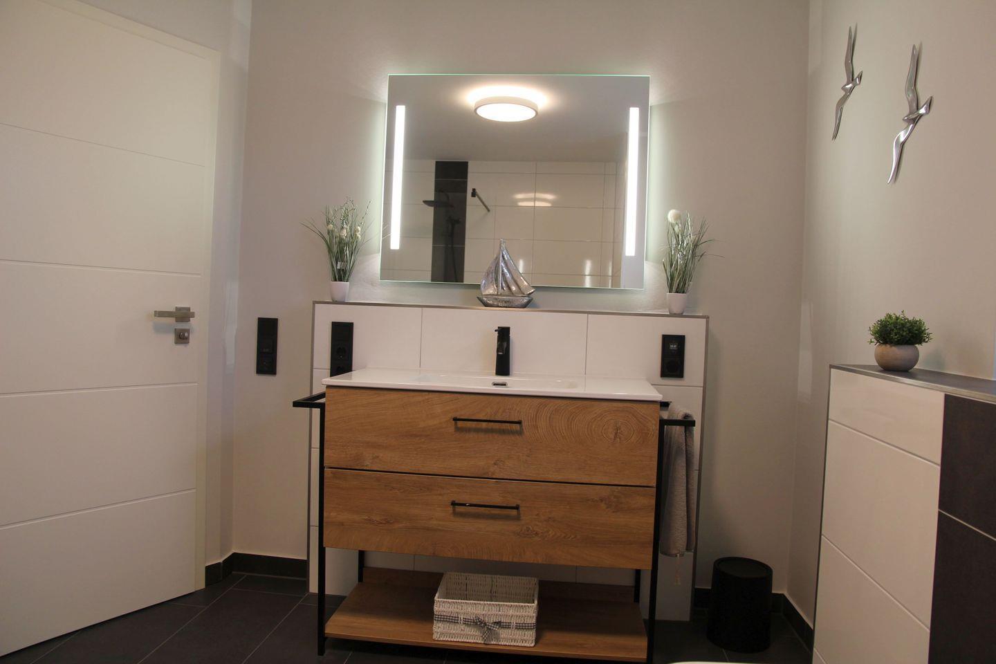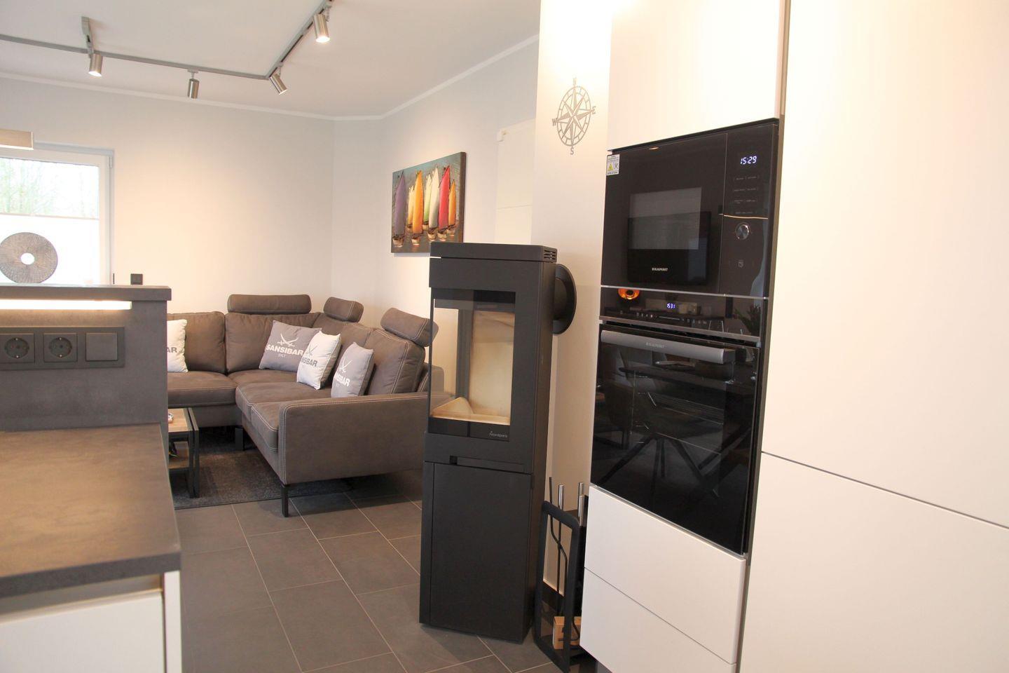 Im Erdgeschoss erwartet Sie eine super ausgestattete moderne Küche (u.a. Induktionskochfeld, Backofen, Mikrowelle, Spülmaschine, Nespresso-Kapselmaschine, Kaffeemaschine, Wasserkocher, Toaster, Eierkocher, Pürierstab, Mixer) mit angrenzendem Ess- und Wohnbereich mit Kamin und TV. Ebenfalls befindet sich im Erdgeschoss ein großzügiges Bad mit ebenerdiger Dusche, Handtuchheizkörper, Radio und Fön. Ein Abstellraum mit Waschtrockner und diversen Haushaltshelfern (Wäscheständer, Bügeleisen, Bügelbrett etc.) vollendet das Erdgeschoss.