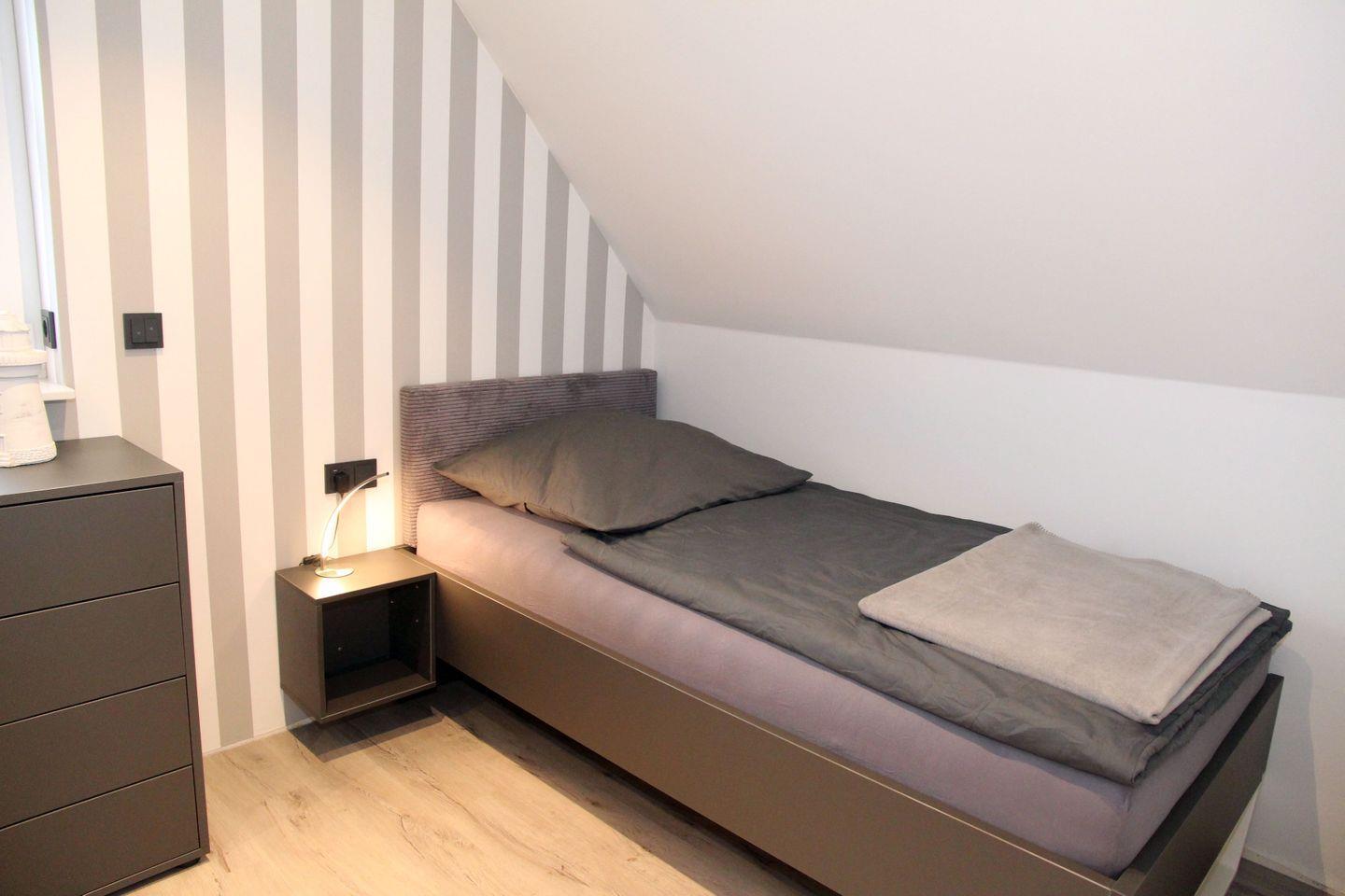 Im Obergeschoss befinden sich die beiden Schlafräume und ein weiteres Bad mit Dusche und WC. Das erste Schlafzimmer hat ein Doppelbett 180x200 cm (einzelne Matratzen) mit Schrank und TV. Das zweite Schlafzimmer hat 2 Einzelbetten 90x200 cm mit Schrank und TV.