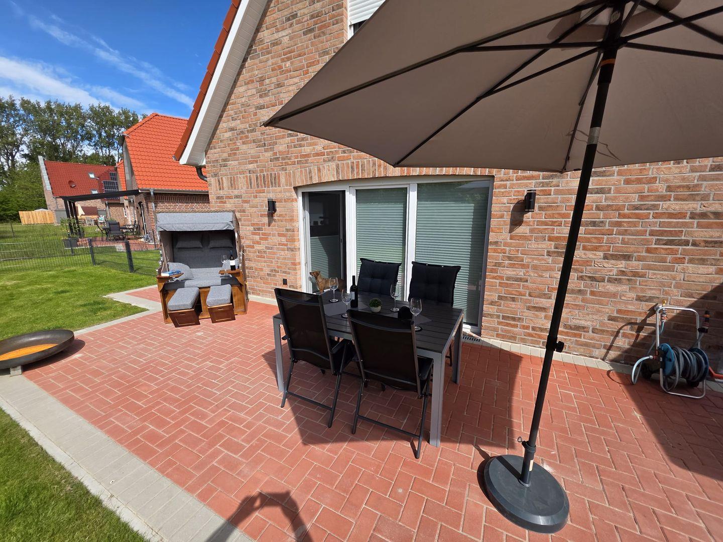 Damit Sie sich auf den Weg nach Greetsiel machen können, steht Ihnen Strom im Gartenhaus zur Verfügung, um Ihre mitgebrachten E-Bikes aufladen zu können. Um den Abend am Grill ausklingen zu lassen, steht Ihnen ein Holzkohlegrill zur Verfügung. Die Feuerschale im Garten sorgt für den perfekten Flair auf dem Wassergrundstück. Die Sonne können Sie auf der möblierten Terrasse (Überdachung folgt) oder aber auf den Gartenliegen auskosten.