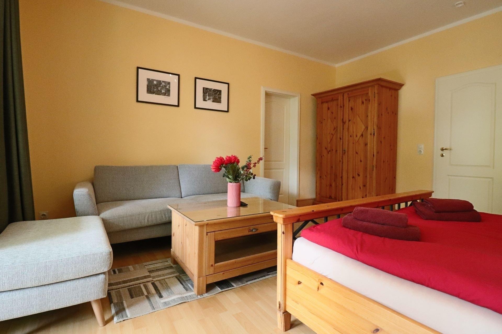 Die Ferienwohnung 5 ist für vier Personen ausgelegt. Das gemütliche Wohn-/ Schlafzimmer mit einem großem Doppelbett, einer Couch sowie einem Flachbildfernseher und Radio lädt zum gemeinsamen Verweilen und Entspannen ein. Ein über den wohnungseigenen Flur betretbares, separates Schlafzimmer ist mit einem weiteren Doppelbett ausgestattet und verzaubert durch seine Gemütlichkeit. Die über Herd, Ofen, Kühl-/ Gefrierkombination, Spülmaschine, Mikrowelle, Toaster, Kaffeemaschine und Wasserkocher verfügende Küche kann mit ihrer Sitzecke zudem als Essbereich genutzt werden. Ein über das Wohnzimmer zugänglicher Balkon fordert zum erholsamen Aufenthalt mit Blick auf die Villen der Südstadt auf und steht eigens den Gäste dieser Ferienwohnung zur Verfügung. Eine im hauseigenen Garten befindliche Terrasse für die Gäste des Hauses lädt zudem zum geselligen Beisammensitzen mit Blick ins Grüne sowie zum Grillen ein. Grillzubehör stellen wir Ihnen auf Anfrage gerne bereit!