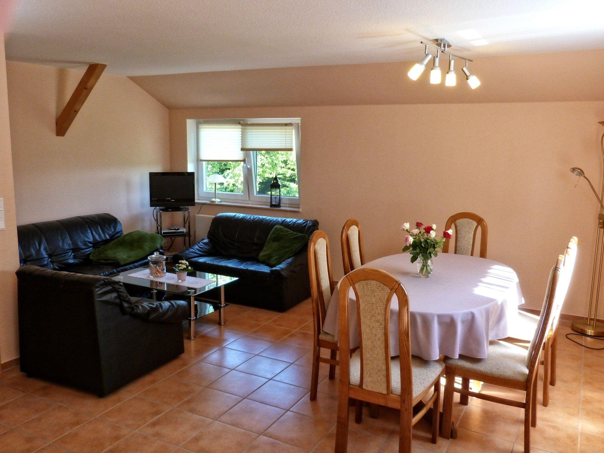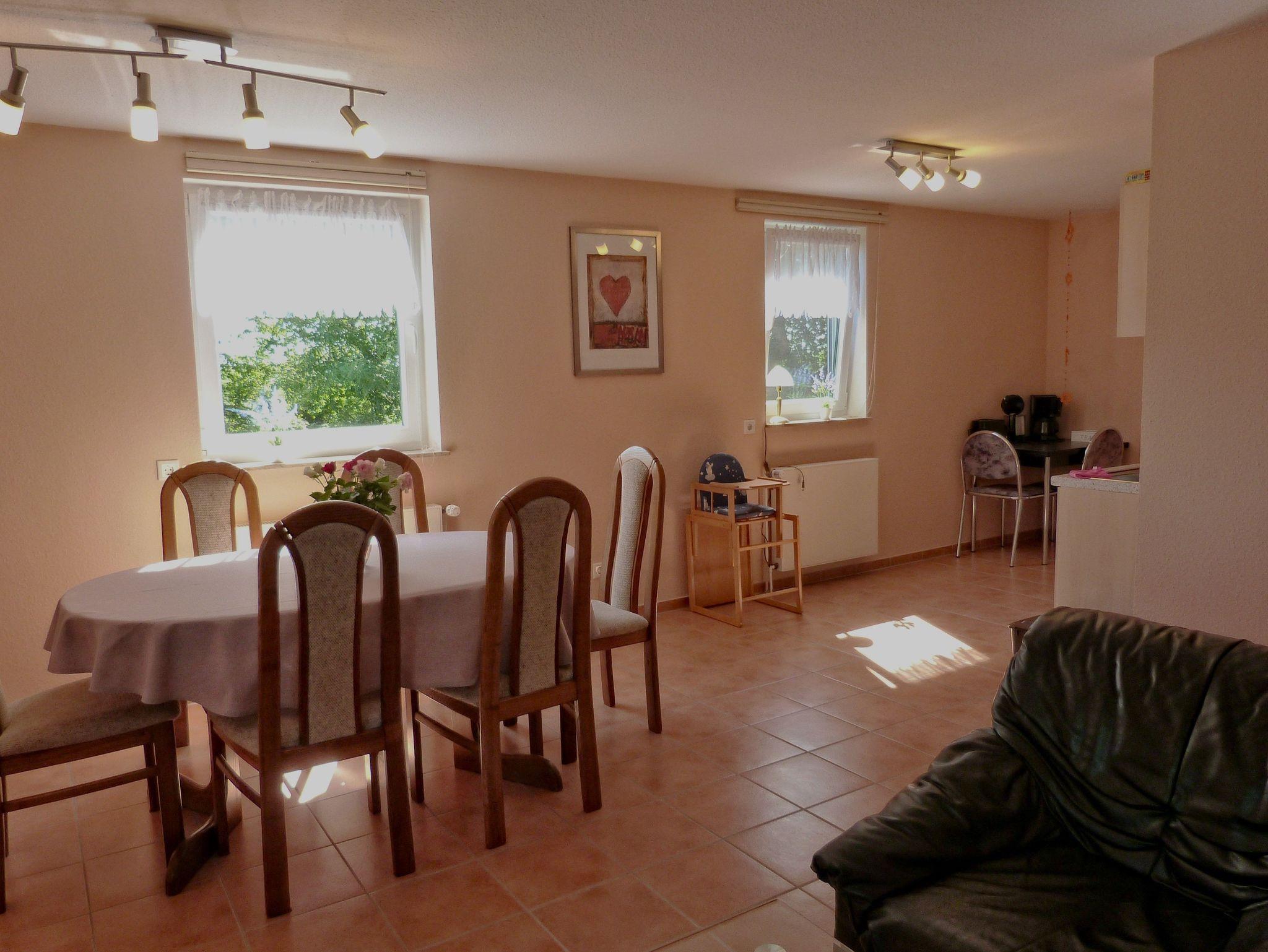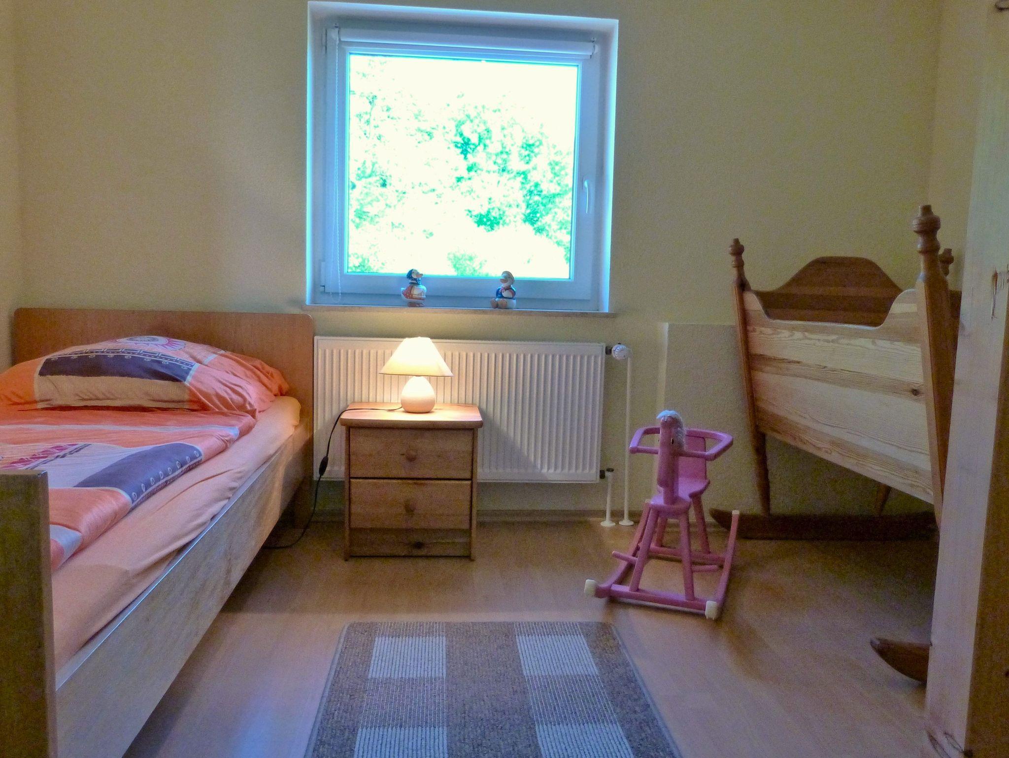 Unsere Ferienwohnung bietet ein Schlafzimmer (Doppelbett), ein Schlafzimmer (Einzel- und Ausziehbett), ein Schlafzimmer mit Einzelbett und Kinderbett (Zustellbett und Wiege sind möglich, ein Wickeltisch ist vorhanden und es gibt einen Treppenschutz) und ein großes Wohnzimmer mit offener Küche sowie Dusche/WC.