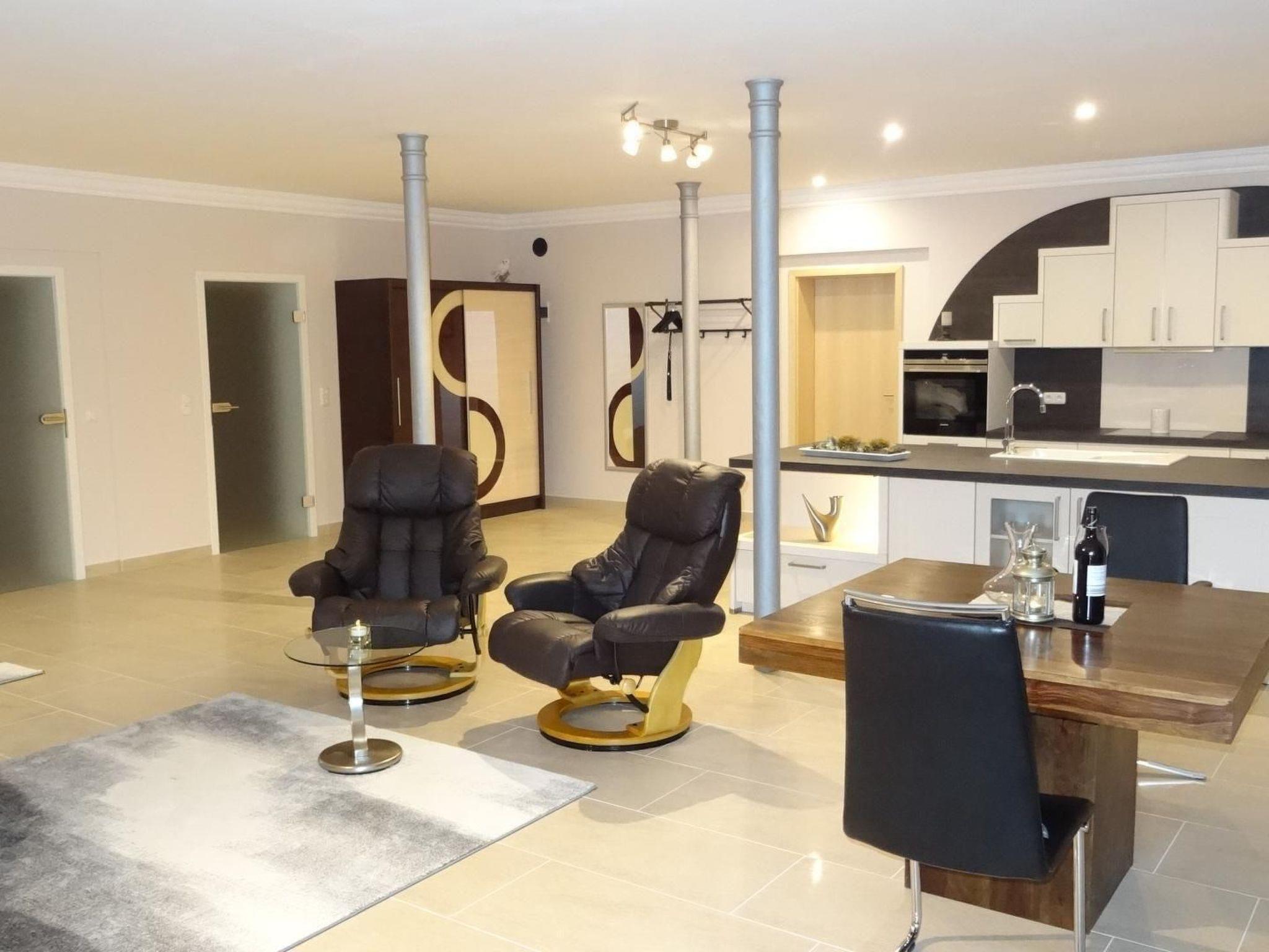 The holiday flat is on the ground floor and offers 120 m² of space for the discerning guest. Upon entering the flat, you enter a large room with underfloor heating and floor-to-ceiling windows facing the courtyard. A separate entrance door is at ground level. The spacious entrance area has a fireplace. In the living area you will find a high-quality fitted kitchen, which is fully equipped. Take a seat at the large, square table with four leather swivel armchairs. There are two leather armchairs with footstools for watching TV and relaxing. You can place small items on the small round glass table. The television is mounted on the wall. The Internet HIFI system is located under the 65-inch television. A box-spring bed is also available in this room. A box-spring bed (1.80 m x 2.00 m) and a large wardrobe with plenty of wooden hangers await you in the bedroom. . The bedroom is also equipped with underfloor heating. The bathroom with shower also has underfloor heating, a large mirror, make-up mirror with sevenfold magnification, a hairdryer and washing lotion as well as a wide washbasin, an open rain shower and a washing machine. White towels and white floor mats are provided. An internet connection is also available for you.
