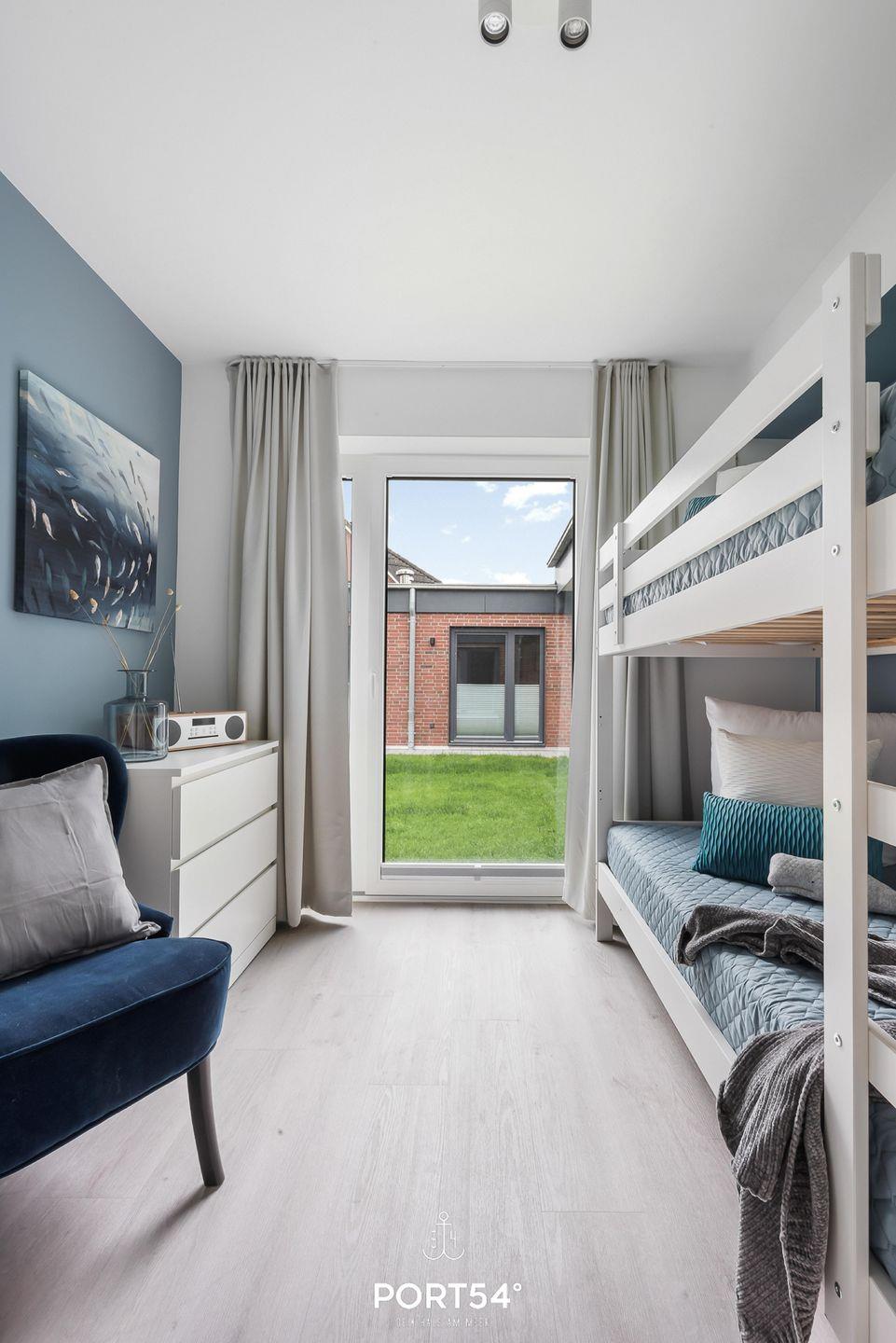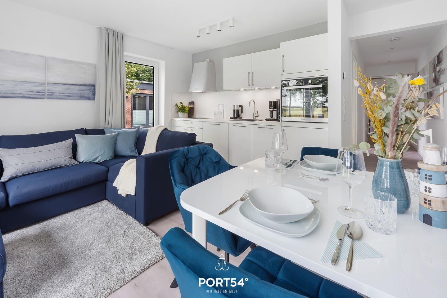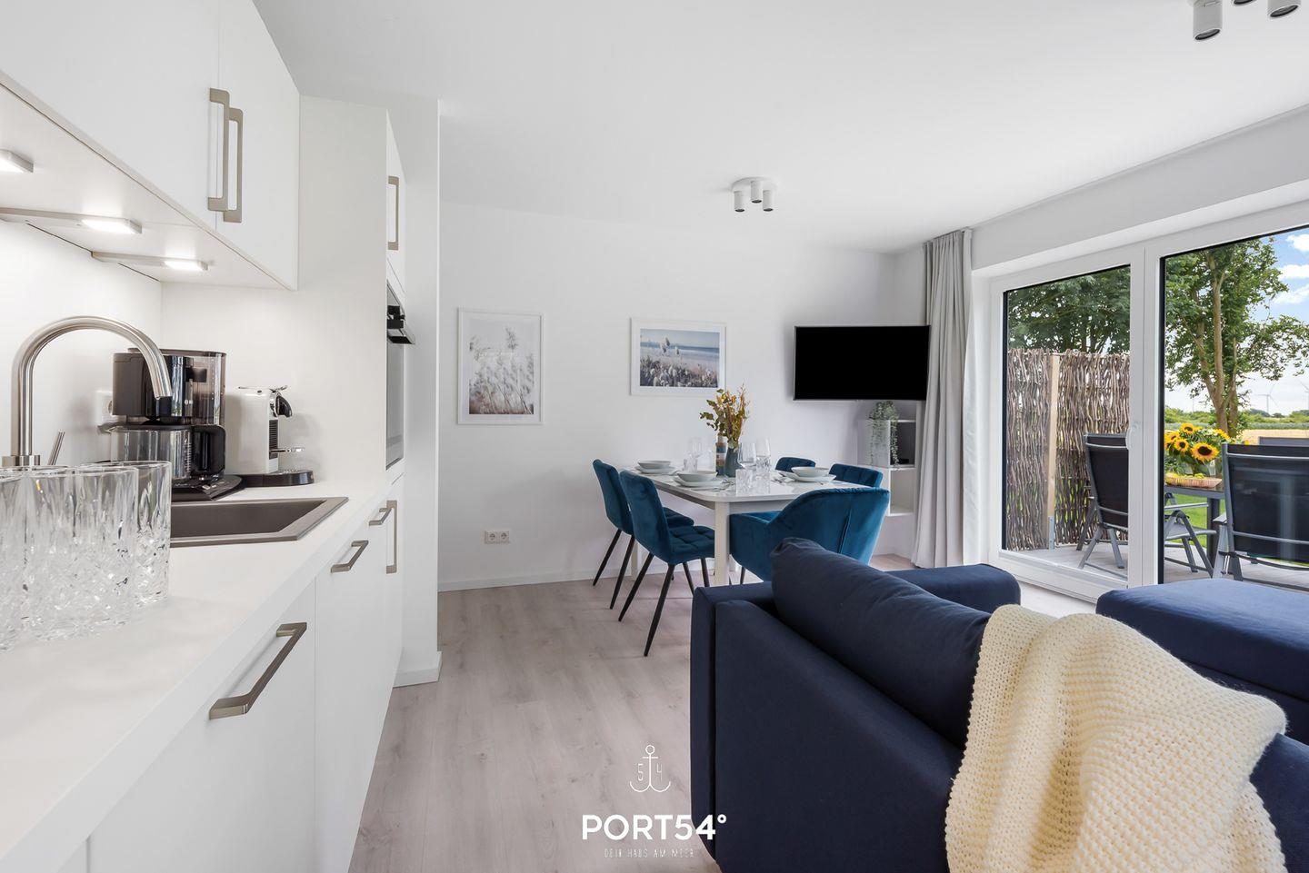 In dem geräumigen Wohnzimmer mit offener Küche können Sie es sich gemütlich machen. Die Küche ist modern und voll ausgestattet, sodass Sie hier wunderbar Kochen können. Auf der angrenzenden Sonnenterrasse mit einem Gemeinschaftsgarten können Sie herrliche Stunden an der frischen Nordseeluft verbringen. Ein Elektrogrill steht Ihnen für gesellige