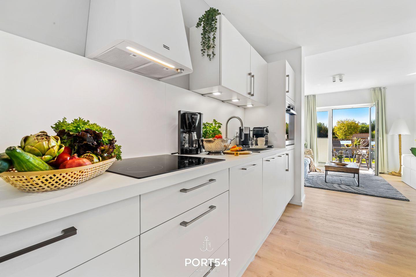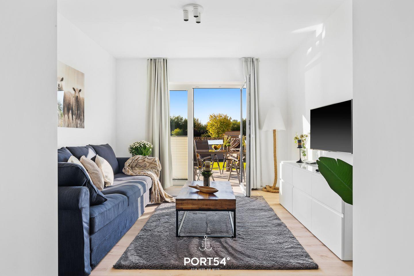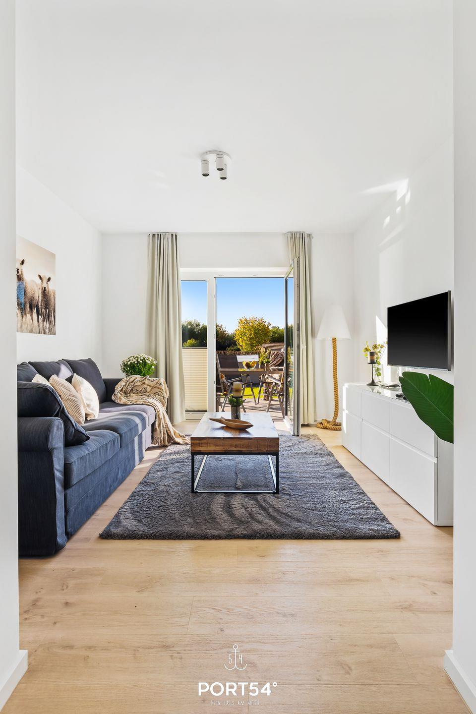 Im geräumigen Wohnzimmer können Sie es sich gemütlich machen. Die Küche ist modern und voll ausgestattet, sodass Sie hier wunderbar gemeinsam kochen können. Das Schlafzimmer ist hochwertig eingerichtet und verfügt über ein Doppelbett (180x200cm). Für weitere 2 Personen steht im Wohnzimmer ein gemütliches Schlafsofa zur Verfügung. Das helle Duschbad ist, wie die gesamte Wohnung, mit einer Fußbodenheizung ausgestattet und bietet Ihnen zusätzlichen Komfort. Auf der Sonnenterrasse mit einem Gemeinschaftsgarten können Sie herrliche Stunden an der frischen Nordseeluft verbringen. Für gesellige Grillabende steht Ihnen ein Elektrogrill zur Verfügung.