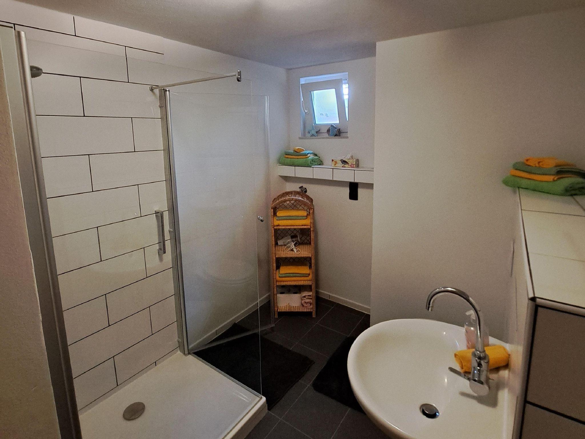 Im Badezimmer befinden sich eine ebenerdige Dusche, ein Waschbecken und eine Toilette.