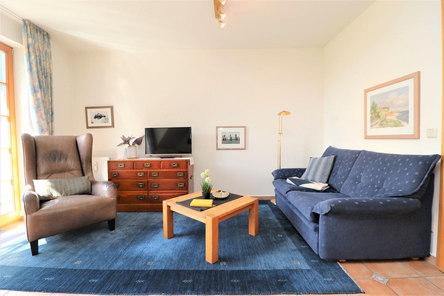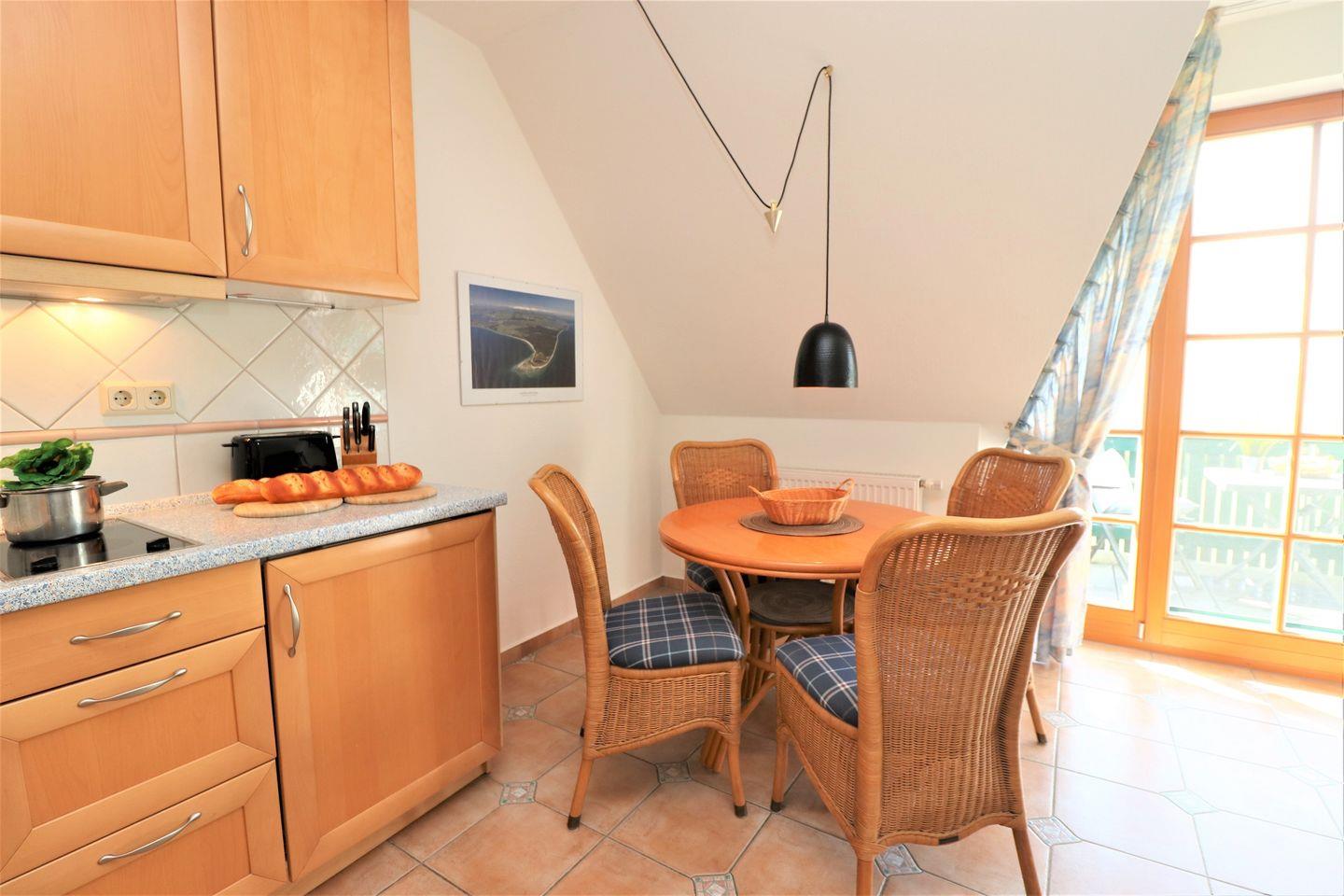 Dieses gemütliche Appartement bietet auf 40 m² Platz für maximal 2 Personen und ist der perfekte Ort für einen ruhigen und erholsamen Aufenthalt. Es verfügt über ein Wohnzimmer mit integrierter Küchenzeile, die es Ihnen ermöglicht, gemeinsam Mahlzeiten zuzubereiten. Das Schlafzimmer ist mit einem komfortablen Doppelbett ausgestattet und sorgt für erholsame Nächte. Das Bad ist mit einer Dusche und einem WC versehen. Genießen Sie entspannte Stunden auf dem Balkon, der nach Süden ausgerichtet ist und Ihnen einen wunderschönen Blick auf den Bodden bietet – ideal, um die Sonne zu genießen oder den Ausblick in aller Ruhe zu erleben. Ein Pkw-Stellplatz (Nr. 21) befindet sich direkt auf dem Grundstück der Ferienanlage, sodass Sie Ihr Fahrzeug bequem parken können. Haustiere sind nicht gestattet, und das Rauchen ist im Appartement nicht erlaubt. Während Ihres Aufenthalts steht Ihnen kostenfreies W-LAN zur Verfügung.