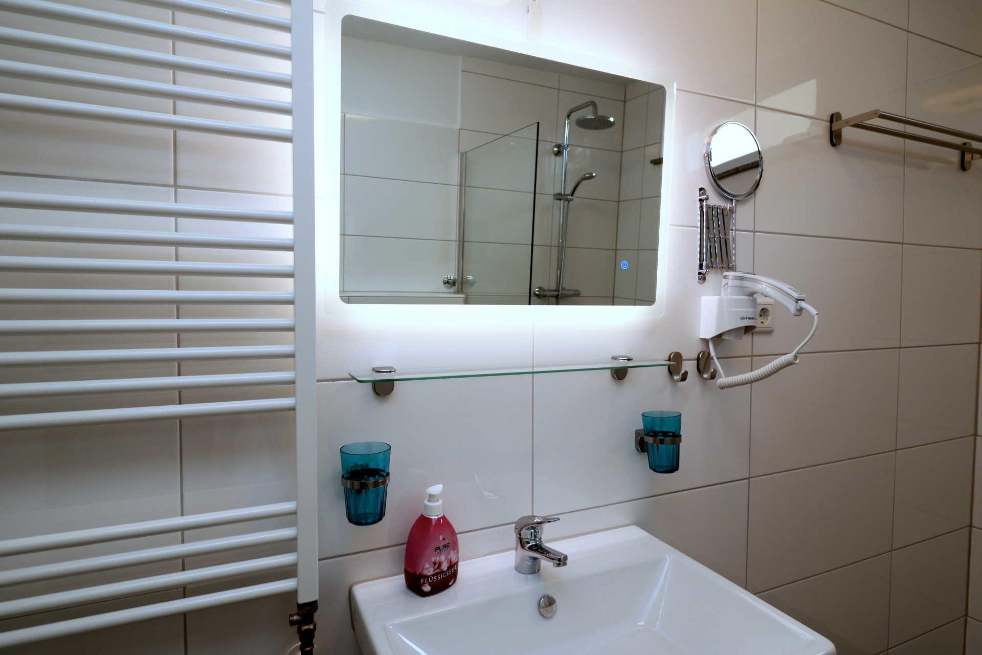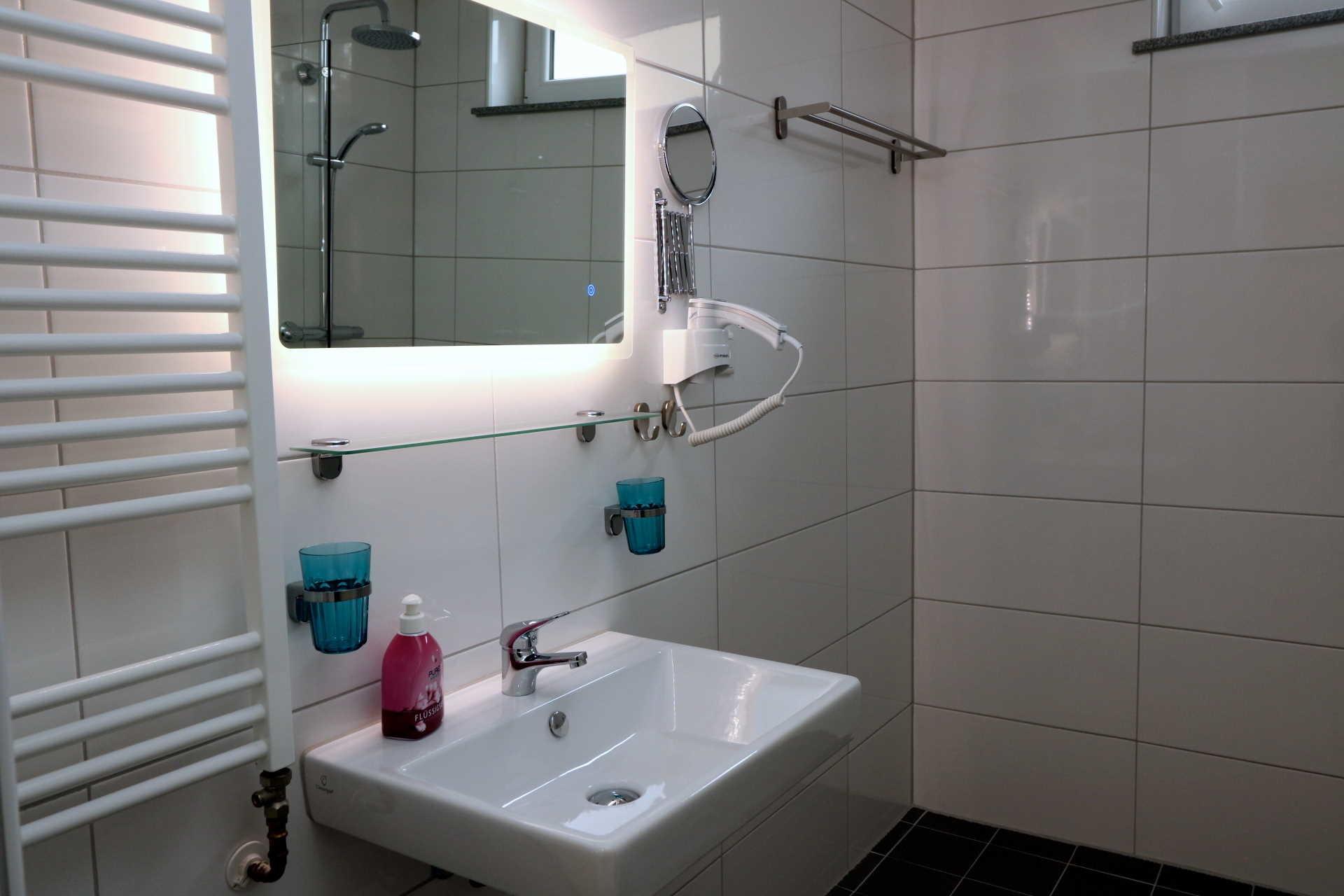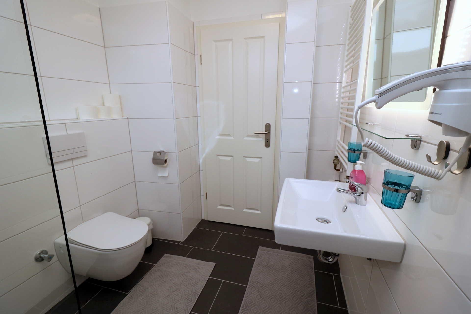 Im Duschbad gibt es eine ebenerdige Dusche, Waschtisch, Glasablage, beleuchteter Spiegel und WC. Schminkspiegel und Föhn sind ebenfalls vorhanden.