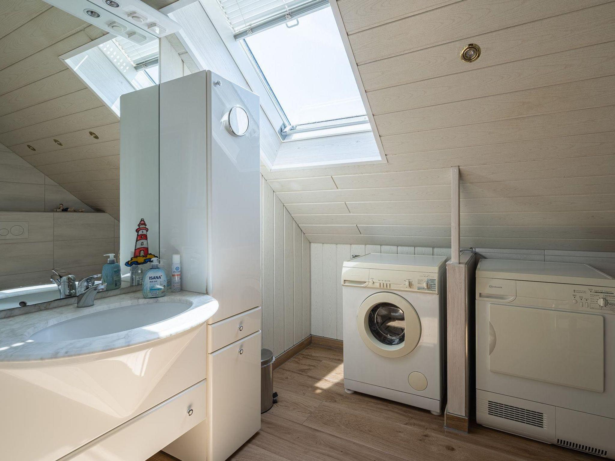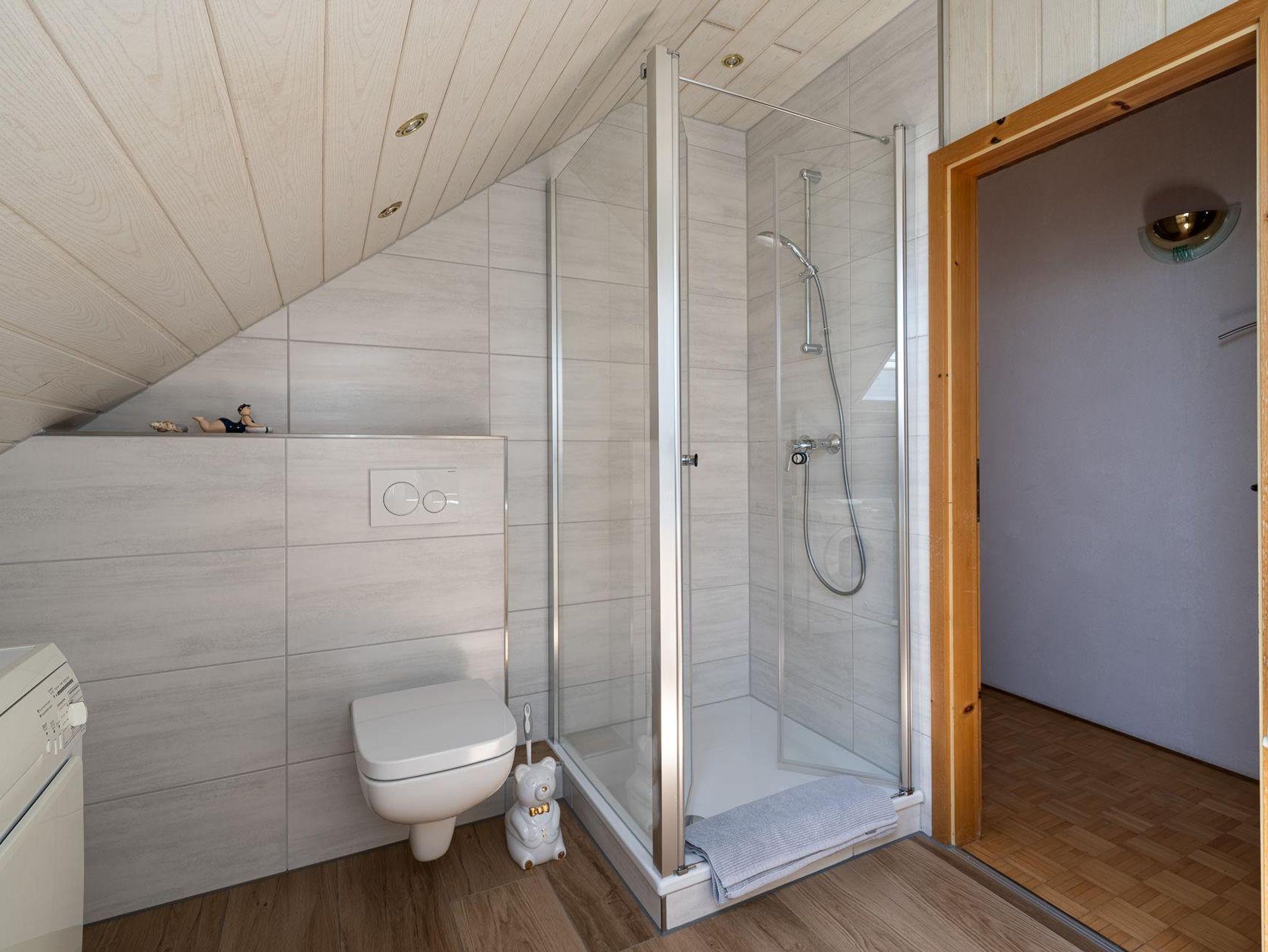 • Badezimmer mit Dusche, Waschmaschine, Kondenstrockner und Haartrockner