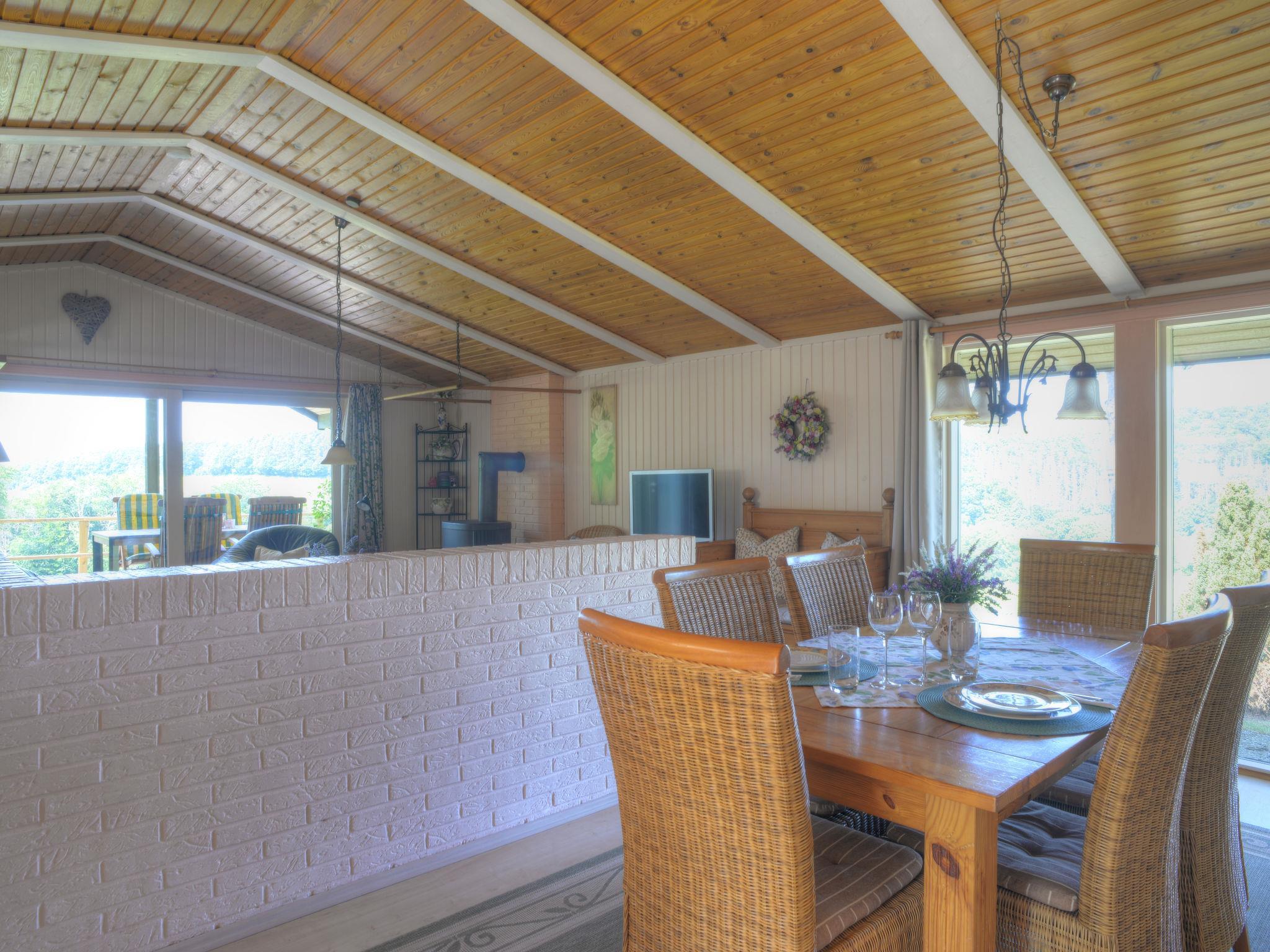 "Wiesenhütte", 4-room house 70 m2, on the ground floor. Tasteful and cosy furnishings: living/dining room with Scandinavian wood stove and satellite TV (flat screen). Exit to the terrace. 2 rooms, each room with 1 double bed. 1 children's room with 1 x 2 bunk beds (80 cm, length 190 cm). Kitchenette (oven, 4 ceramic glass hob hotplates, toaster, kettle, microwave, electric coffee machine). Shower/WC. Electric heating. Terrace roofed, patio, garden. Terrace furniture, barbecue, conservatory. Beautiful view of the countryside. Facilities: washing machine, children's high chair, baby cot (extra). Internet (WiFi, free). Parking at the house. Please note: non-smoking house. Maximum 1 pet/ dog allowed. Parking access to the holiday house by 21 steps. Bookings accepted for holiday purposes only.