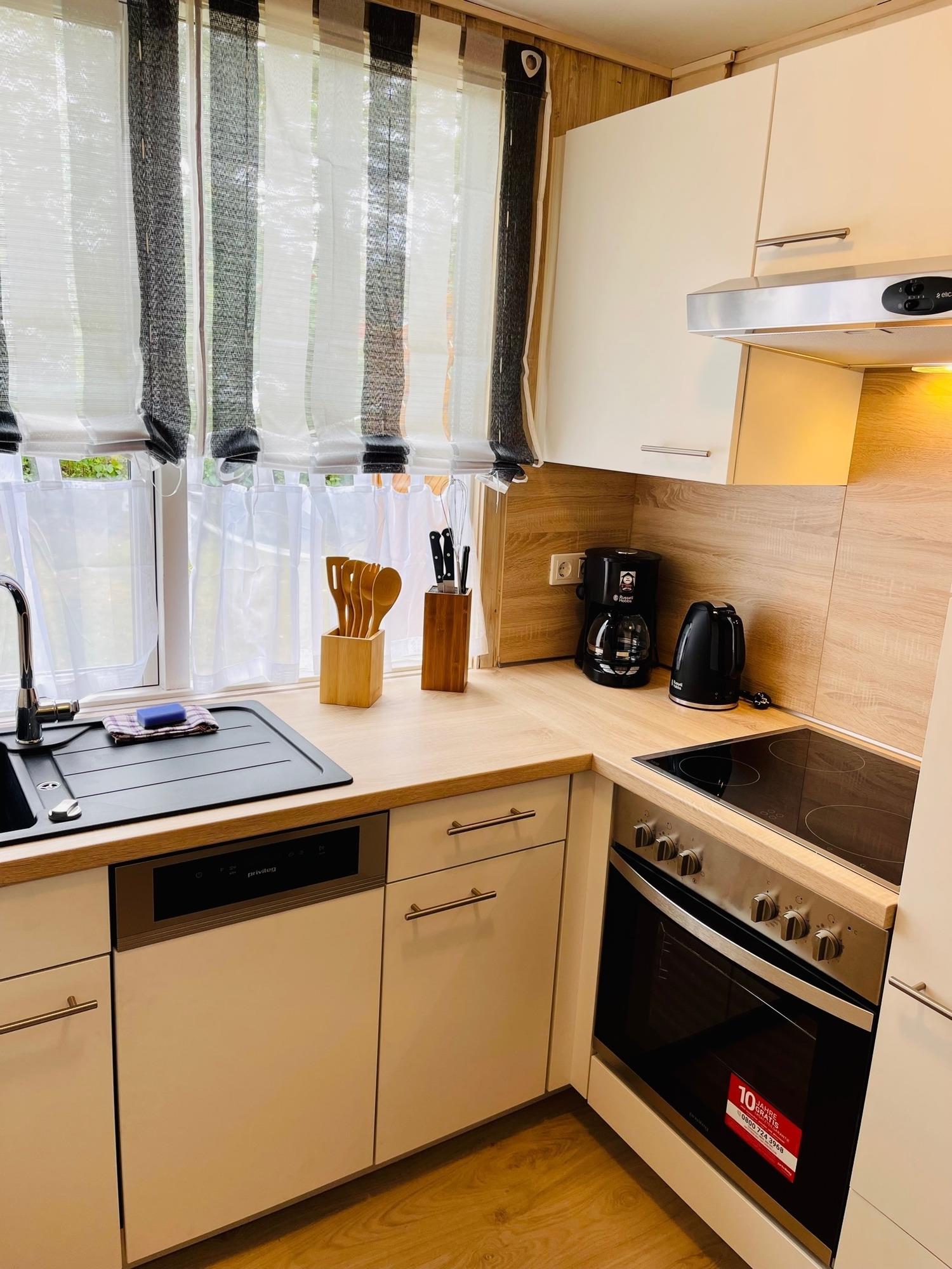 Die zum Wohnraum offene und neue Küche verfügt u.a. über einen Backofen und Ceranfeld, Geschirrspülmaschine, einen Kühlschrank mit Gefrierfach, Mikrowelle, Toaster, Wasserkocher und viele weitere wichtige Utensilien.