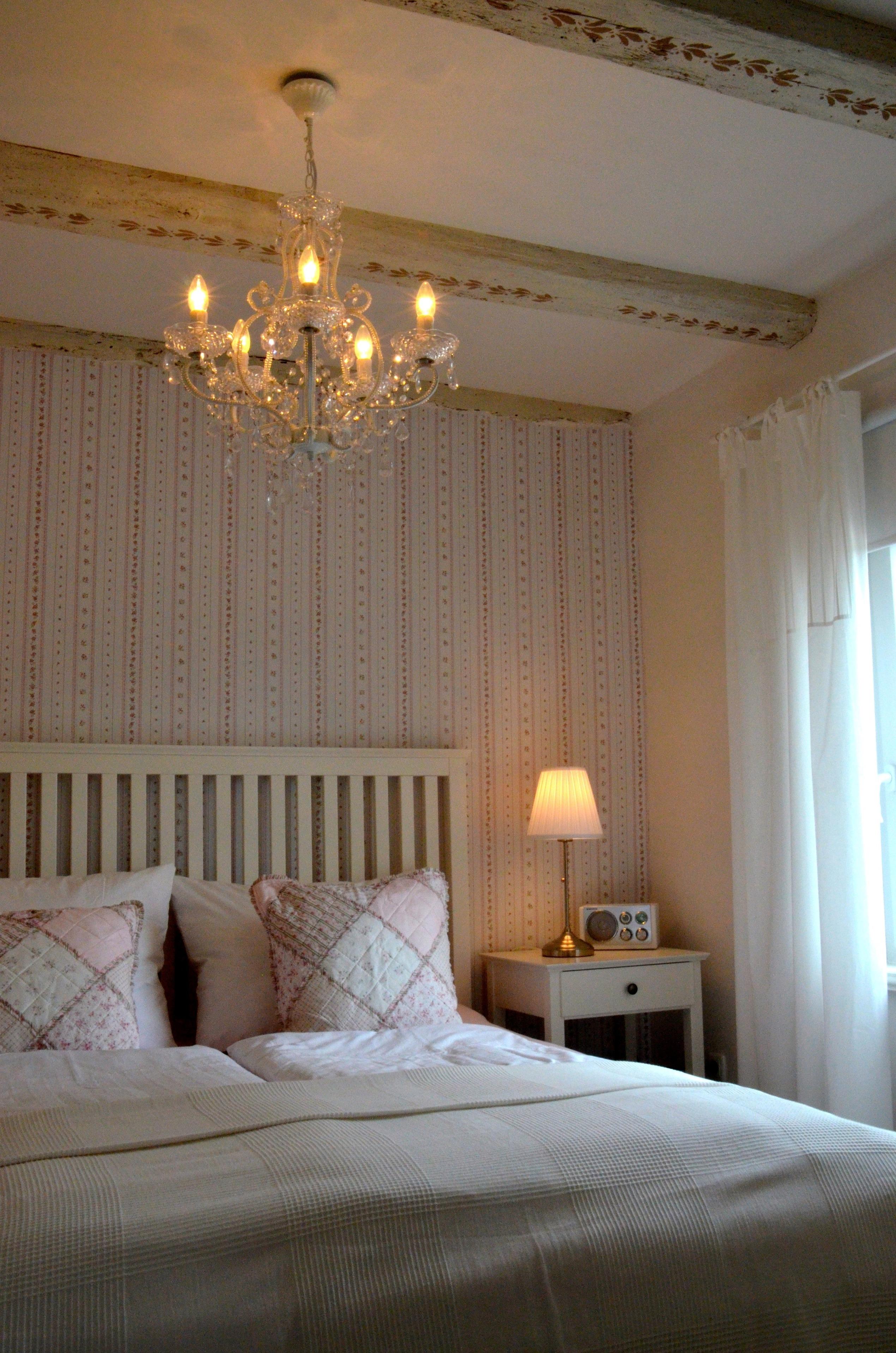 Sie schlafen in einem romantischen Schlafzimmer mit einem Boden aus geräucherten Eichendielen, einem Kronleuchter an der Decke und vielen liebevollen Details, das Bett hat eine Größe von 160 x 200 cm.