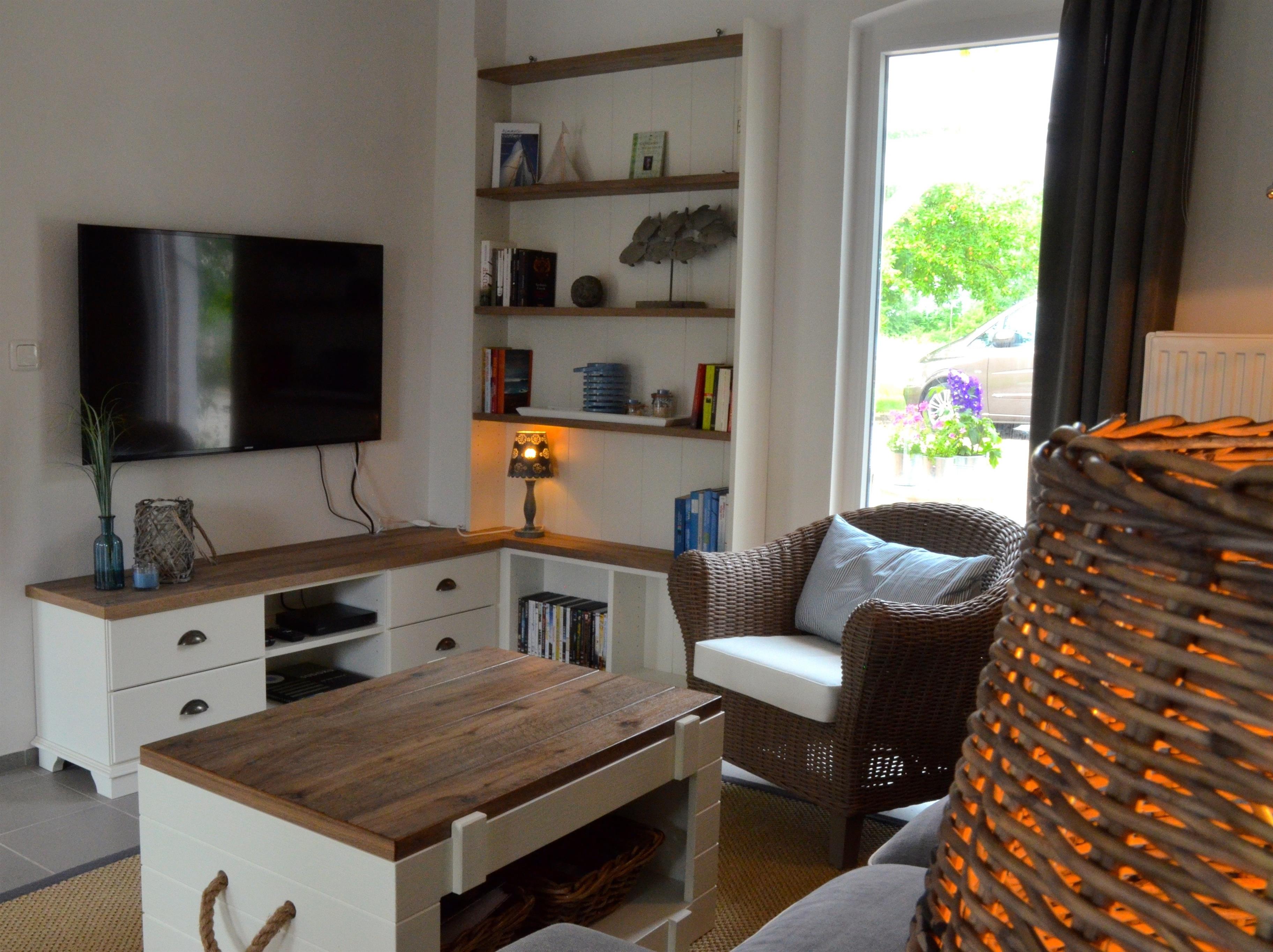 Das Wohn- und Esszimmer ist im nordisch-maritimem Flair eingerichtet.