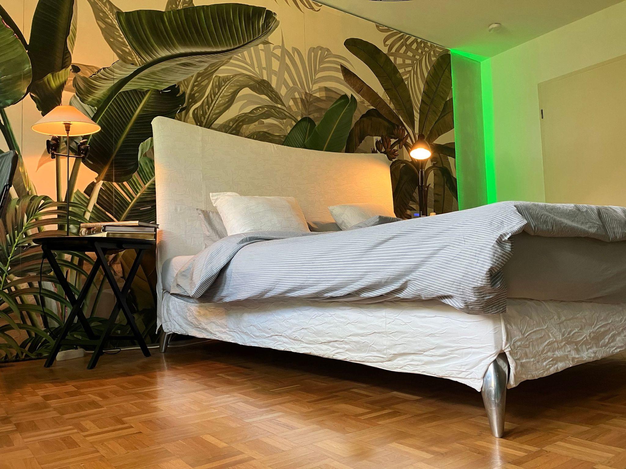 The spacious 89 sqm ground floor flat offers a 40 sqm living room, a large bedroom with Treca bed (1.80x2m) and built-in wardrobes, a perfectly equipped designer kitchen, a beautiful bathroom and two large sunny balconies. Washing machine and drying room available.