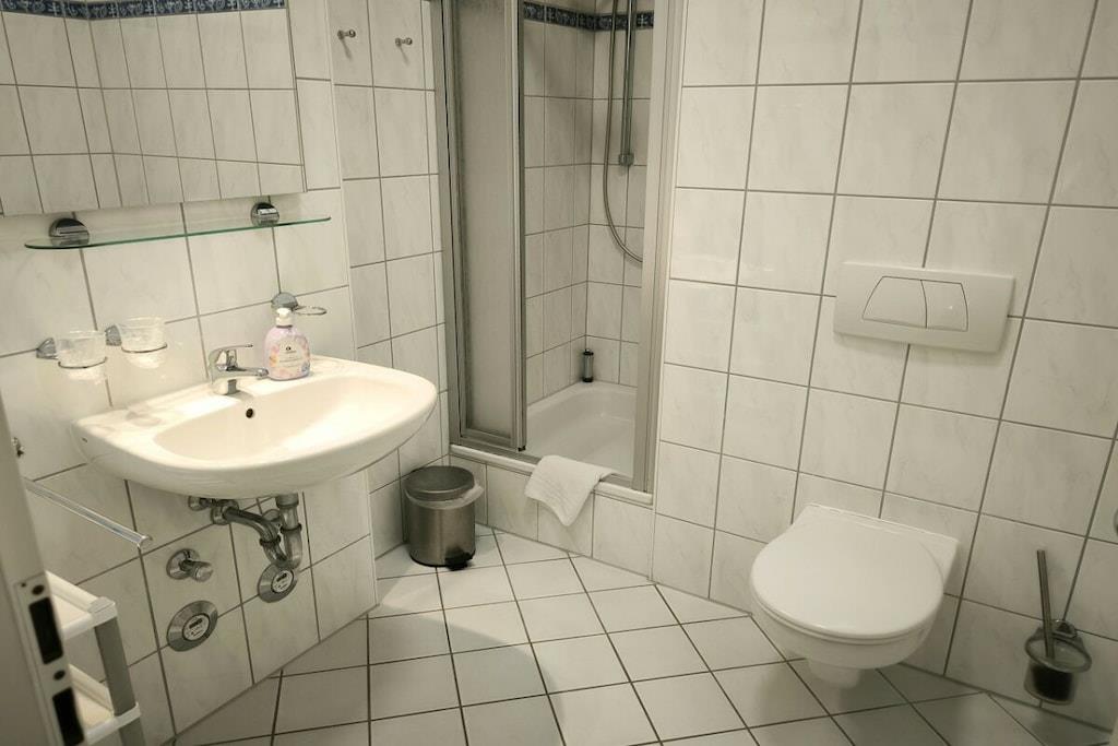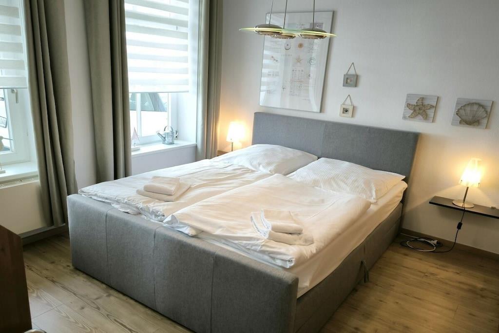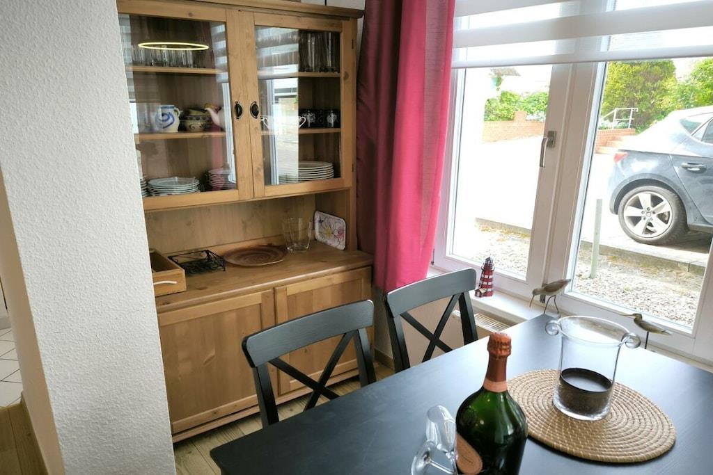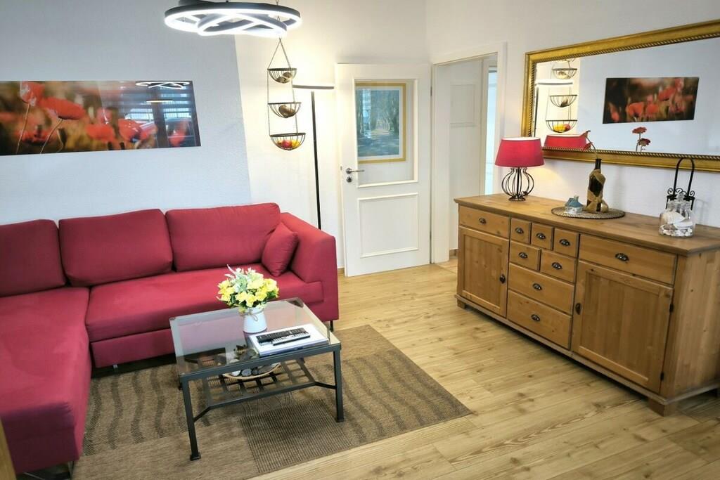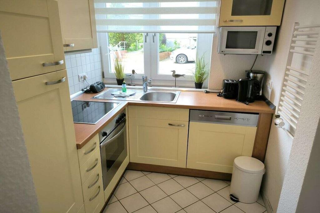 2-room holiday apartment on the ground floor for max. 4 people. Entrance area. 1 living room with a pull-out sofa bed for two people, 1 small coffee table, sideboard, TV cabinet with TV, DVD player, and radio/CD player, 1 dining table with 4 chairs. Separate from the living area, a fitted kitchen is equipped with a 4-burner ceramic hob and oven, extractor hood, large refrigerator with freezer compartment, sink, dishwasher, microwave, toaster, coffee maker, kettle, egg cooker, blender, and various kitchen utensils. 1 bedroom with a rattan bed (180 x 200 cm) and a large wardrobe, shoe cabinet, full-length mirror, and a chest of drawers with a fold-out changing table and alarm clock. 1 bathroom with shower, toilet, and hairdryer. Free Wi-Fi.