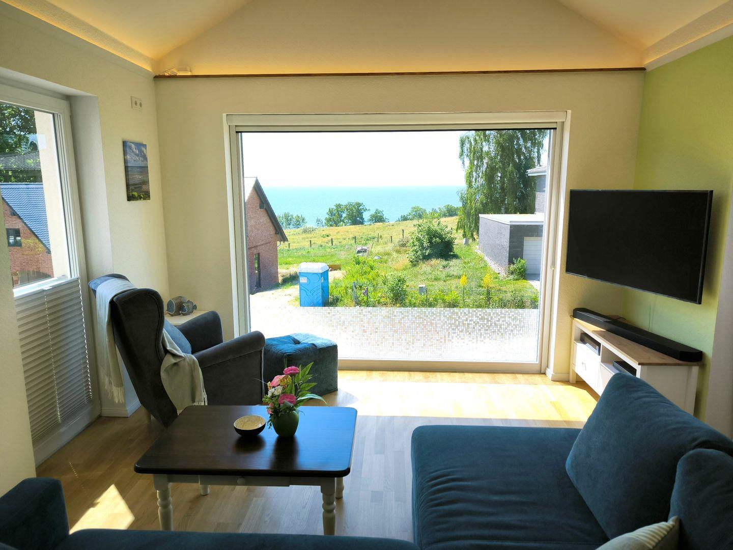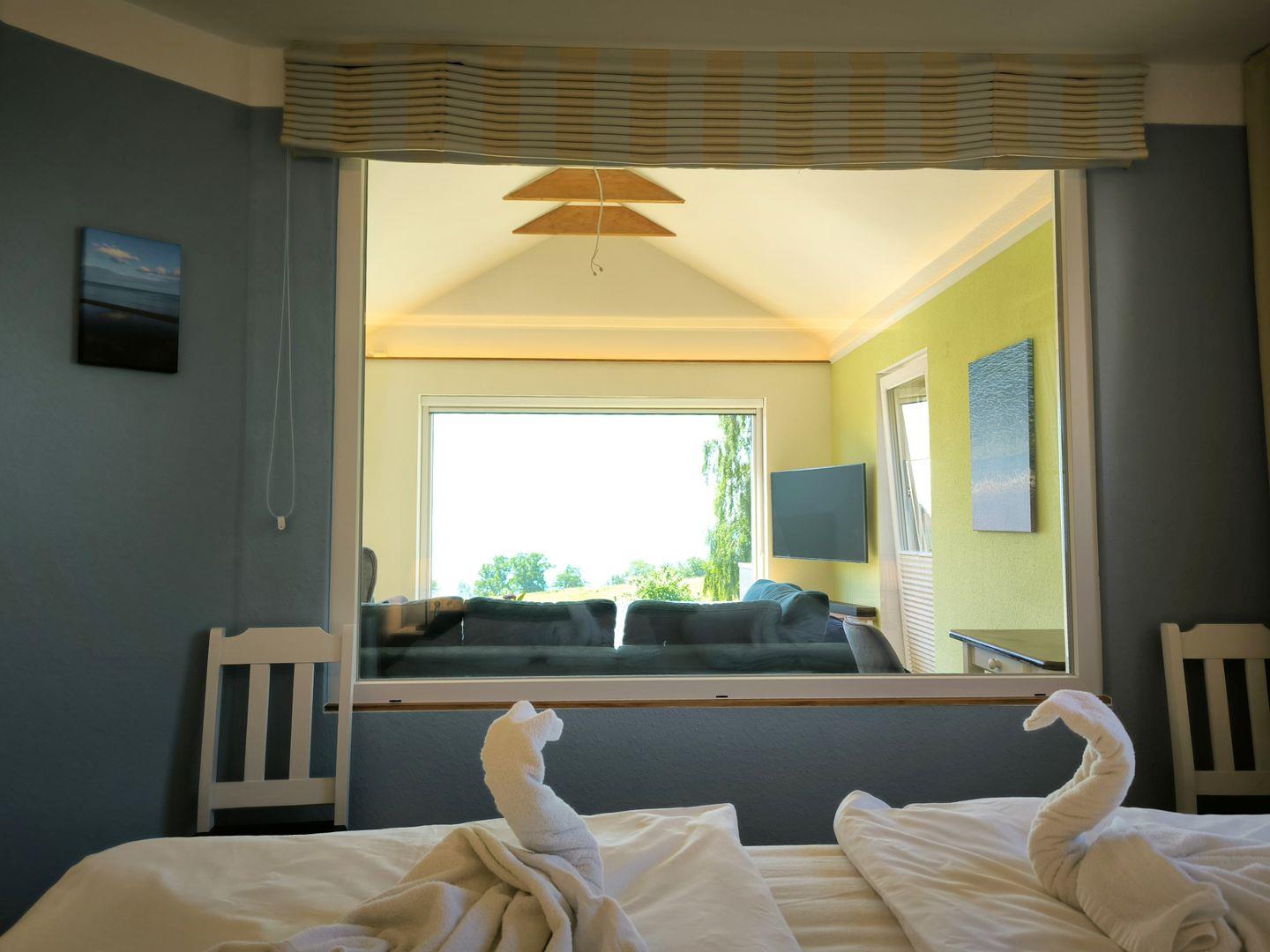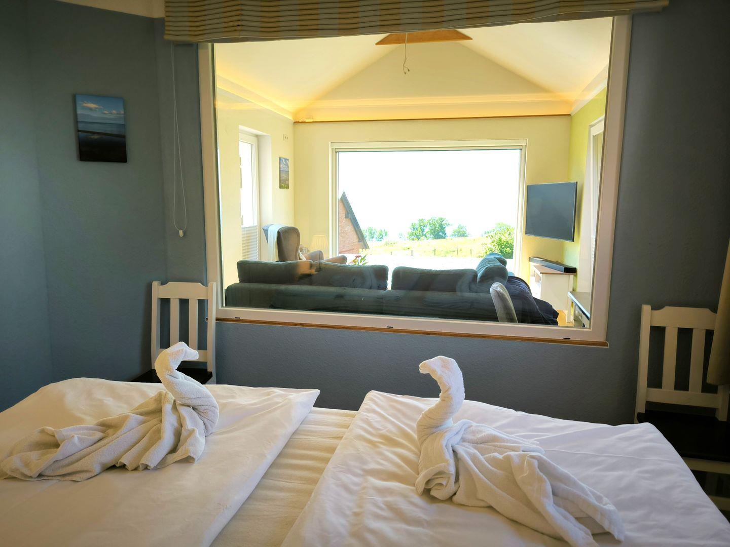 vom Schlafzimmer Meerblick durch innenliegendes Fenster zum Wohnzimmer