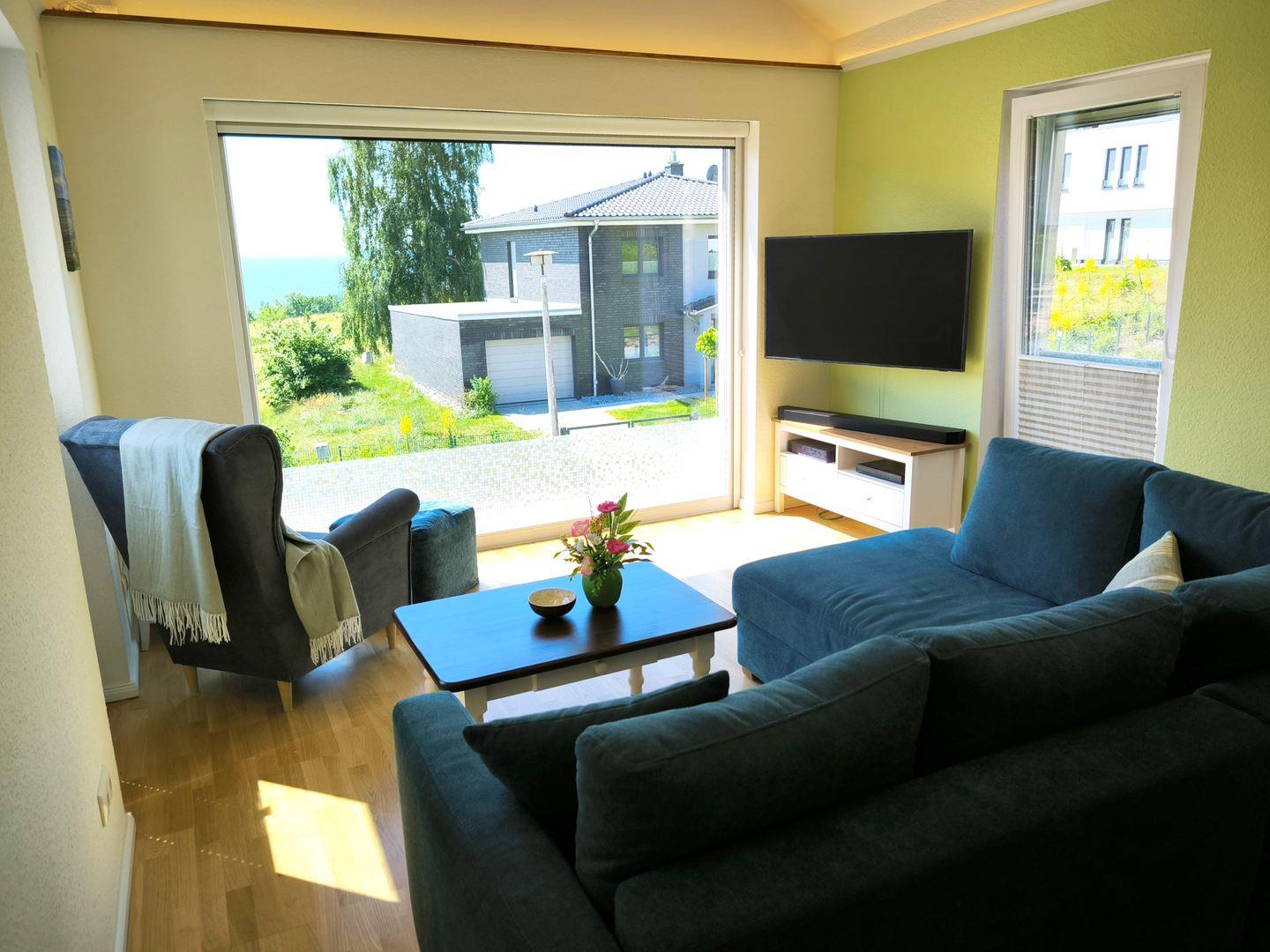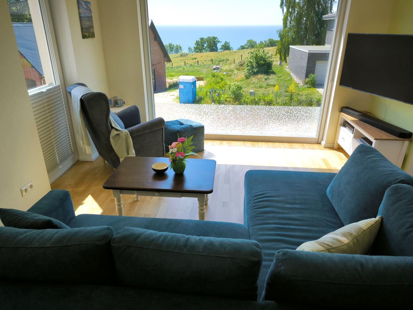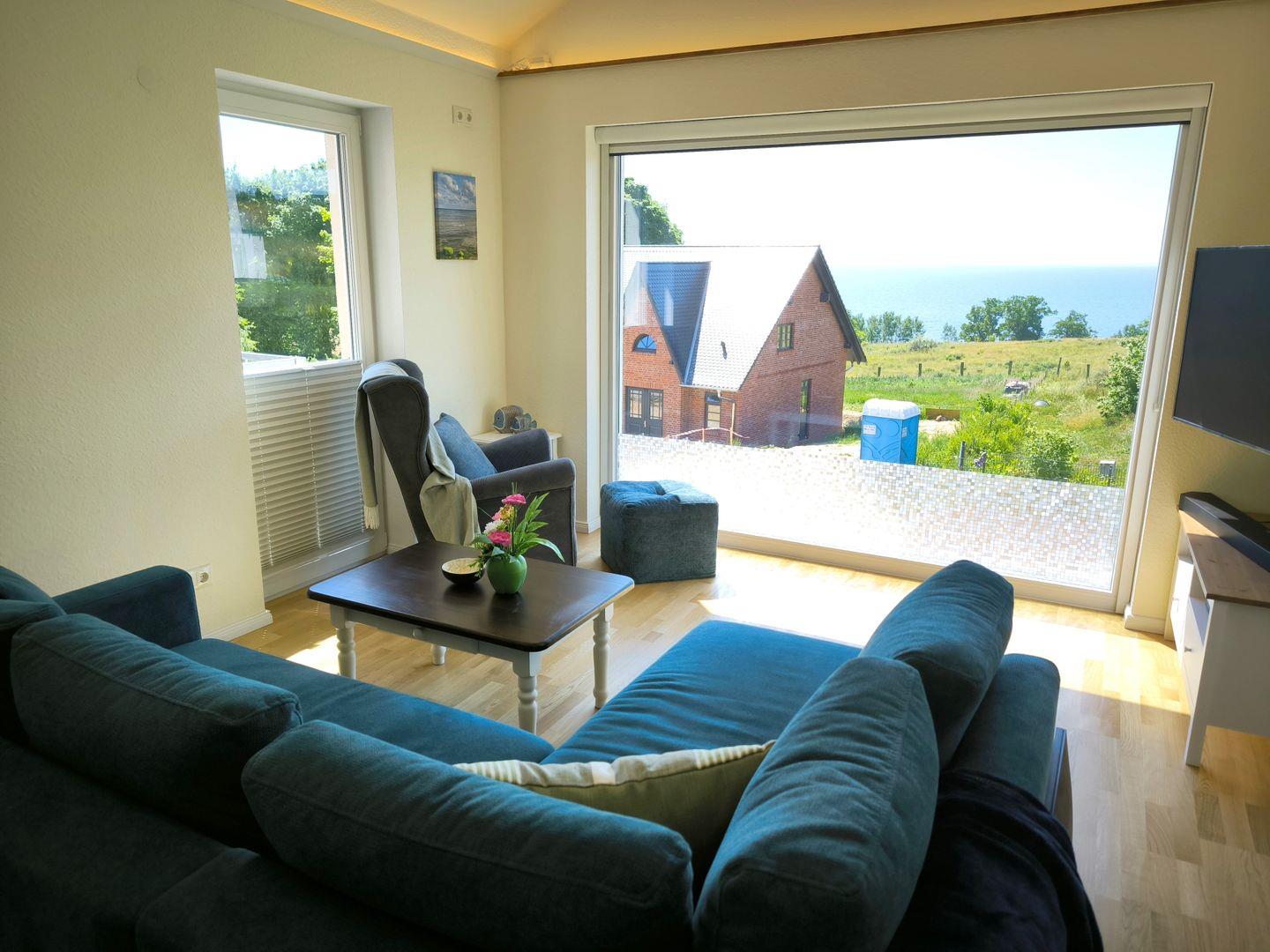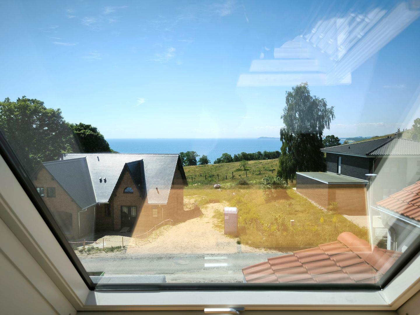 vom Schlafzimmer Meerblick durch innenliegendes Fenster zum Wohnzimmer
