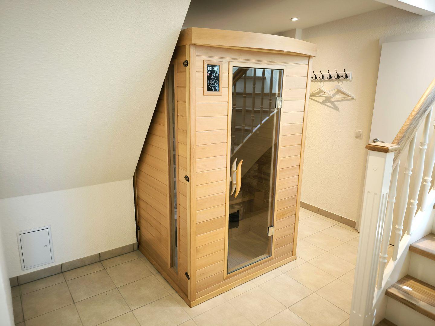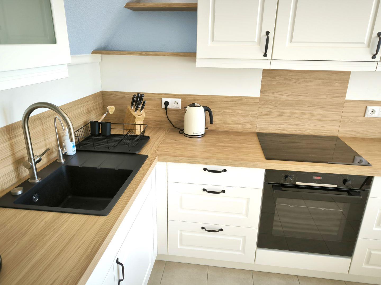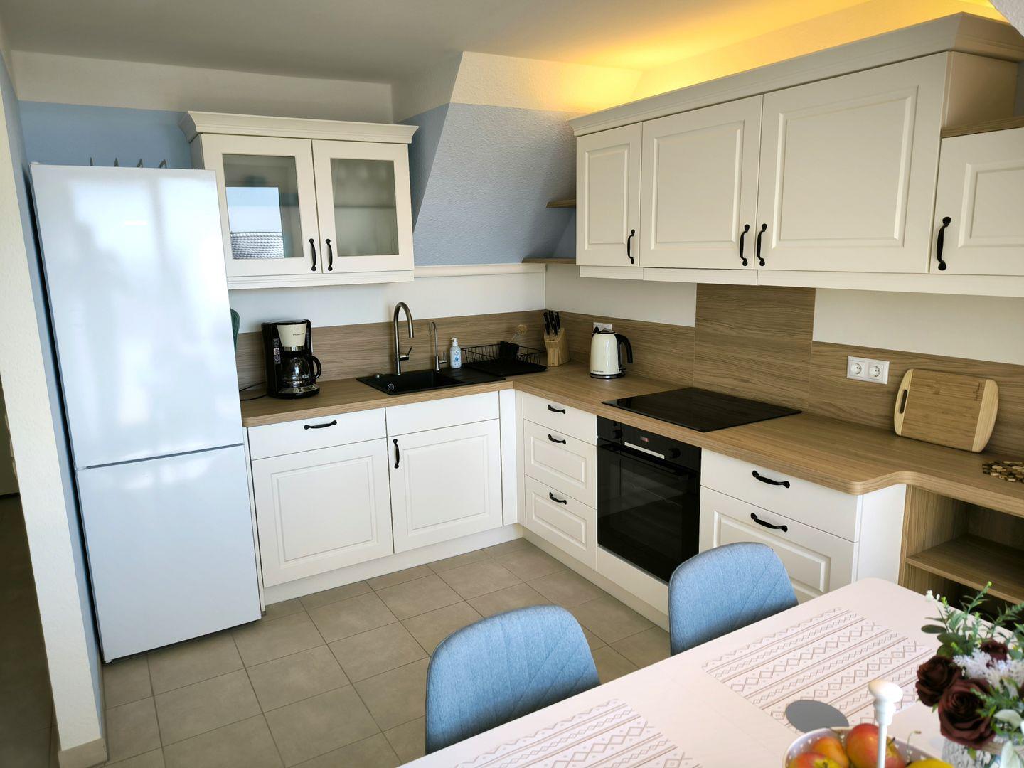 große Küche mit Induktionskochfeld, Backofen, großer Kühl- Gefrierkombination, Geschirrspüler, Toaster, Kaffeemaschine, Wasserkocher und hochwertigen Küchenutensilien, Osmose-Trinkwasser-Filteranlage